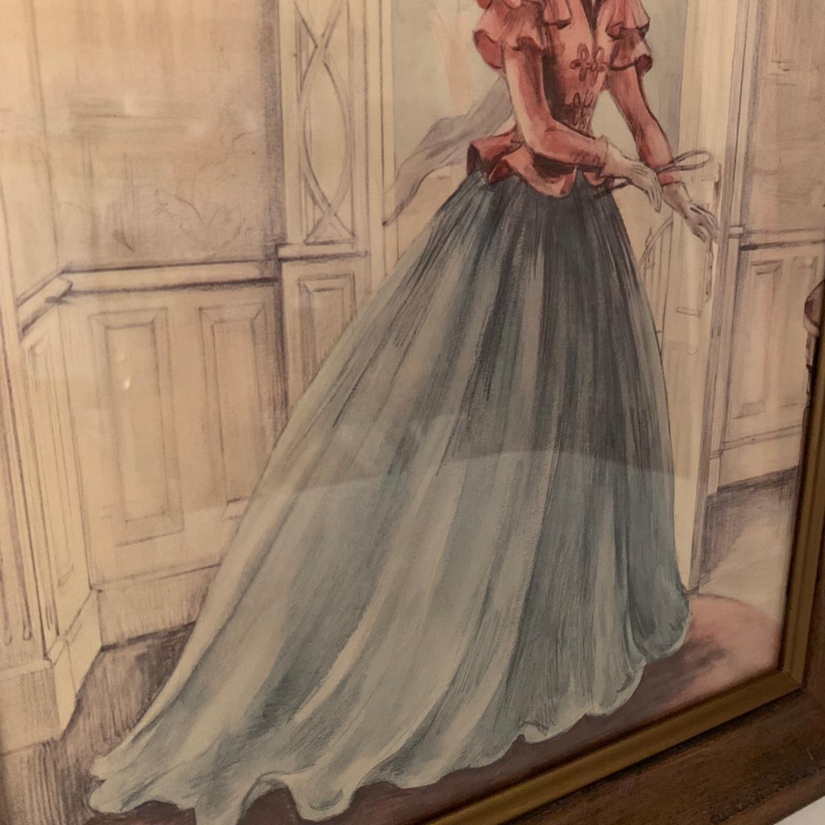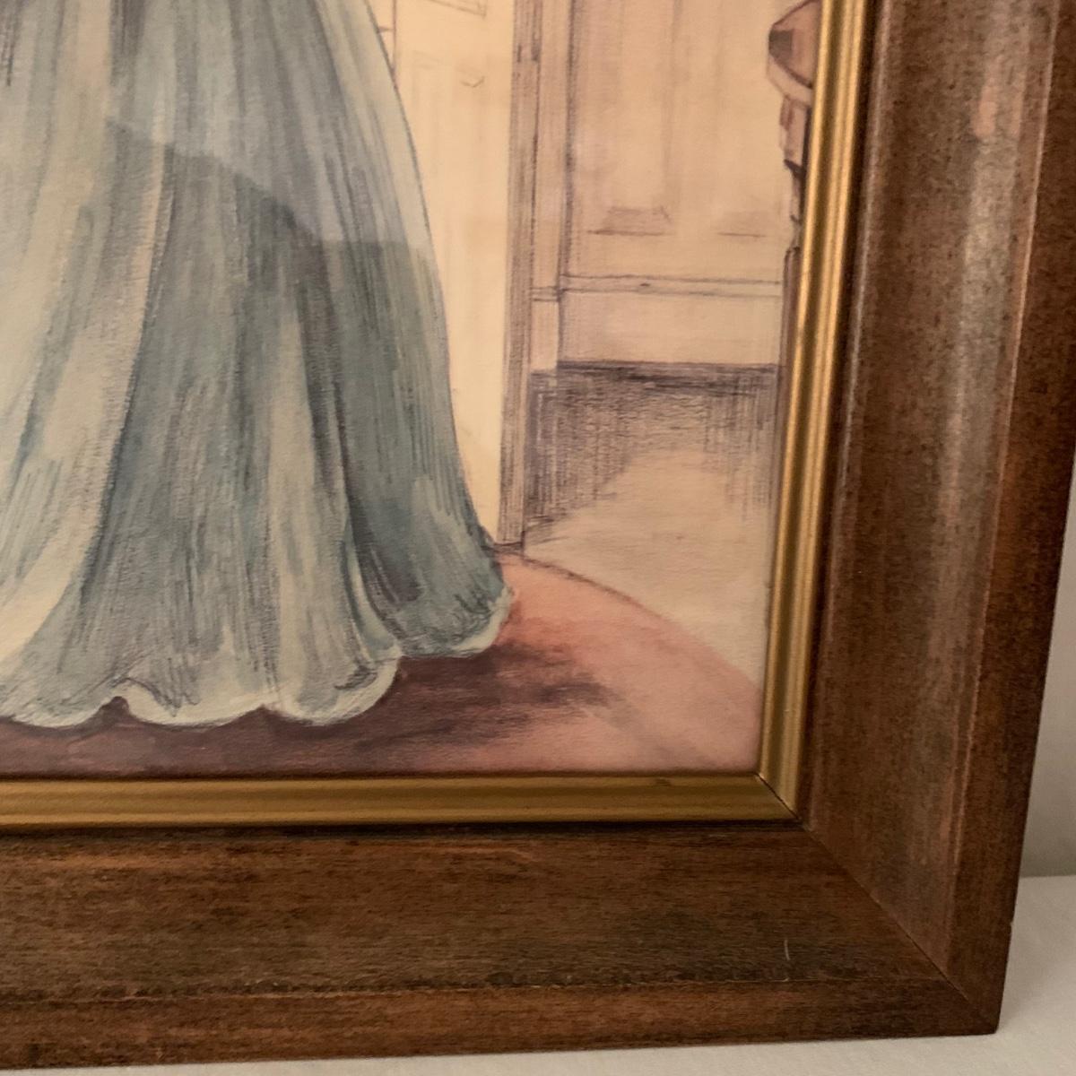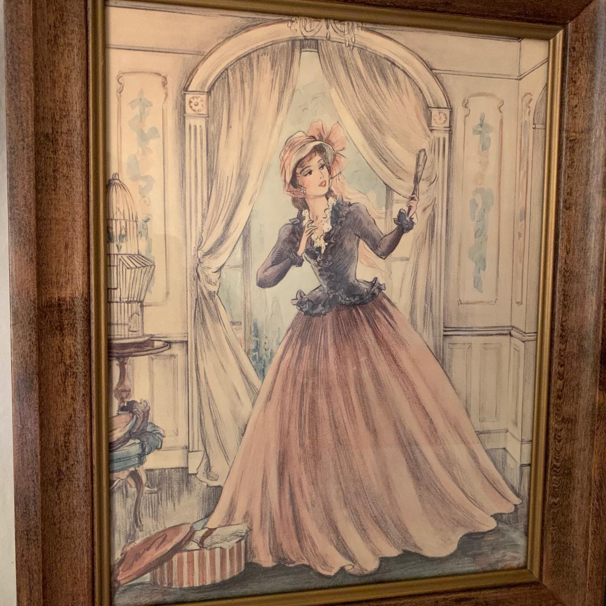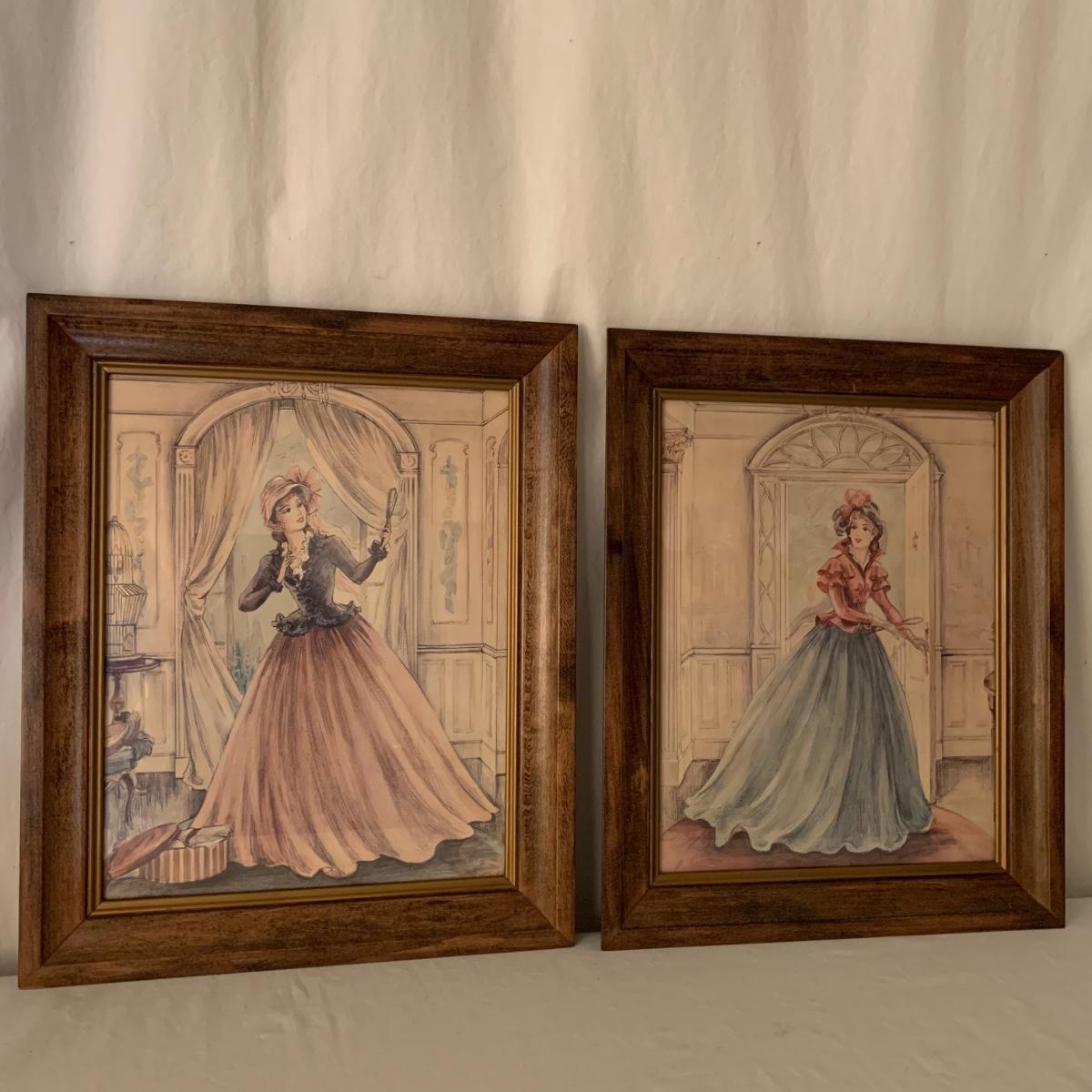 Two framed art prints from Peter Watson Studio featuring ladies in Victorian fashion. The frames are wood with a gold-painted inner border. They each measure 14” x 17”. The prints and frames are in good condition. The paper on the back of the frames is a bit torn. The prints are behind glass. Shipping available.