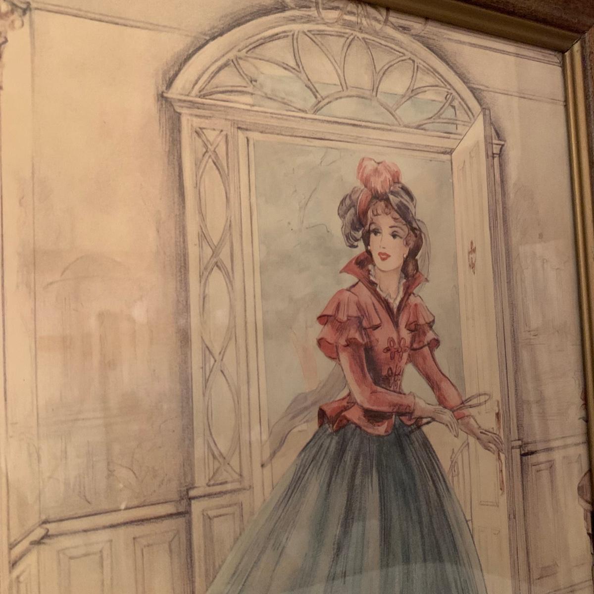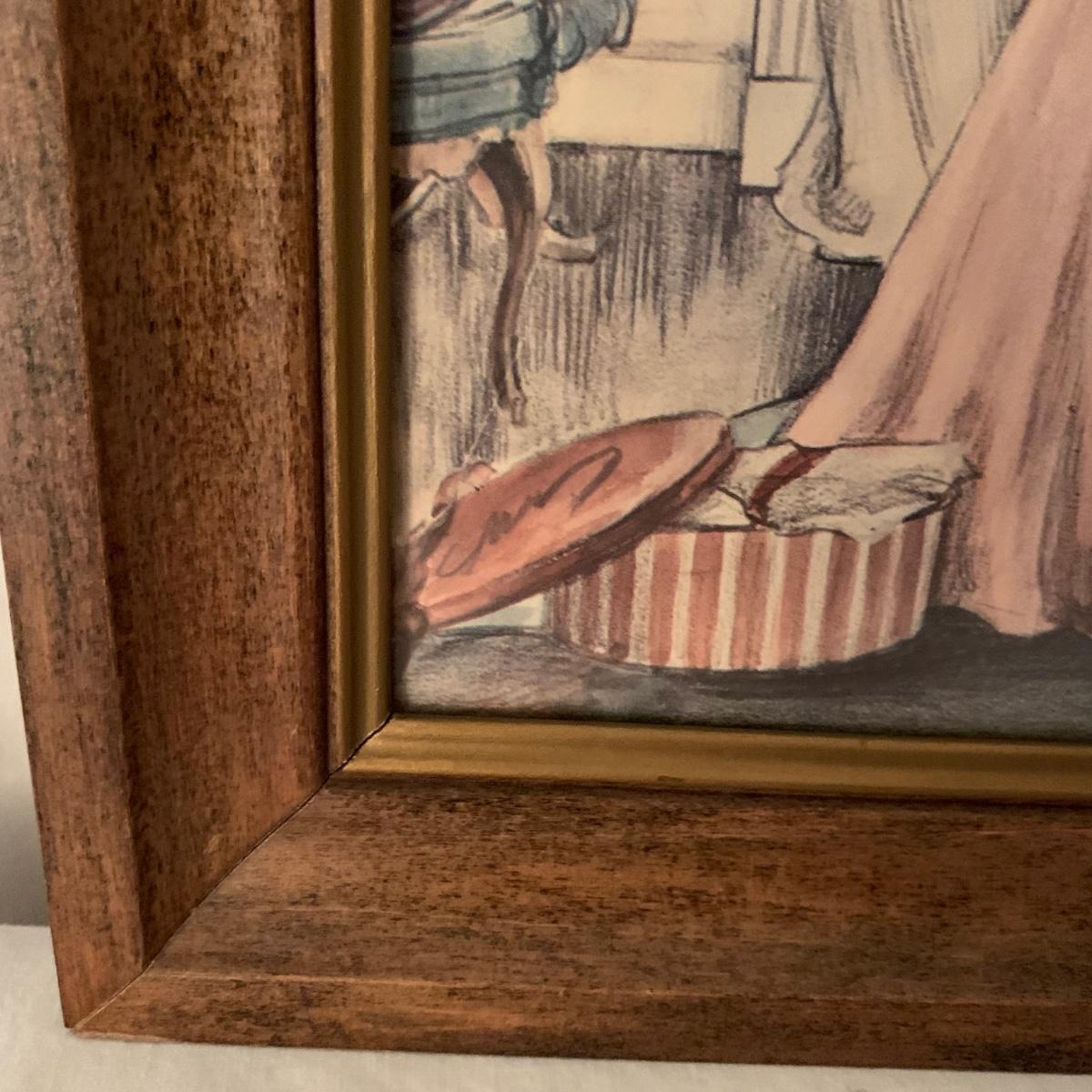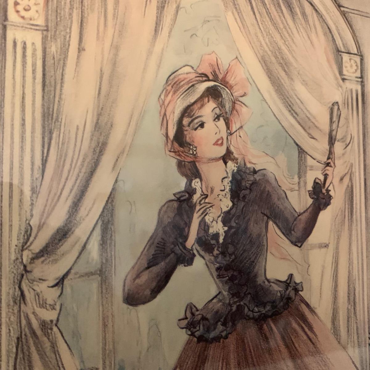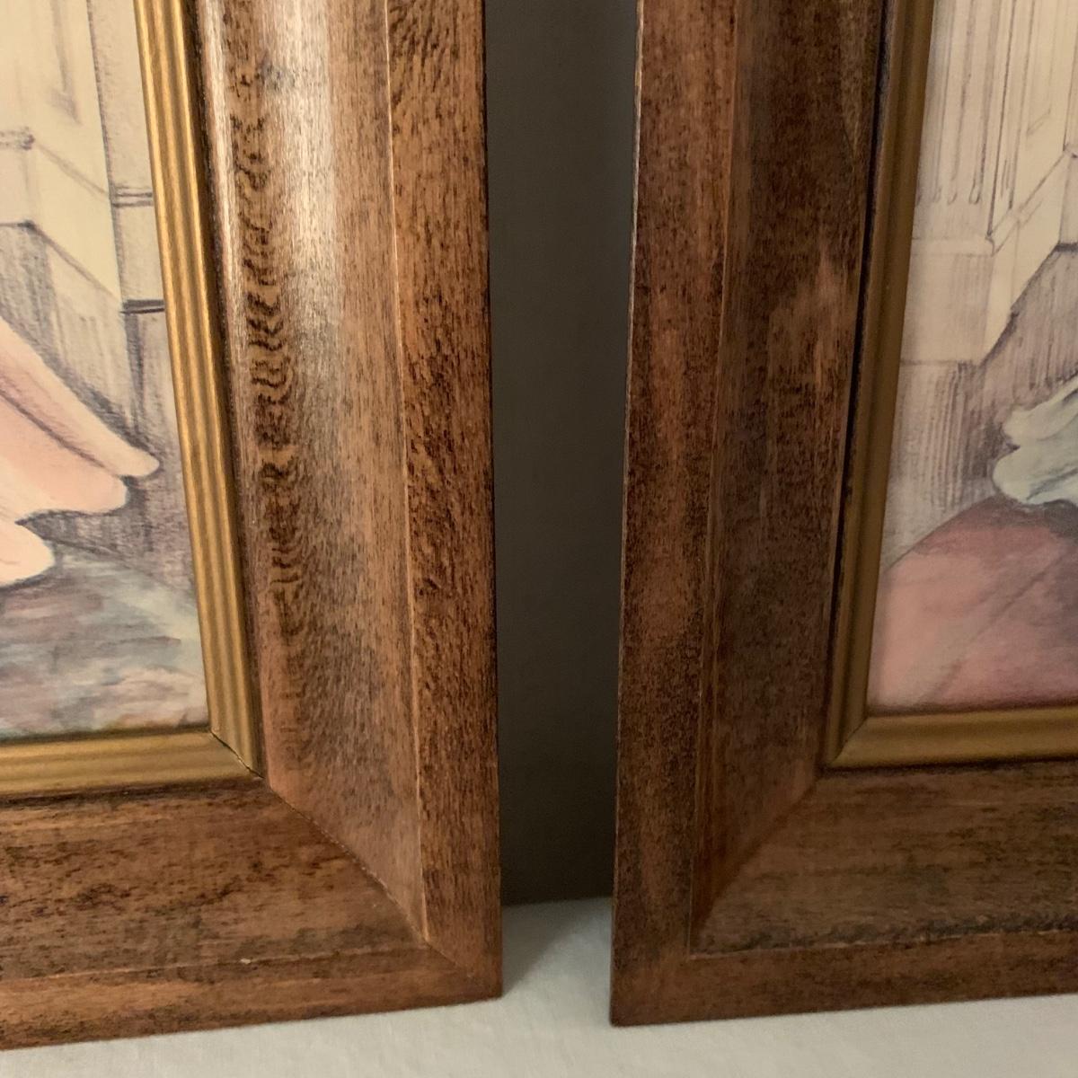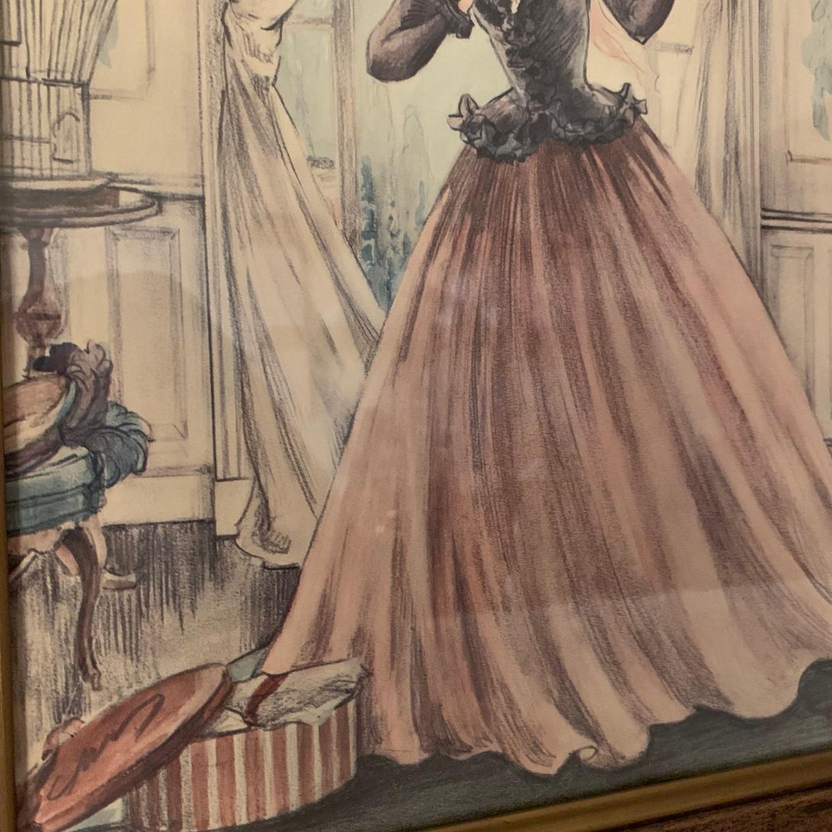 Two framed art prints from Peter Watson Studio featuring ladies in Victorian fashion. The frames are wood with a gold-painted inner border. They each measure 14” x 17”. The prints and frames are in good condition. The paper on the back of the frames is a bit torn. The prints are behind glass. Shipping available.