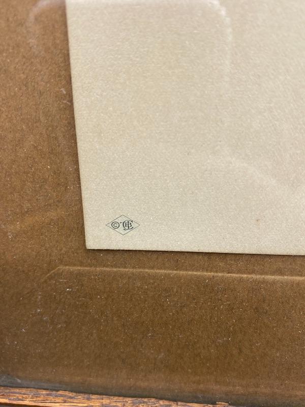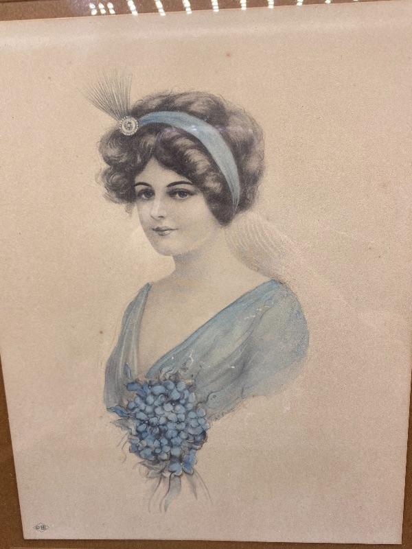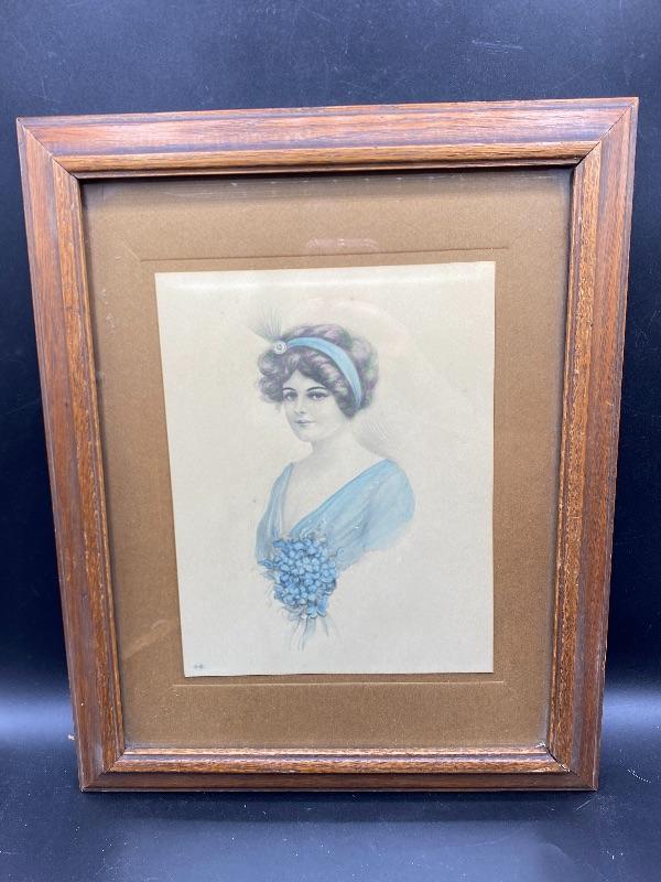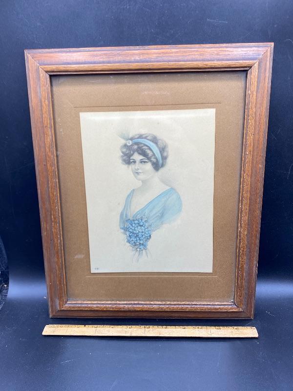 Framed Victorian Lady in blue print. 12" wide. Frame has some wear.
