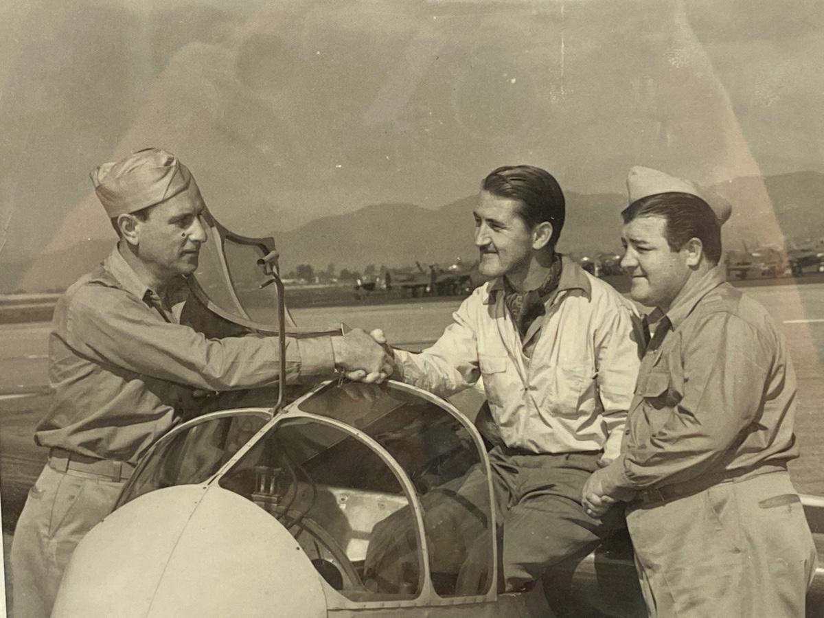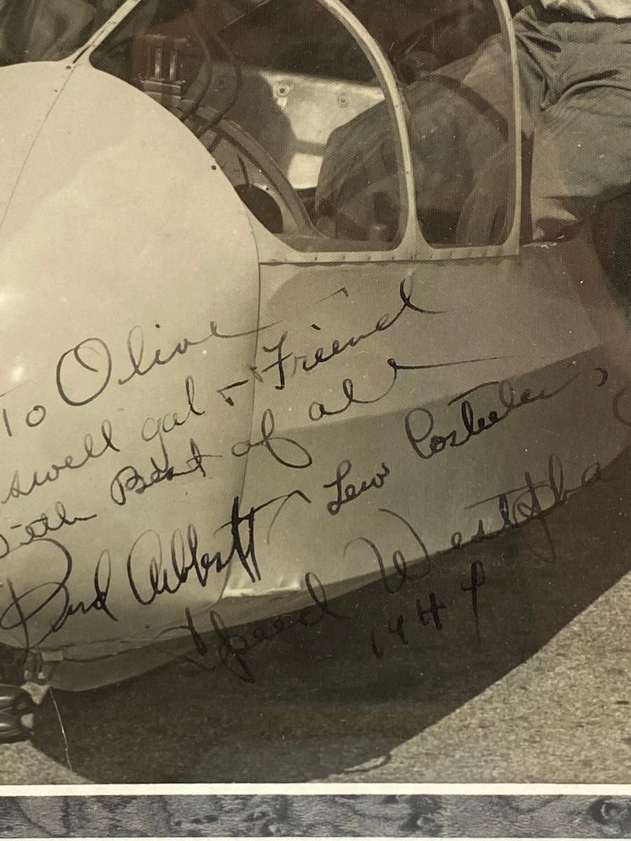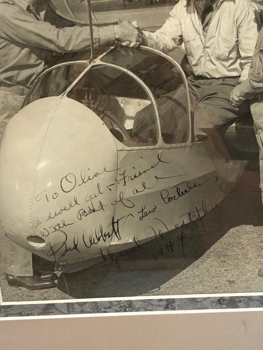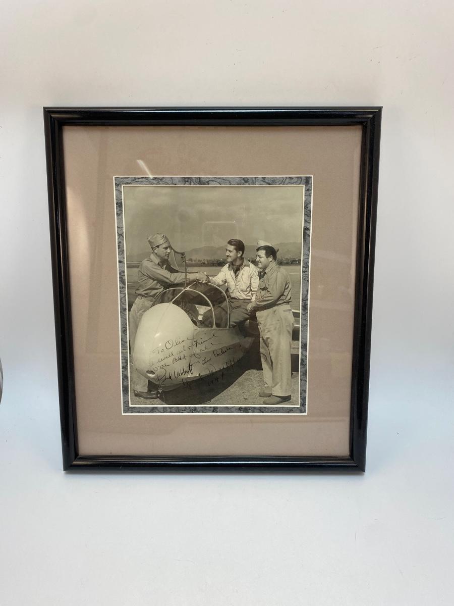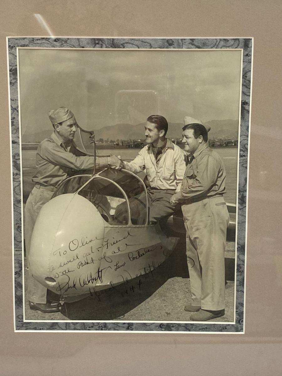 Framed Vintage 1944 Personalized Autographed Photo of Bud Abbott & Lou Costello with a pilot. No COA