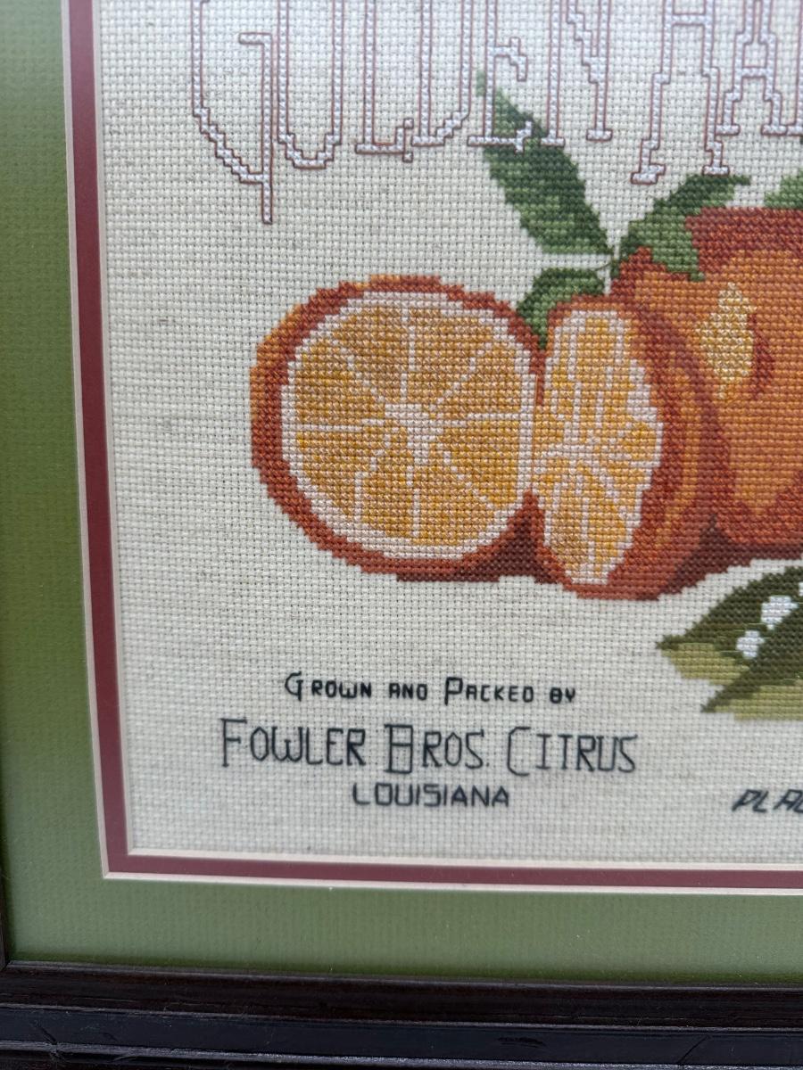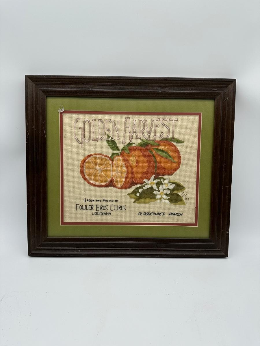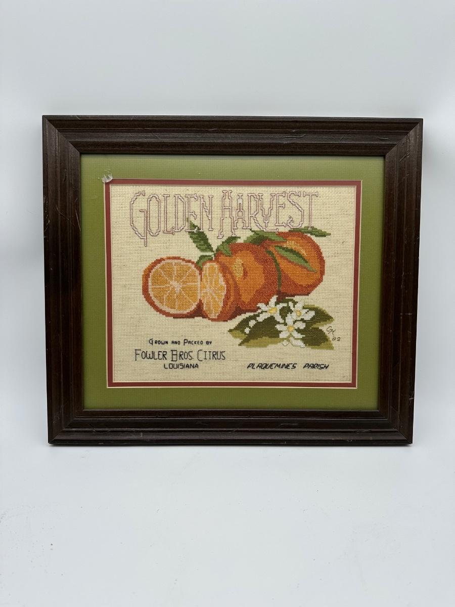Vintage needlepoint / cross-stitch wall art featuring oranges and blossoms with the text “Golden Harvest – Grown and Packed by Fowler Bros Citrus, Louisiana – Plaquemines Parish.” Nicely matted in green with a wood frame. Classic Southern citrus crate–style artwork.