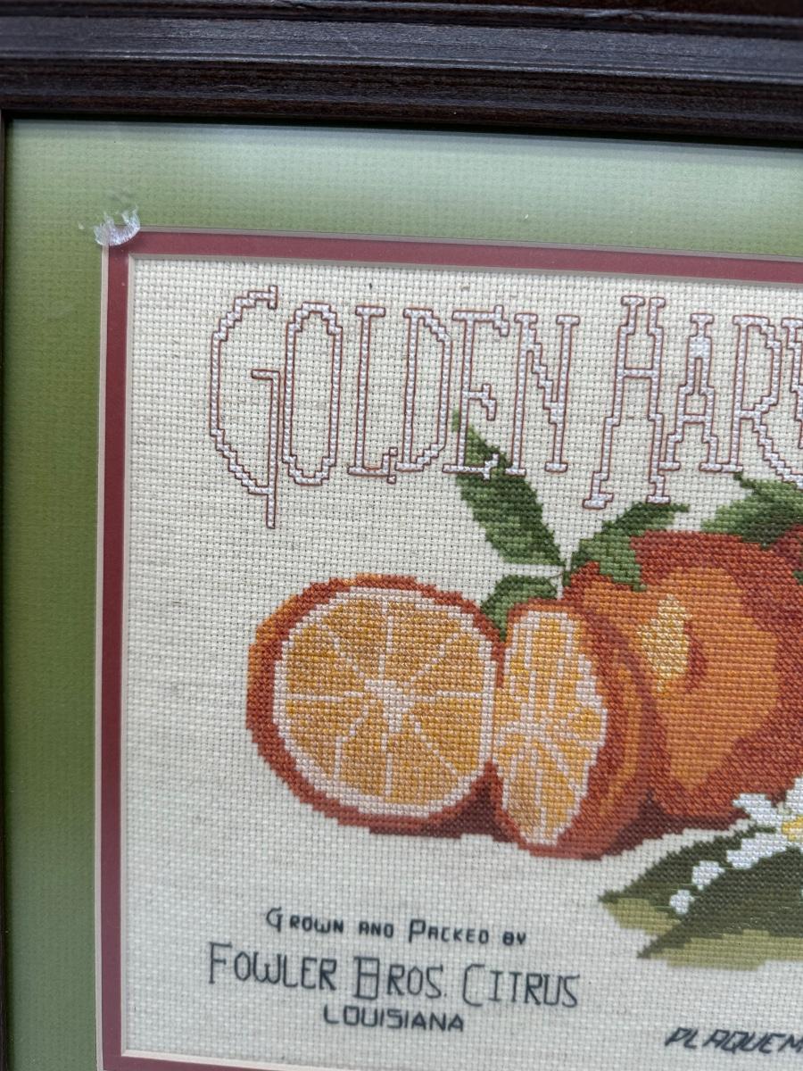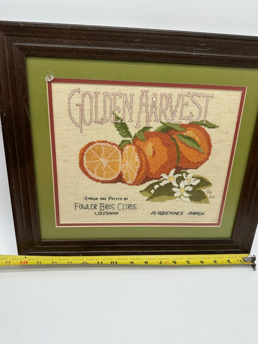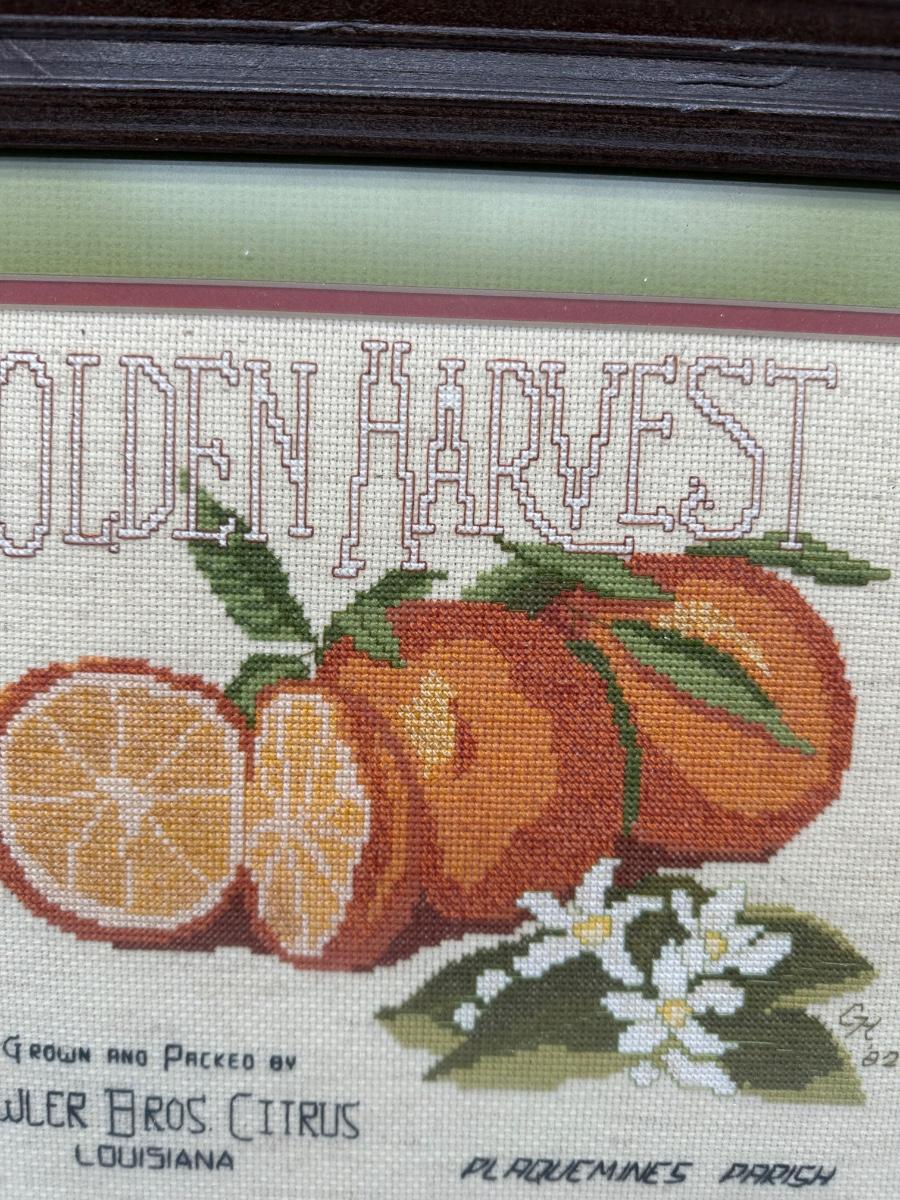 Vintage needlepoint / cross-stitch wall art featuring oranges and blossoms with the text “Golden Harvest – Grown and Packed by Fowler Bros Citrus, Louisiana – Plaquemines Parish.” Nicely matted in green with a wood frame. Classic Southern citrus crate–style artwork.