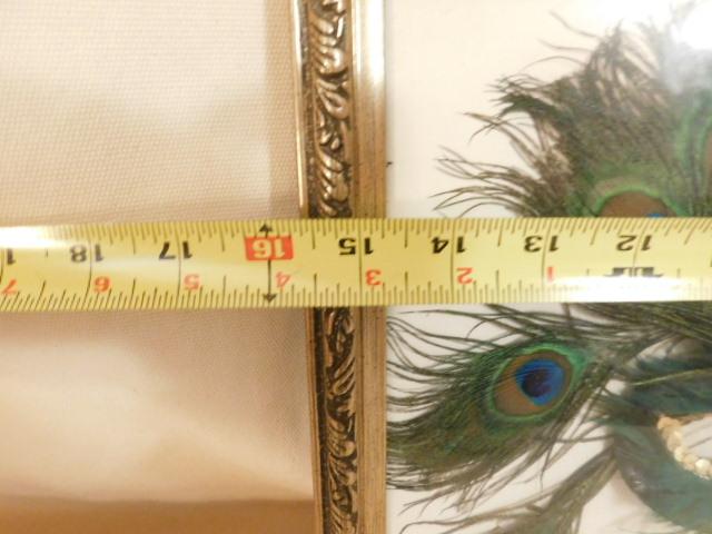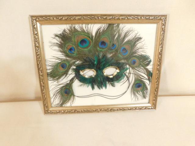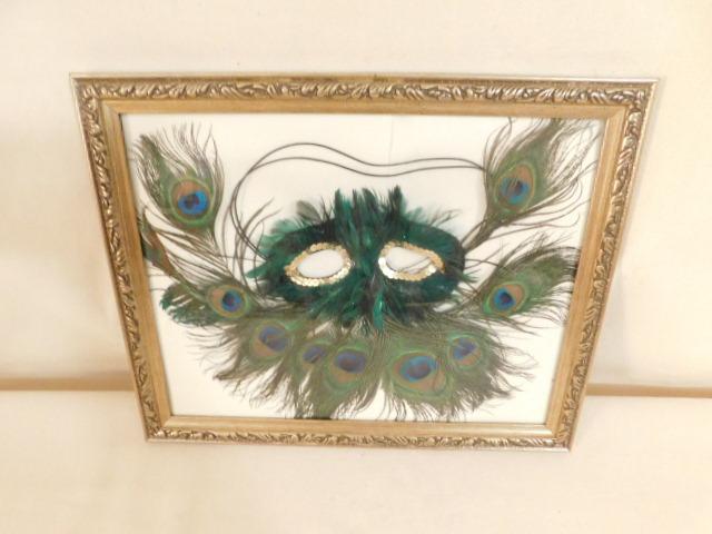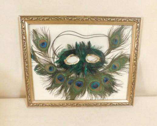 Framed Vintage Peacock Feather Lady's Masquerade Mask 16"x12"