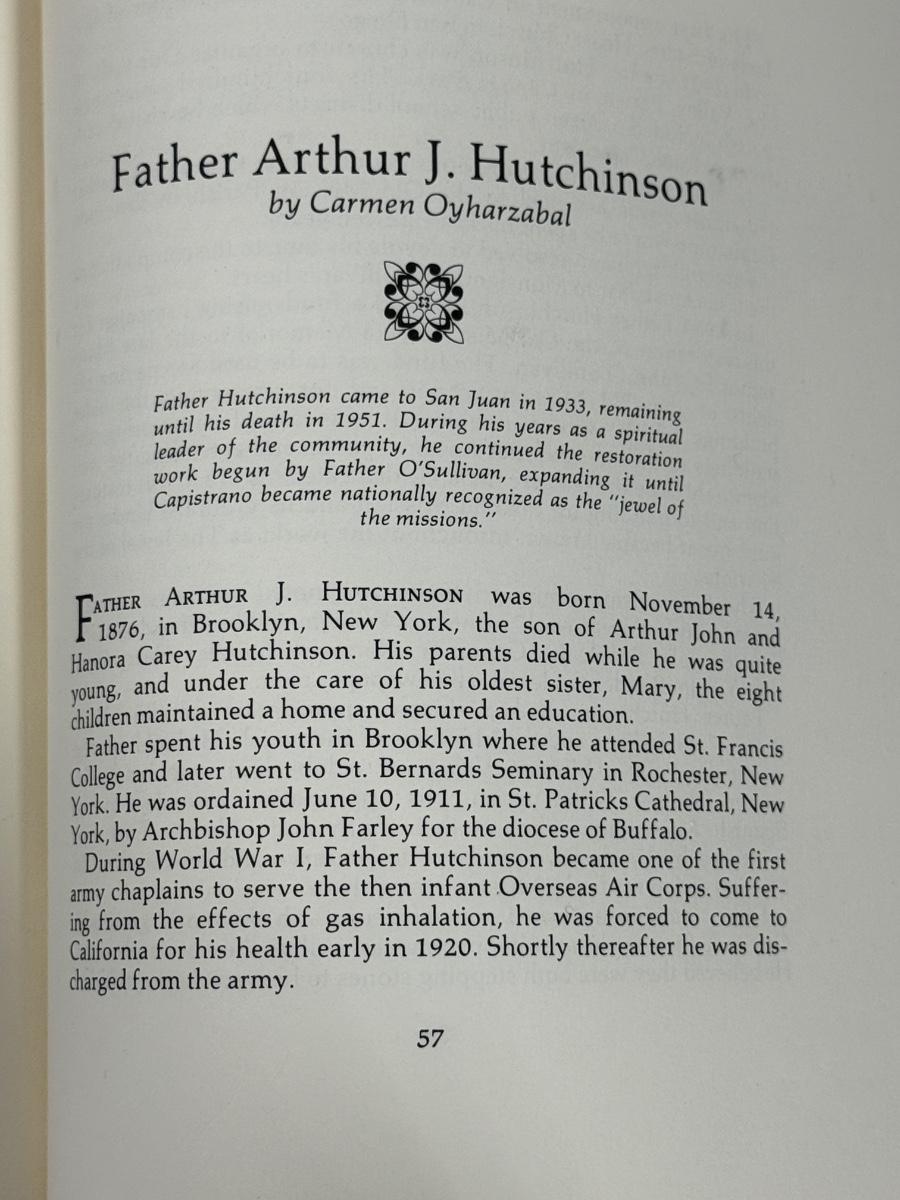 Father Hutchinson served as Pastor at Mission San Juan Capistrano 1933-1951. Also included is a 1976 book of memories of early San Juan Capistrano, which includes a short story about the Father and the same photo. Both are in good condition.