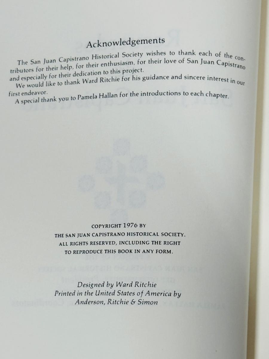 Father Hutchinson served as Pastor at Mission San Juan Capistrano 1933-1951. Also included is a 1976 book of memories of early San Juan Capistrano, which includes a short story about the Father and the same photo. Both are in good condition.