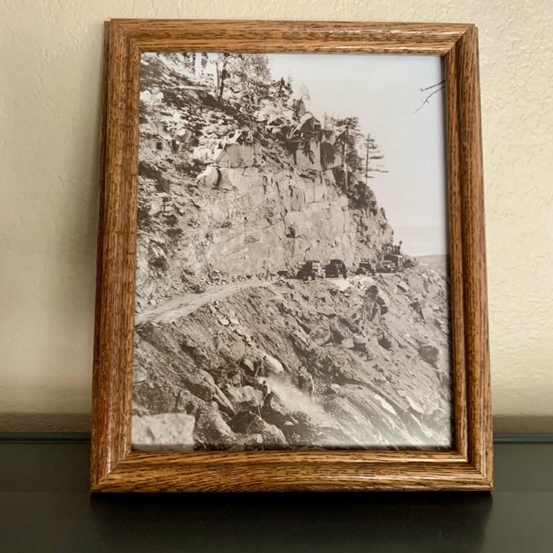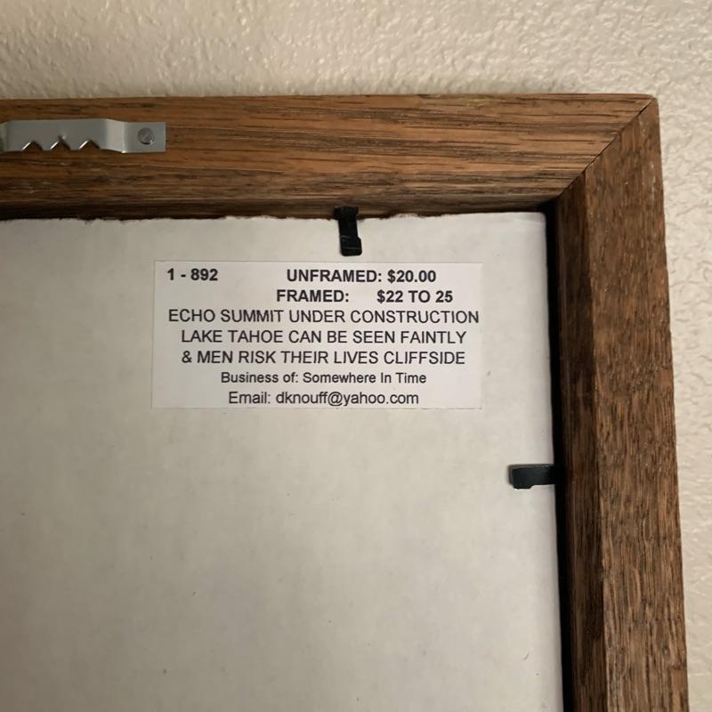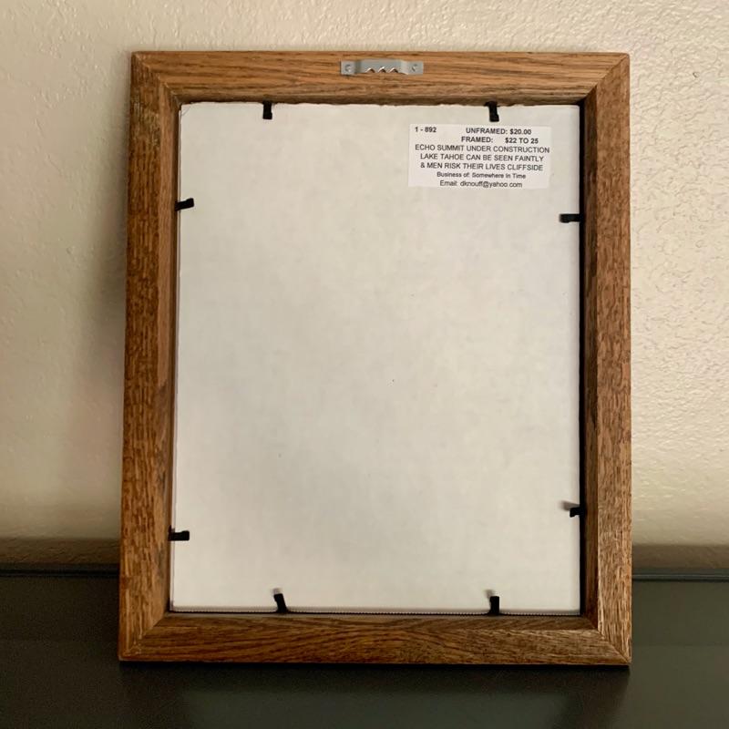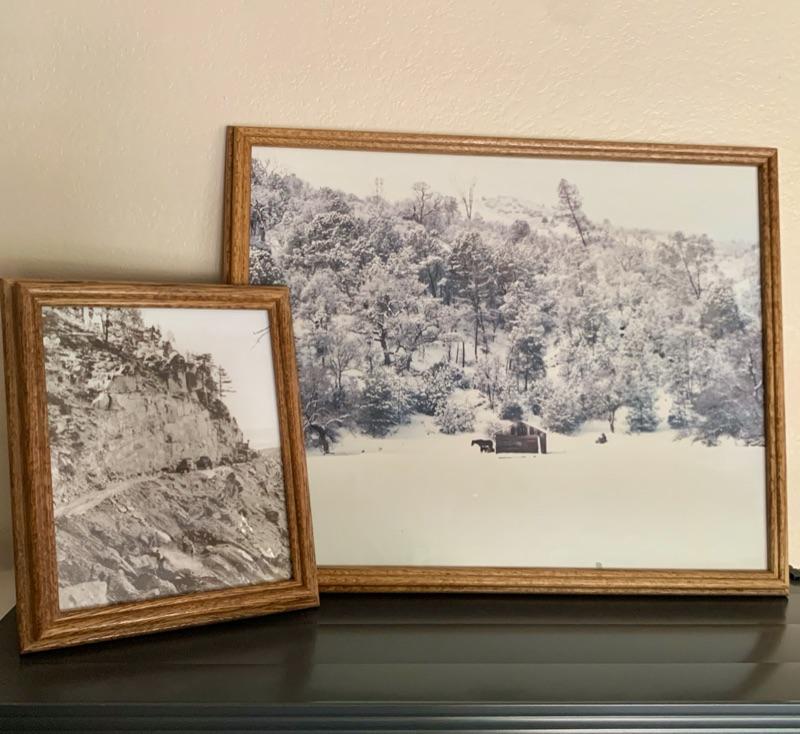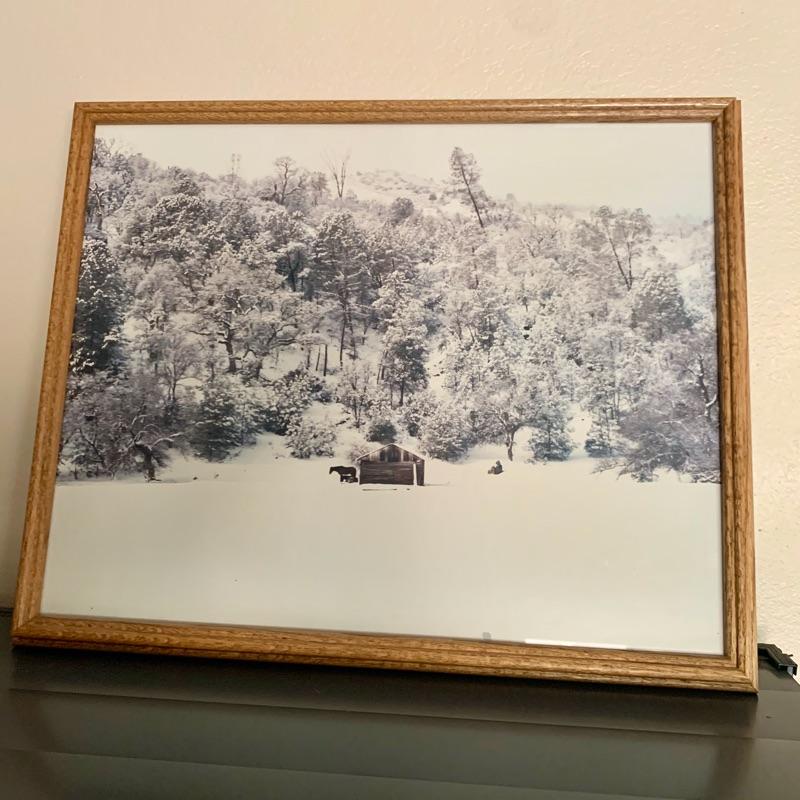 Large framed vintage photo of farmhouse in winter snow scene. Wood frame with wood backing. Measures 14 1/2' x 12 1/4". Smaller photo was taken near Lake Tahoe at Echo Summit. Measures 9 3/4" x 11 3/4."