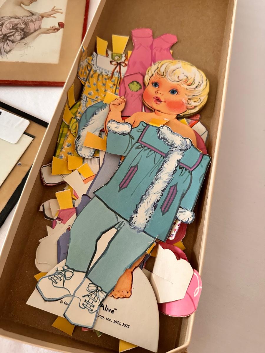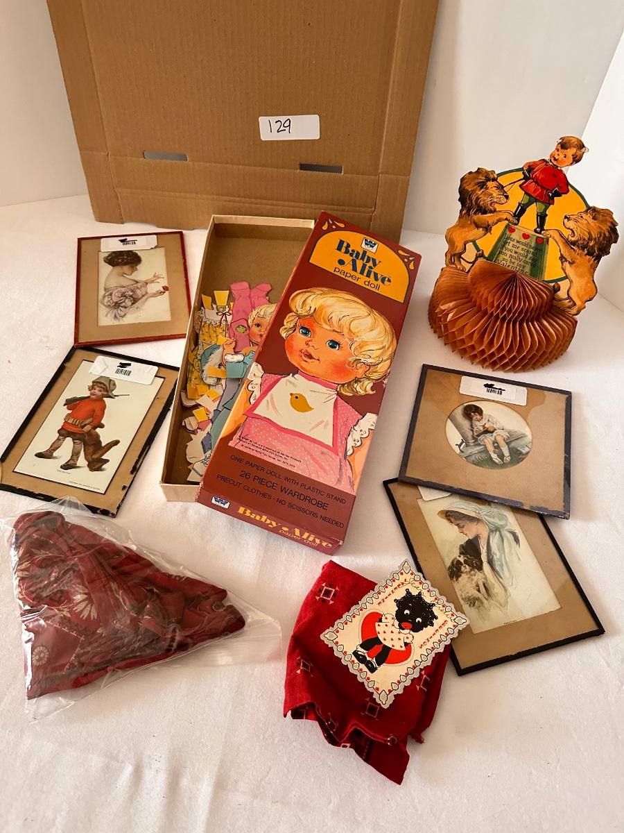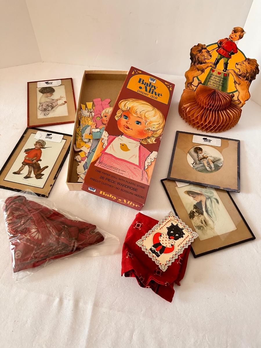 Framed Vintage Post Card, Paper Doll, and Greeting Card Lot,4 Framed Vintage Greeting Cards, 2 Vintage Bandanda Scarves, 2 Vintage Valentine Card, Baby Alive Vintage Paper Doll Set As Pictured