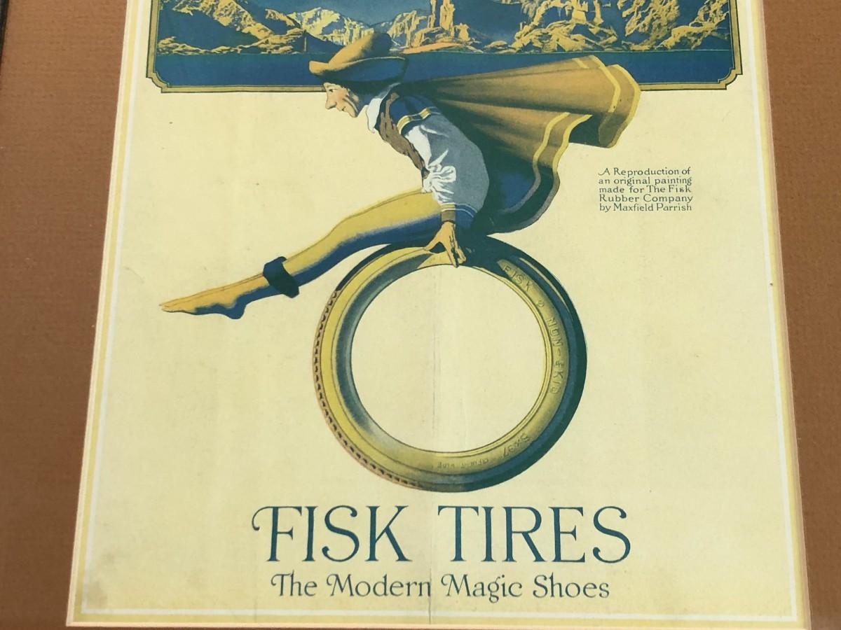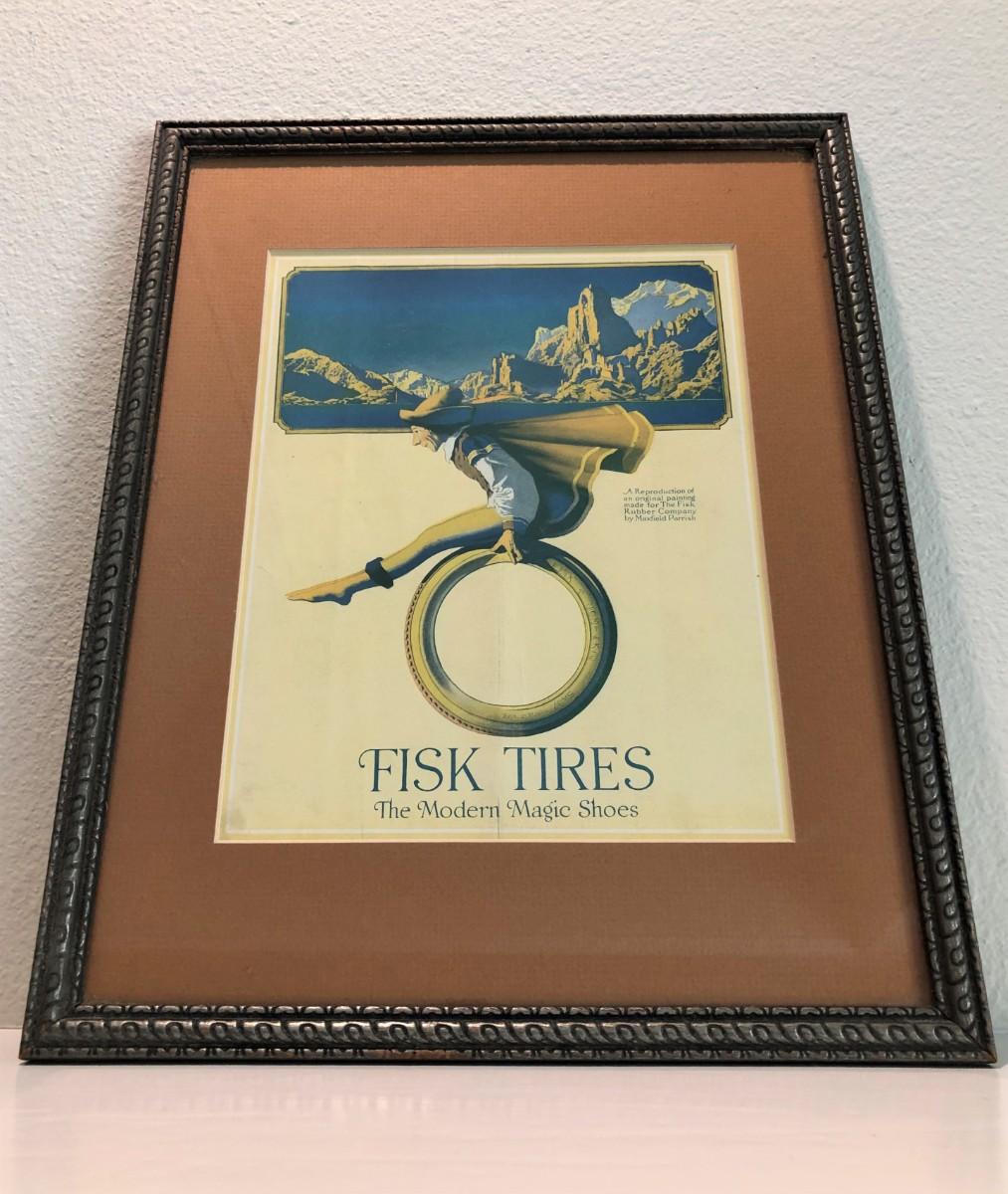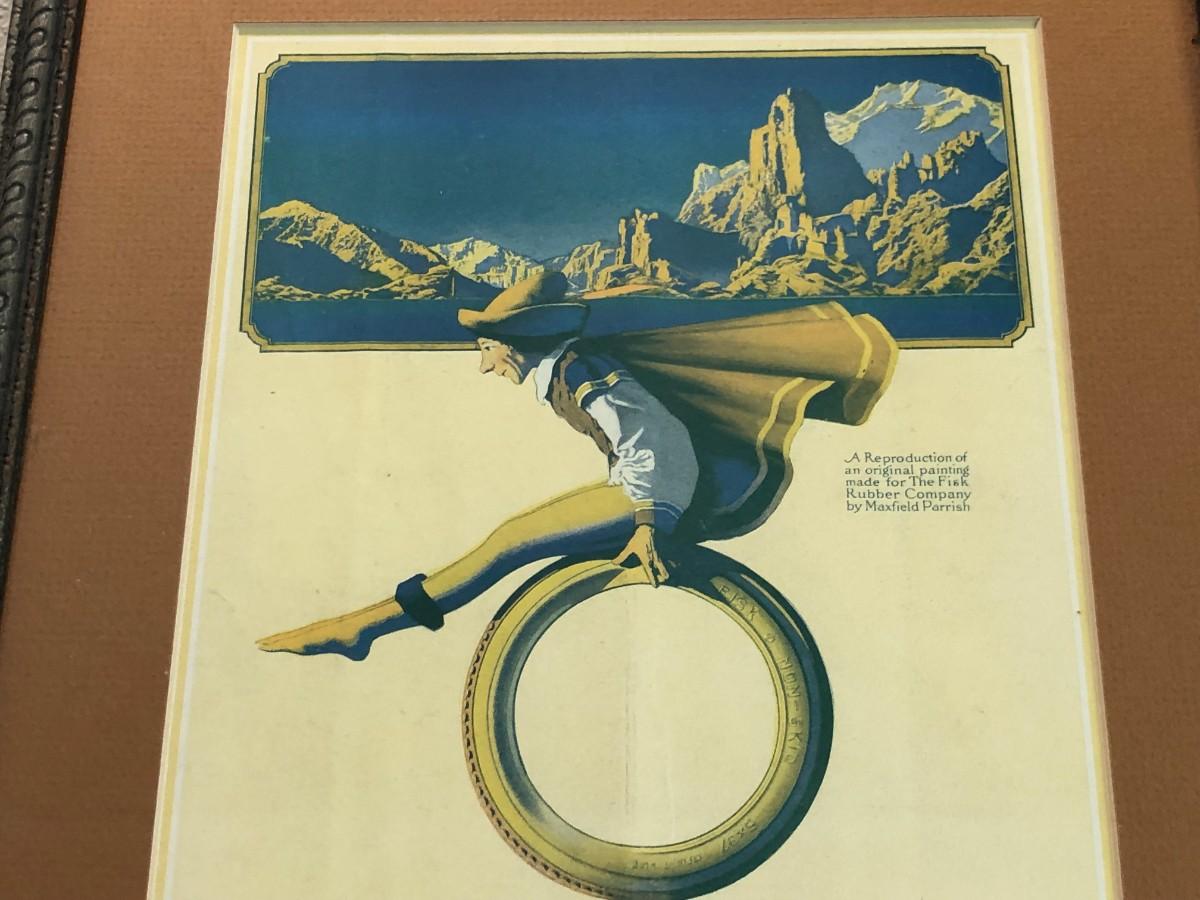 Framed Vintage Print by Maxfield Parrish for Fisk Tires and Rubber Company. In very good condition.