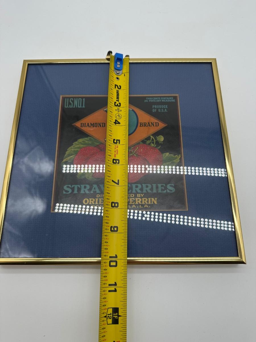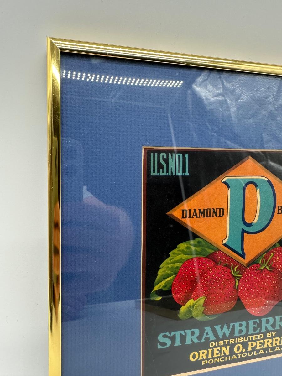 Vintage strawberry crate label titled “Diamond P Brand Strawberries”, distributed by Orien O. Perrin, Ponchatoula, Louisiana. Classic early produce artwork featuring strawberries with bold typography. Label is professionally framed with blue mat and gold-tone frame, ready to hang. Great piece of Southern produce, Louisiana, or agricultural advertising décor.