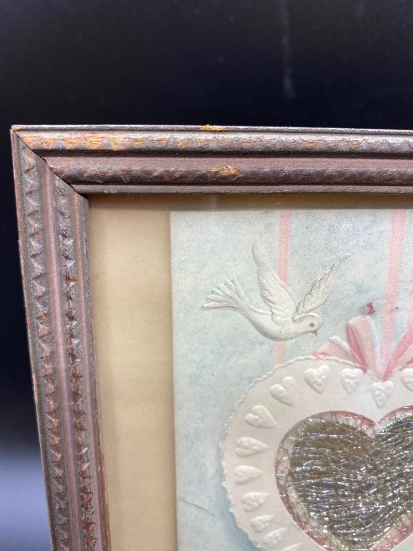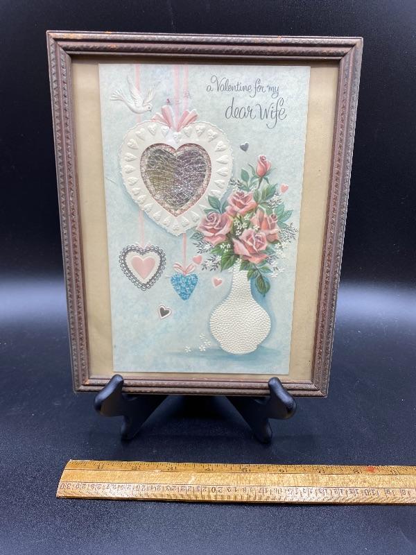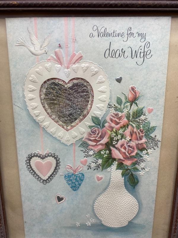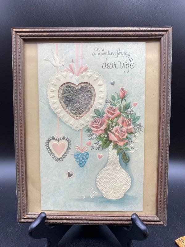 Framed vintage Valentine's Day card. Card says "A Valentine for my dear Wife". Pretty pastel blues and pinks. Unsure if the card is used or not. 7" wide.