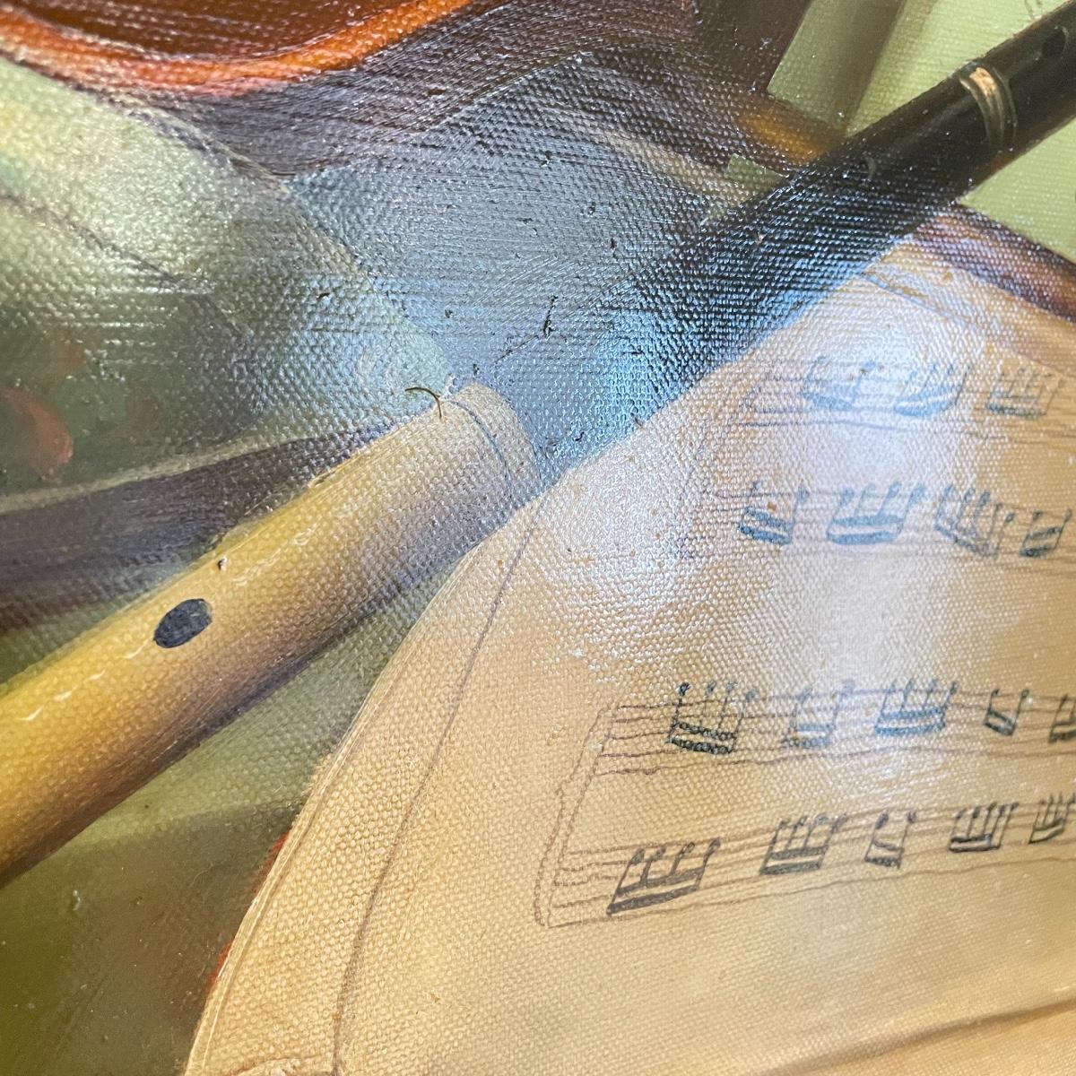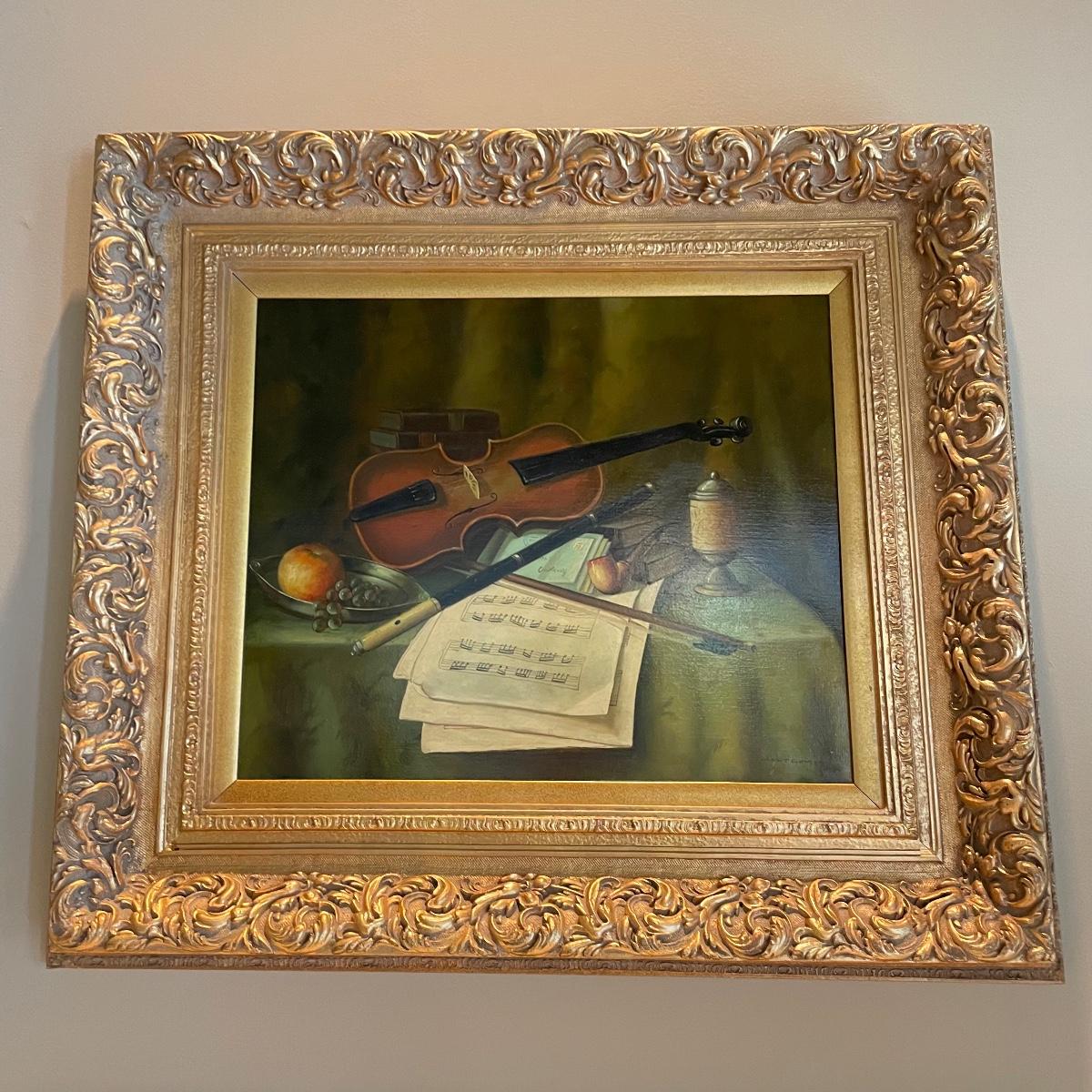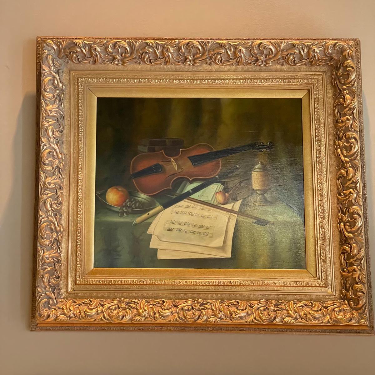 A musical still life art on canvas in a large and heavy wooden frame. Appears to have an original signature by Montgomery, but we cannot verify this. The painted wooden frame is 37.25” x 34” and it’s 3.75” thick. Shipping available. Please call UPS with dimensions at 828-252-6930 for a shipping quote prior to bidding.