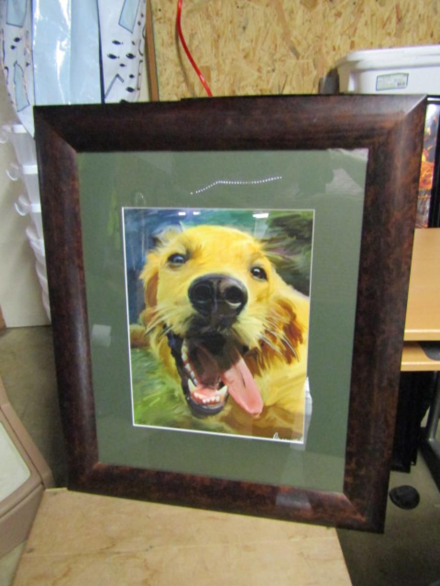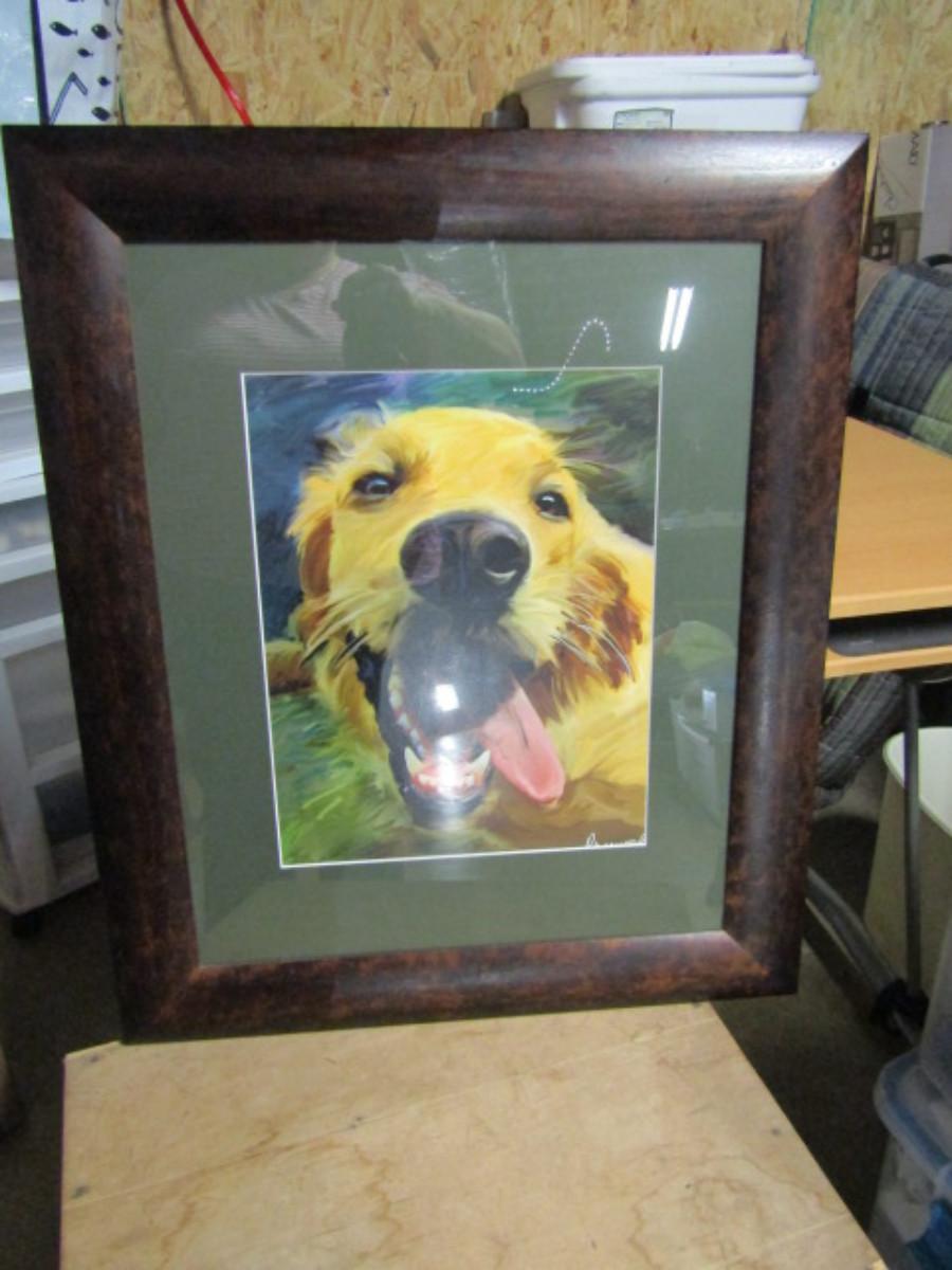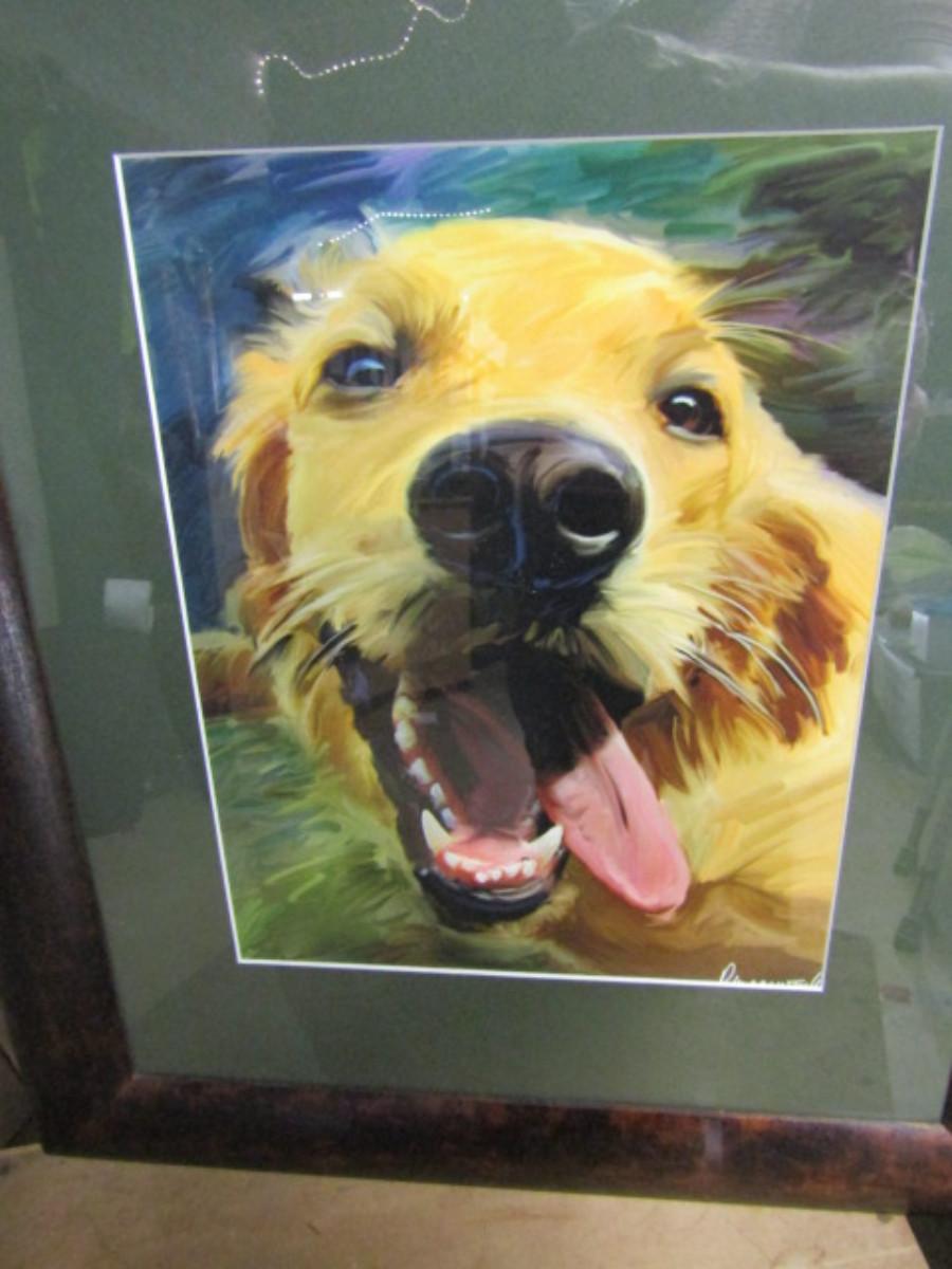 Framed Wall Art- Happy Golden Dog. Possibly signed- something showing near edge of matting.
