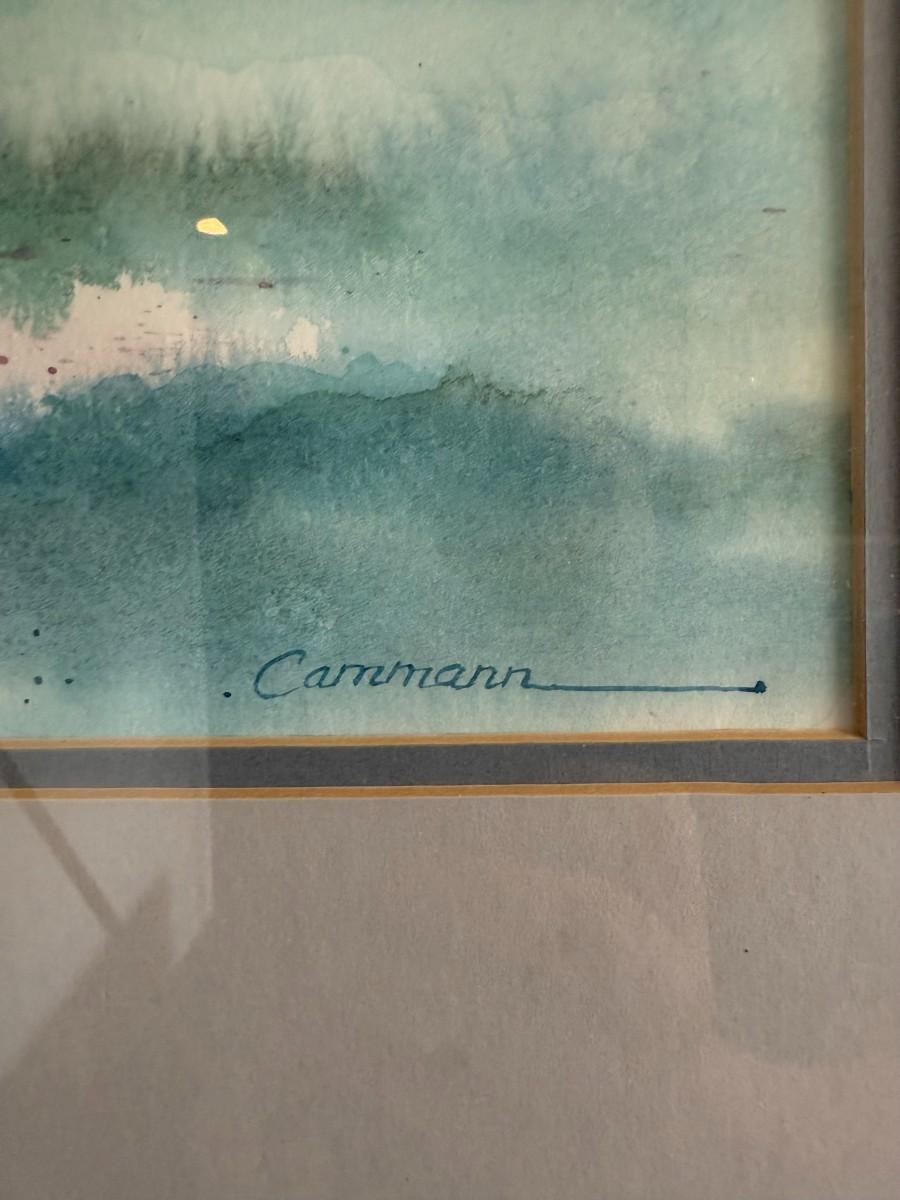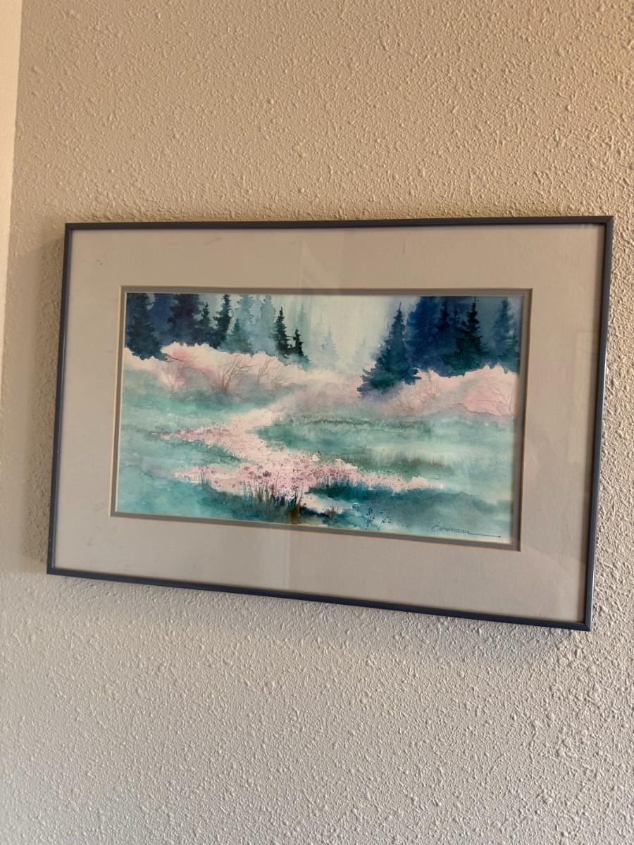 Peaceful misty pine forest scene with soft pastel tones. Professionally matted and framed.