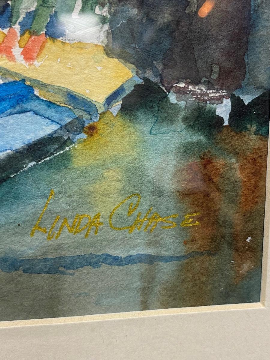 Framed Watercolor Painting Boats by the Dock by Linda Chase. In good condition, colorful.