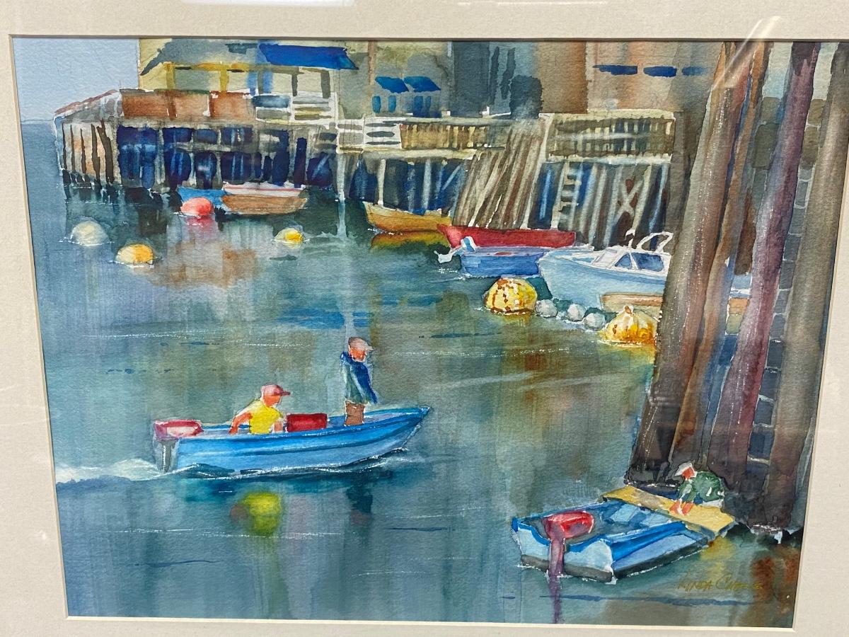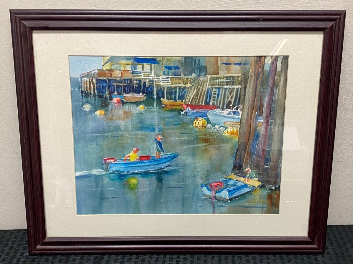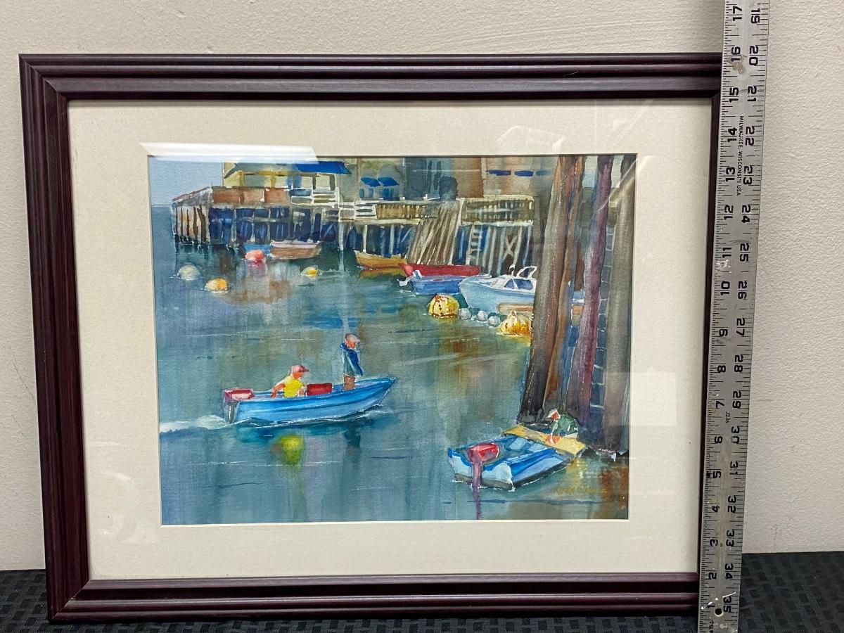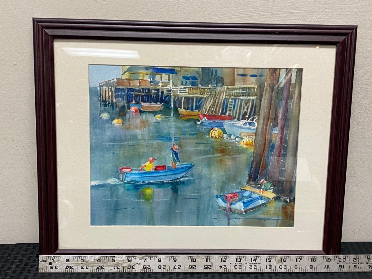 Framed Watercolor Painting Boats by the Dock by Linda Chase