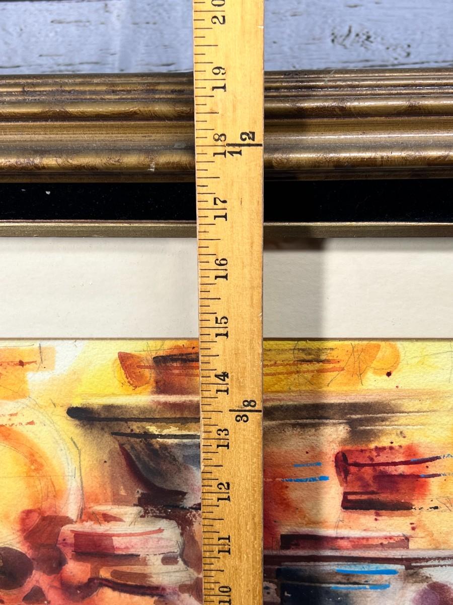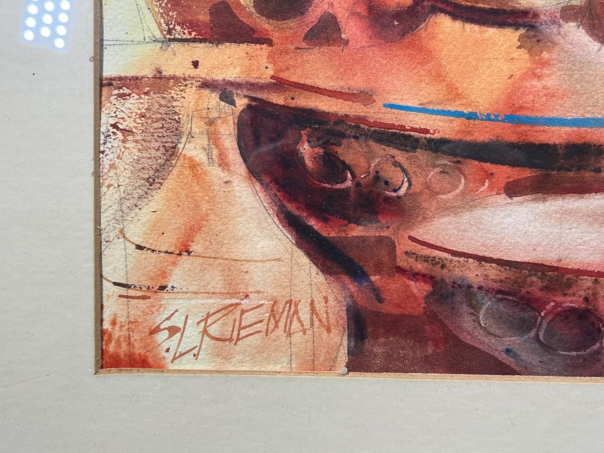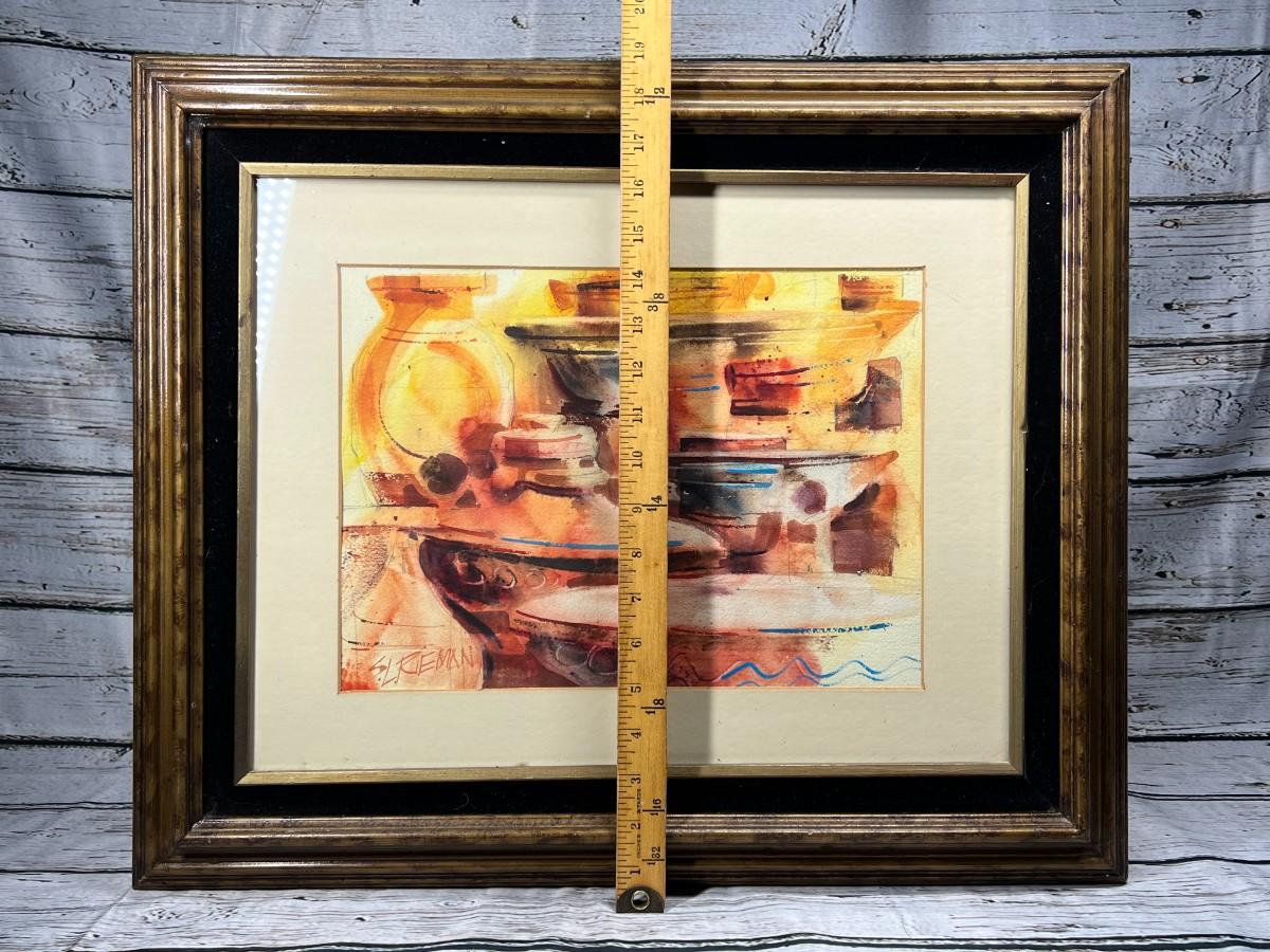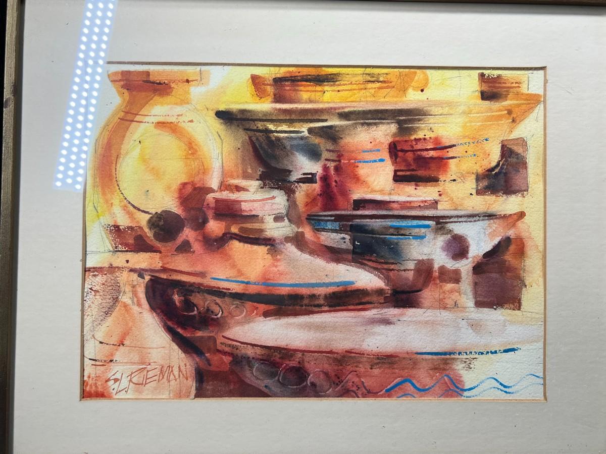 Framed Watercolor Painting of Colorful Pottery by Artist S.L. Rieman, there is no significant damage o the frame or protective glass and is in good displayable condition. Check pictures for more details and for sizing.