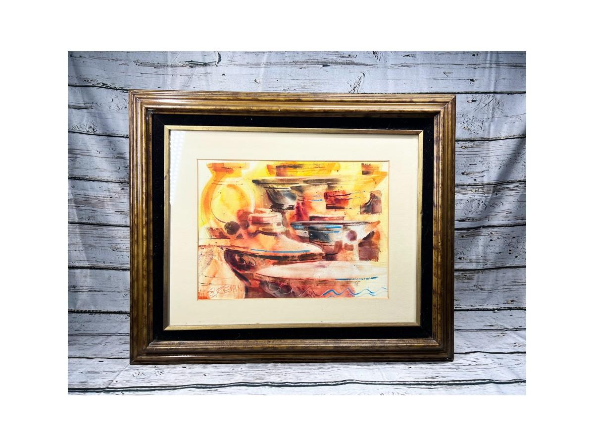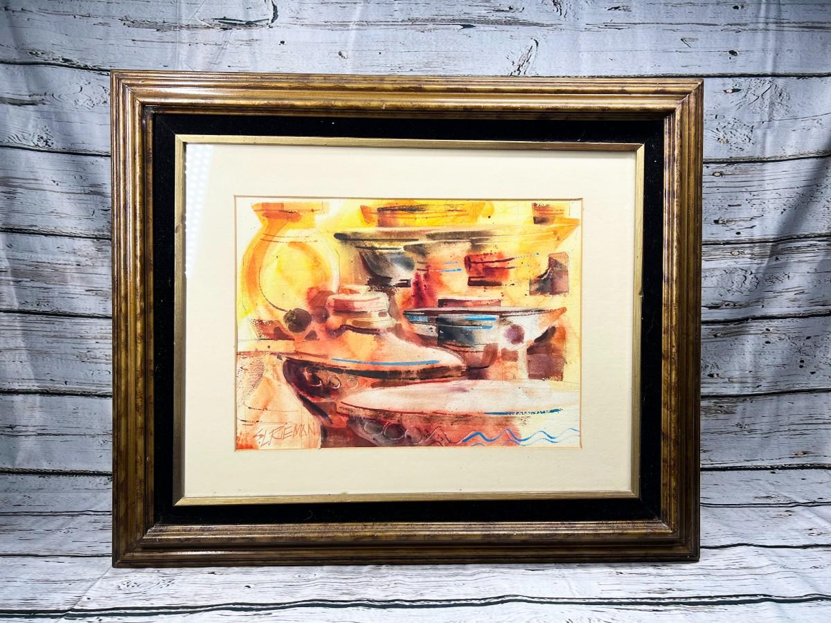 Framed Watercolor Painting of Colorful Pottery by Artist S.L. Rieman