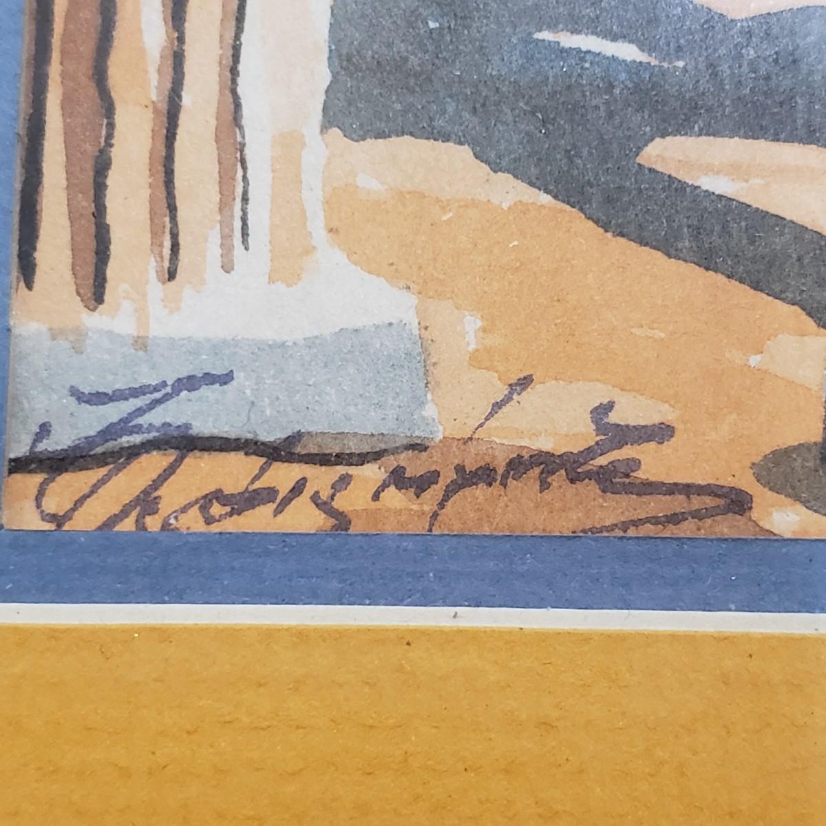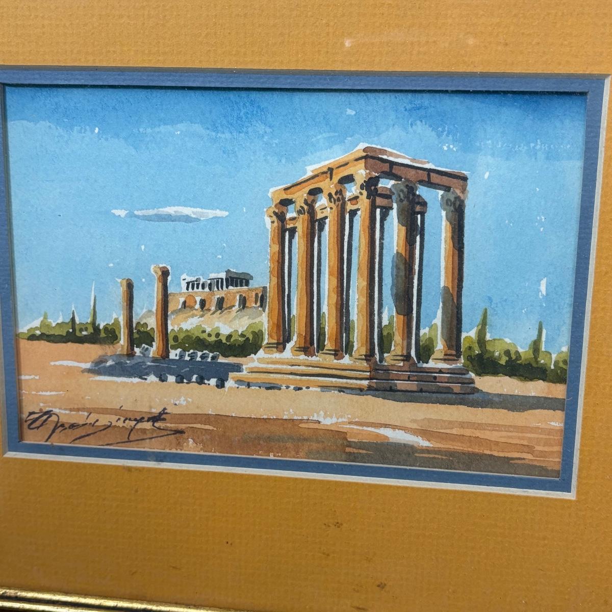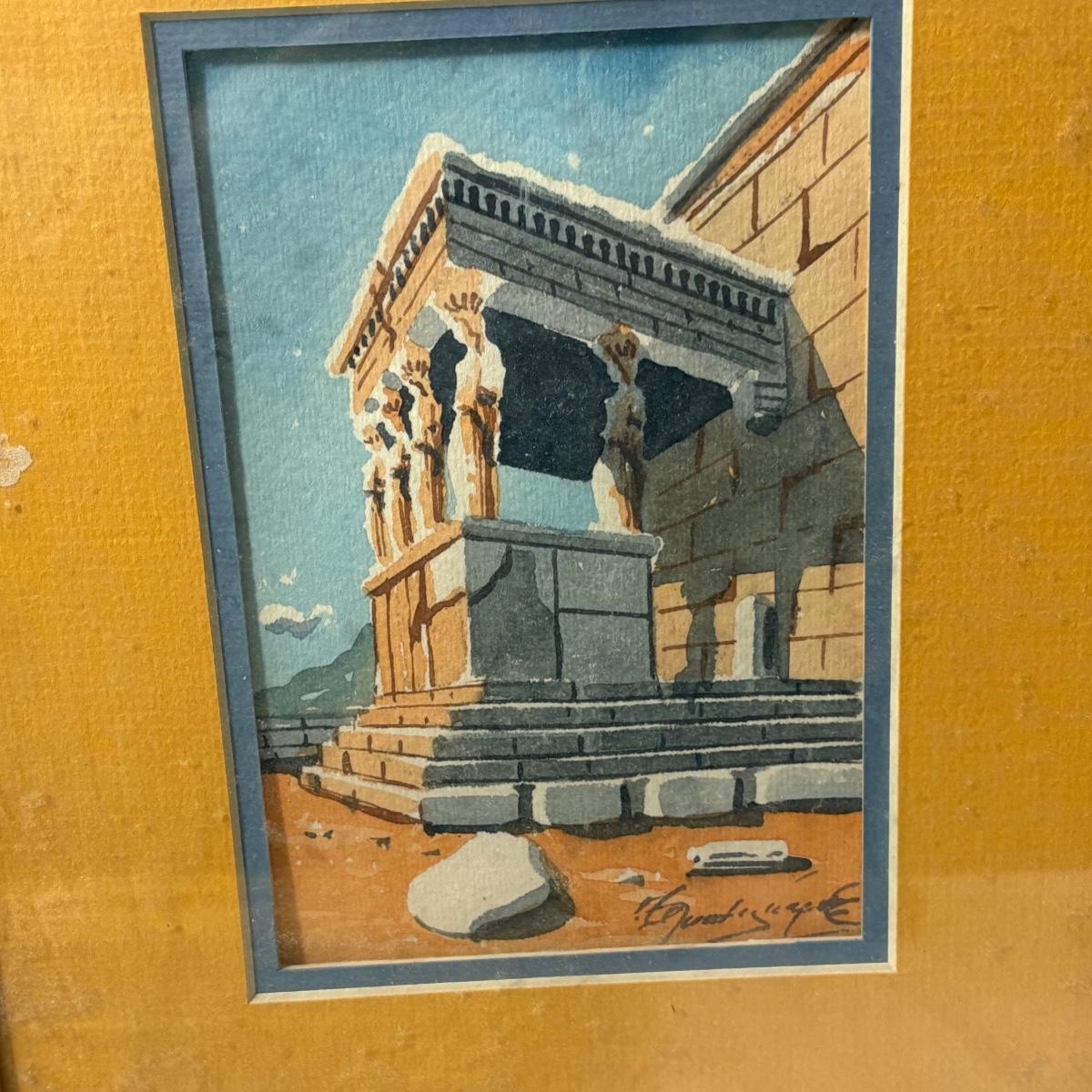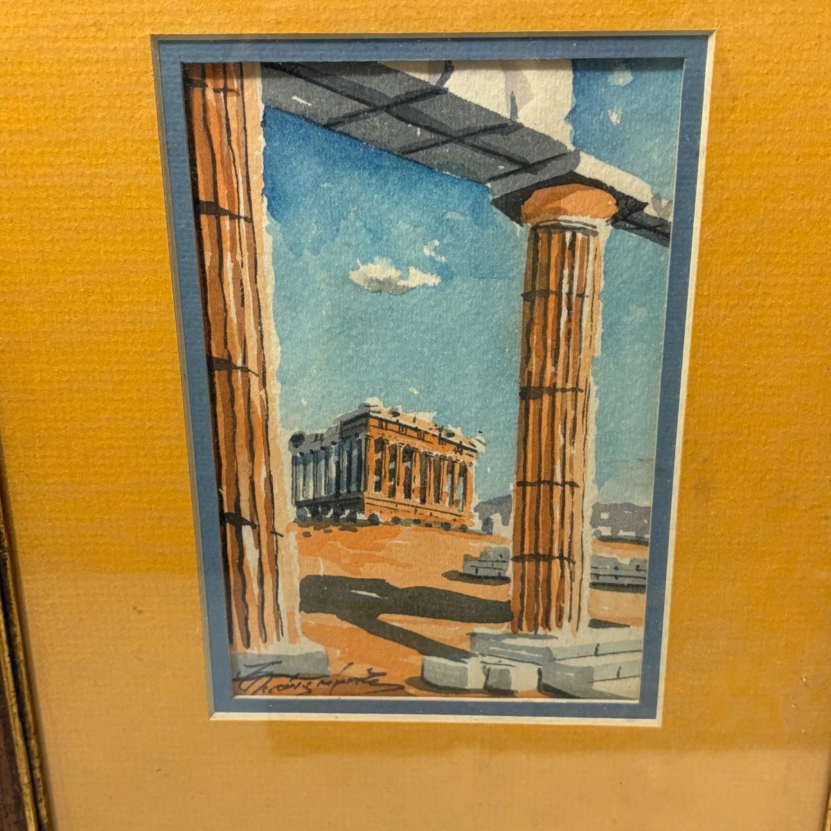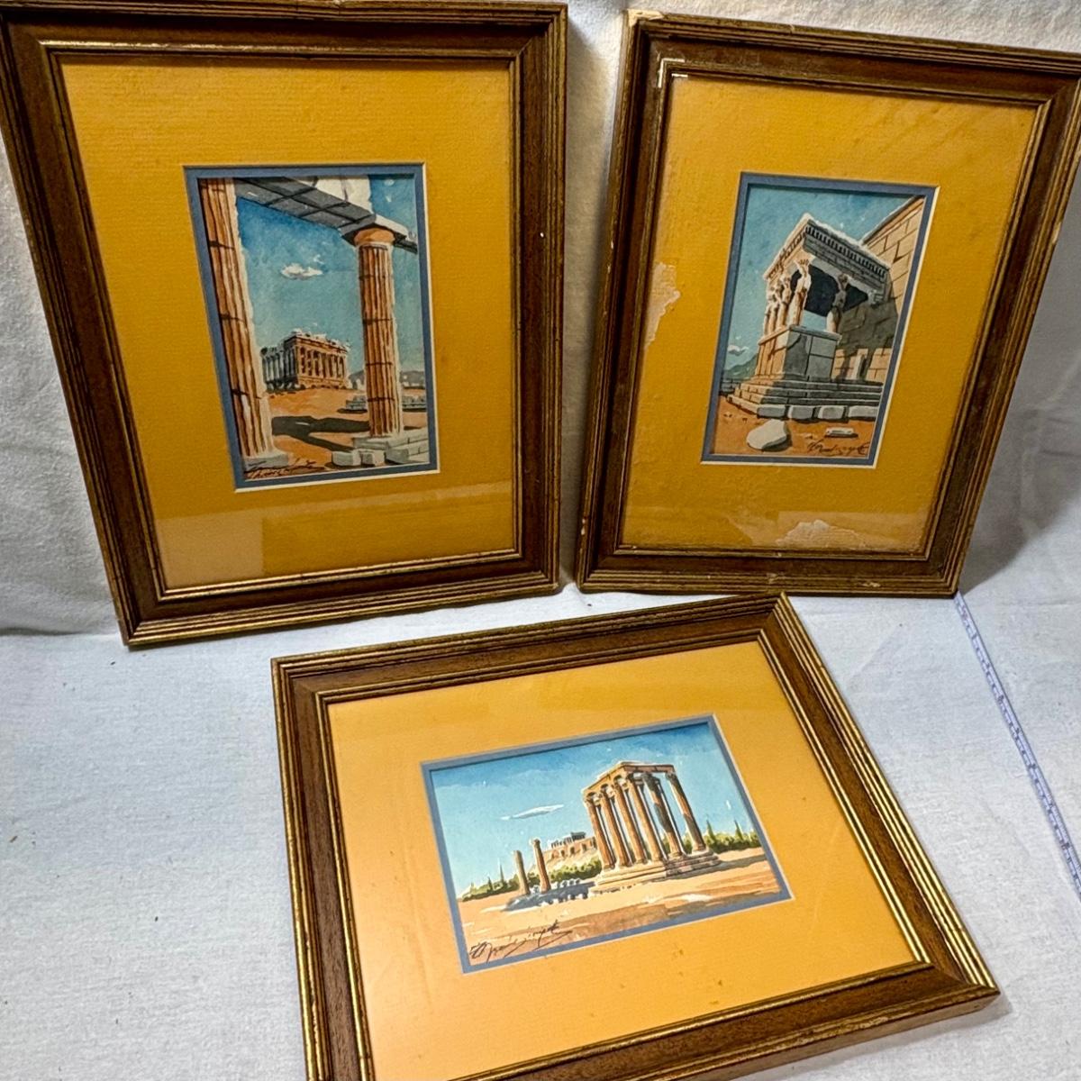 Three watercolors of Greek/Roman ruins appear to be originals and have a charming vintage feel. Signature is present but unintelligible. Distressed gold-tone frames and mustard and blue matting have some wear (see pictures). All are under glass. Horizontal piece is 12.25” x 10”, vertical pieces are 10” x 13”.