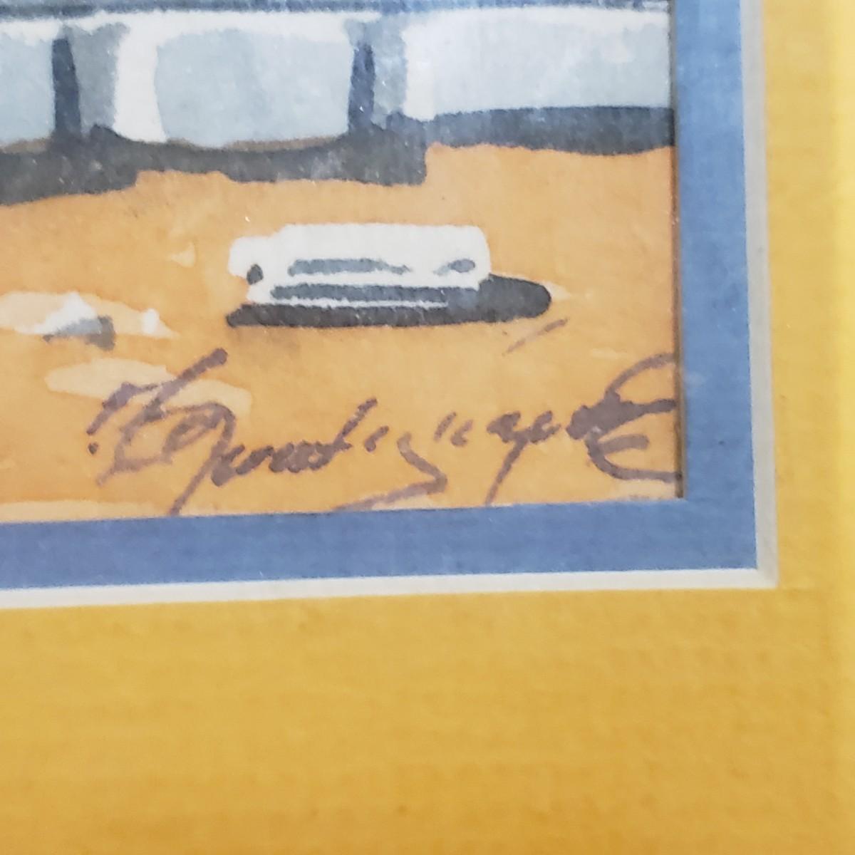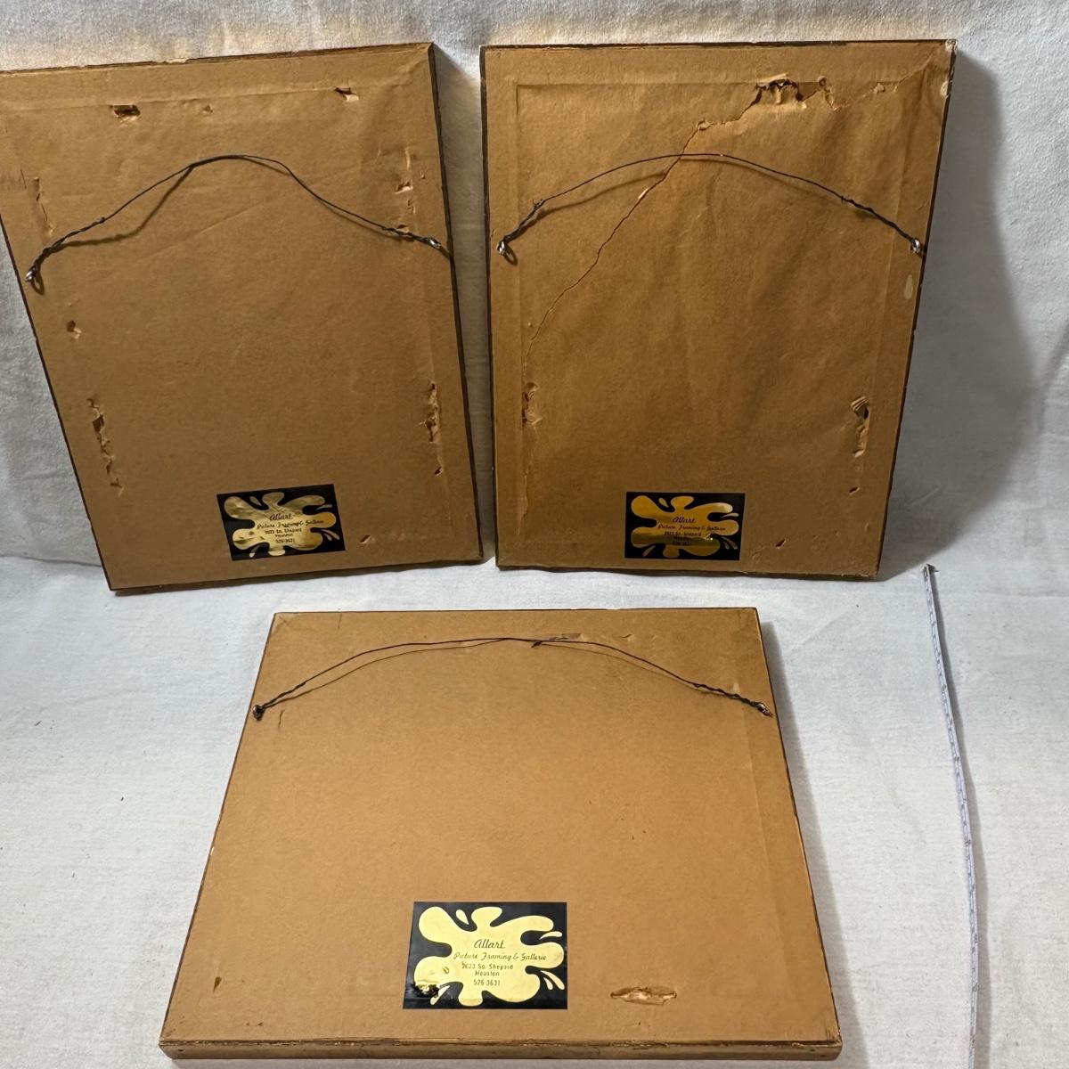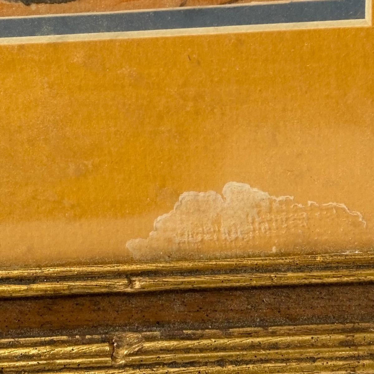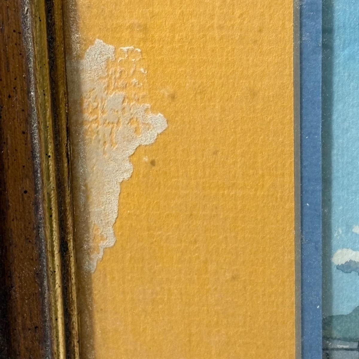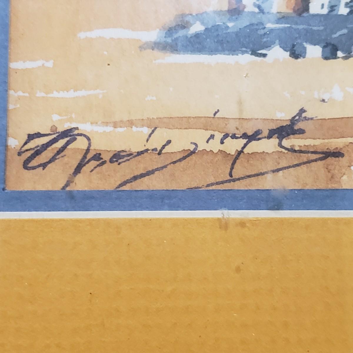 Three watercolors of Greek/Roman ruins appear to be originals and have a charming vintage feel. Signature is present but unintelligible. Distressed gold-tone frames and mustard and blue matting have some wear (see pictures). All are under glass. Horizontal piece is 12.25” x 10”, vertical pieces are 10” x 13”.