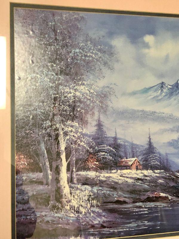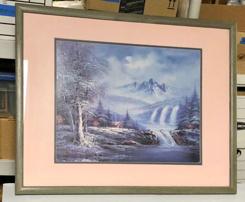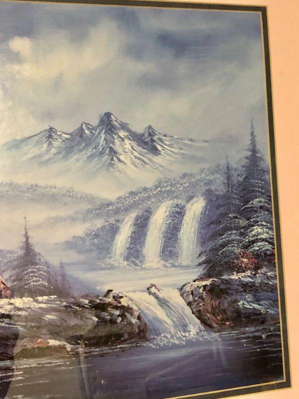 Winter Cabin Scene. Cabin by a river with waterfalls and mountains in the background. Measures 24"x30".