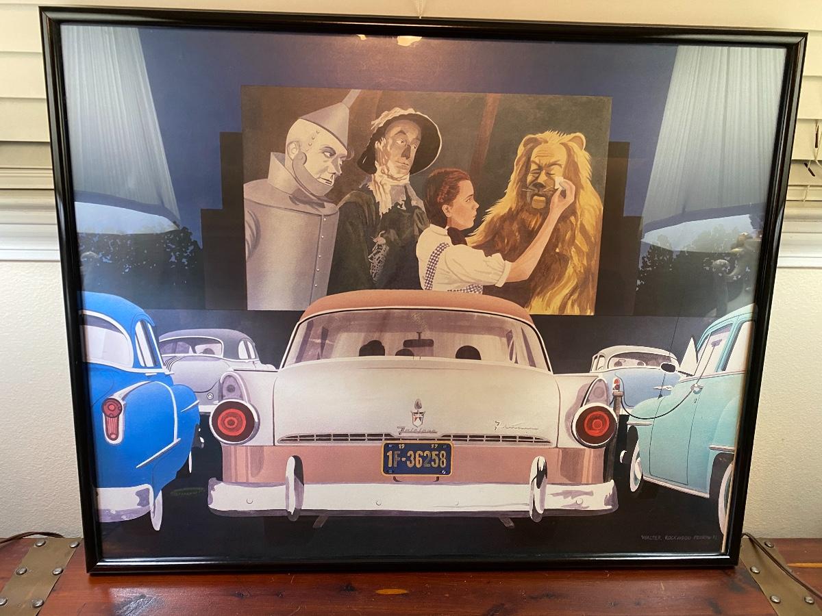 Framed Wizard of Oz poster. Walter Rookwood Ferris - at the drive-in theater. 28 1/2" x 22 1/2". In great condition, ready to hang