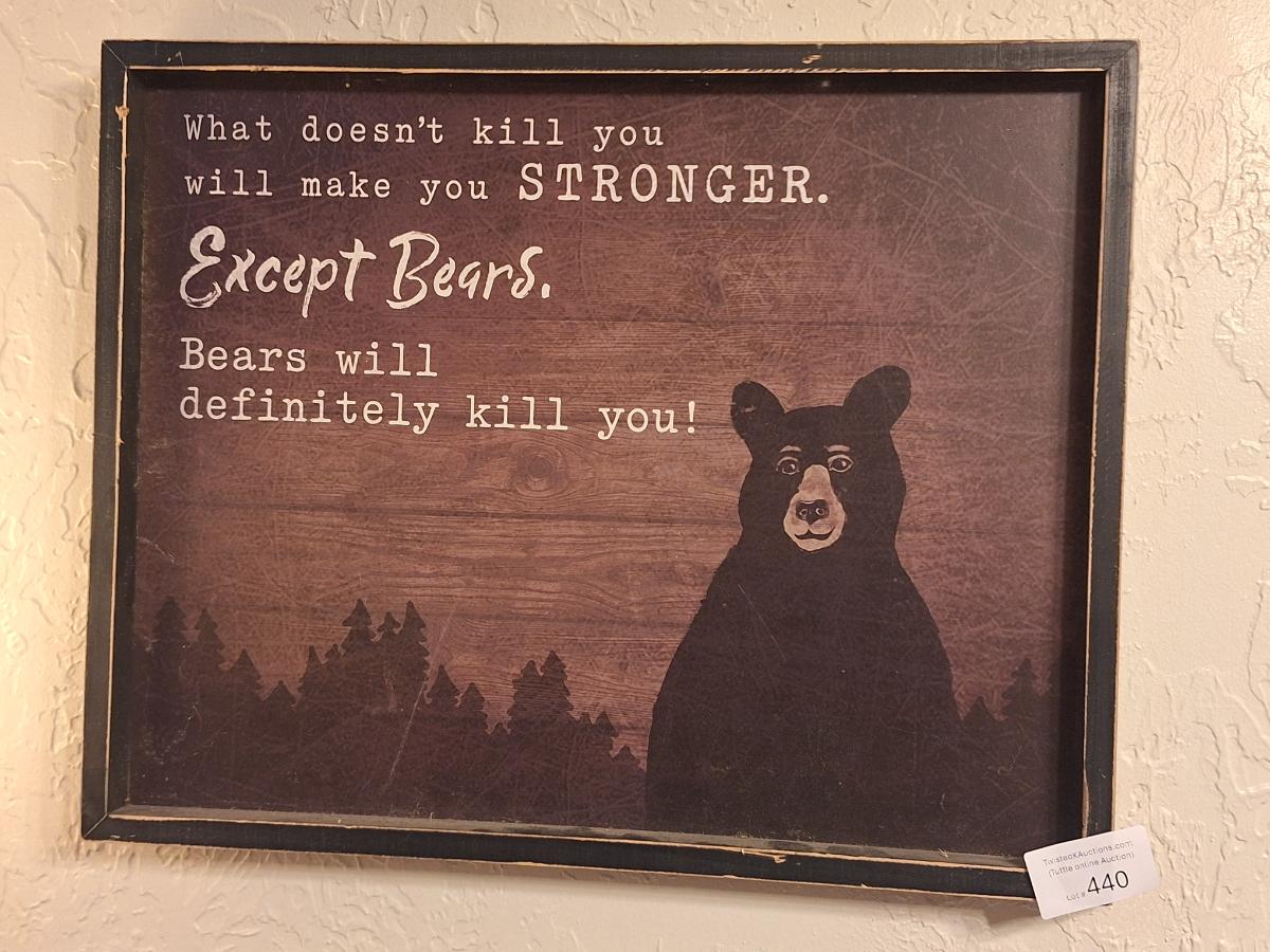 framed wooden sign with a bear illustration and the text "What doesn't kill you will make you STRONGER. Except Bears. Bears will definitely kill you!"