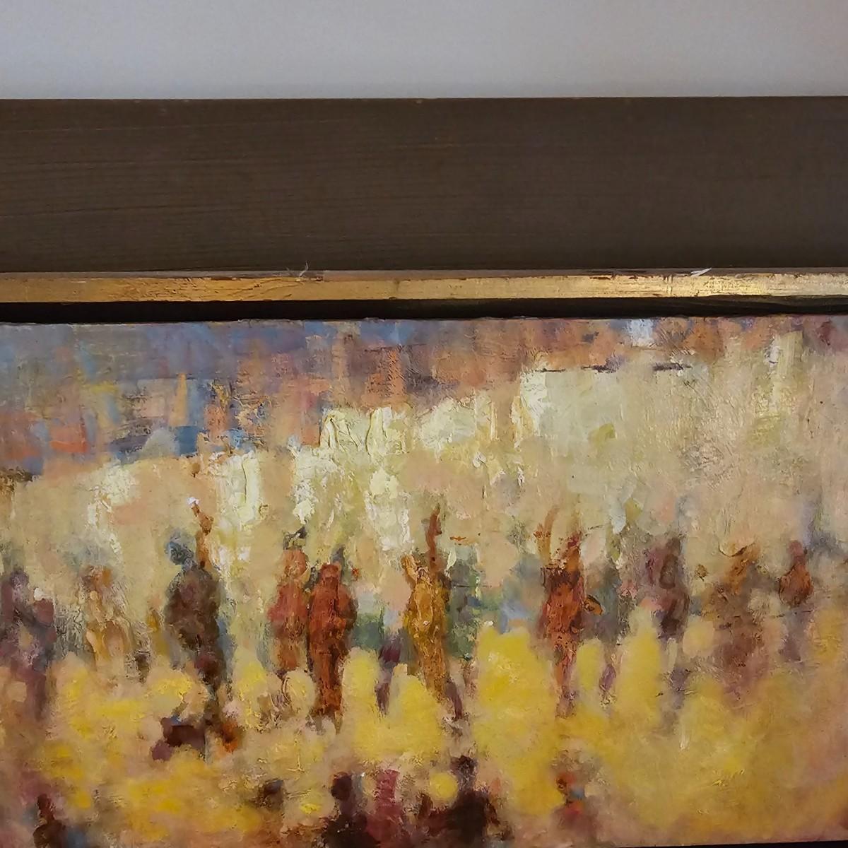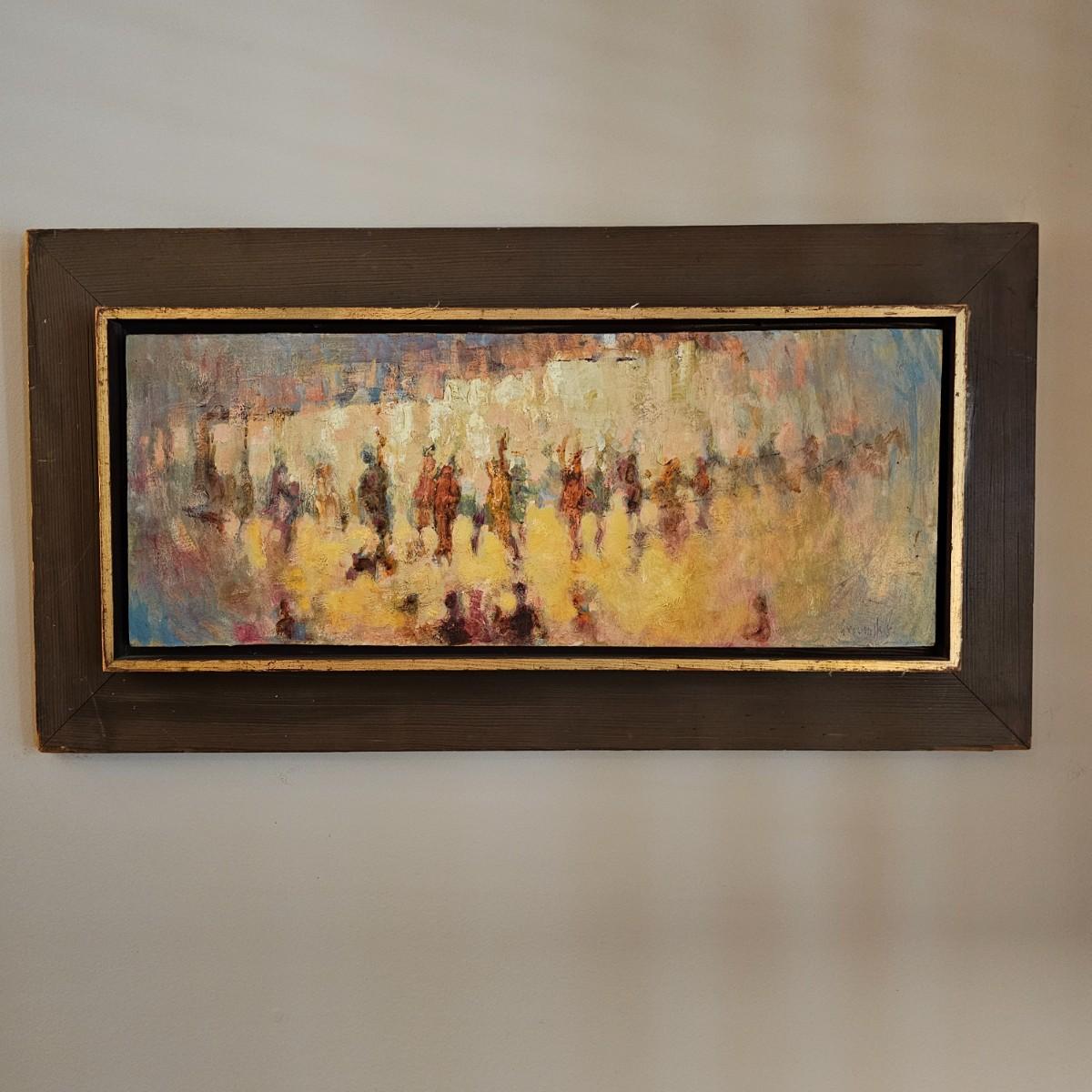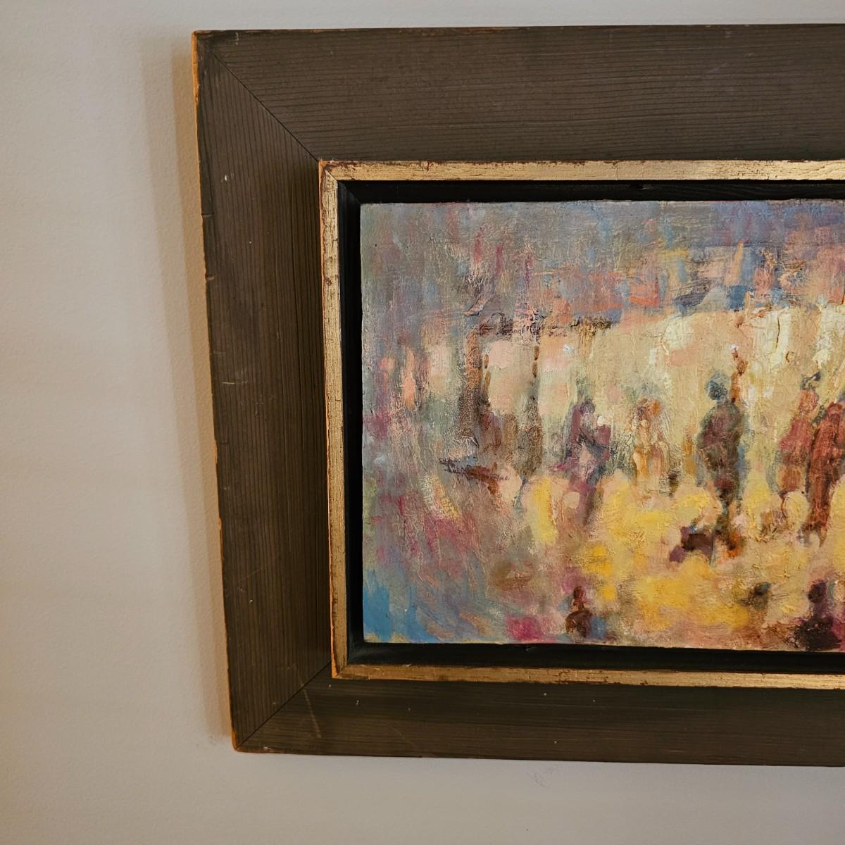 This image is signed 'Grodensky', indicating artist Samuel Grodensky. Frame measures 33" x 17"H. Wood framed on second wood backing. Indistinct line of figures move across a background, others gather in the foreground. Grodensky painted images sometimes based on his Hasidic background growing up in Brooklyn. Shipping available. Shipping can be costly. We suggest contacting our preferred local shipping provider, Postage Express, with dimensions and getting an estimate before bidding: (828) 255-9250 or shipping@postageexpressnc.com.