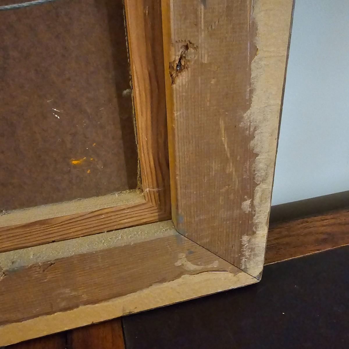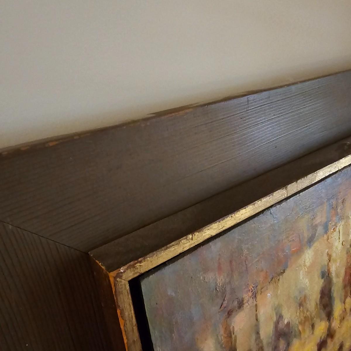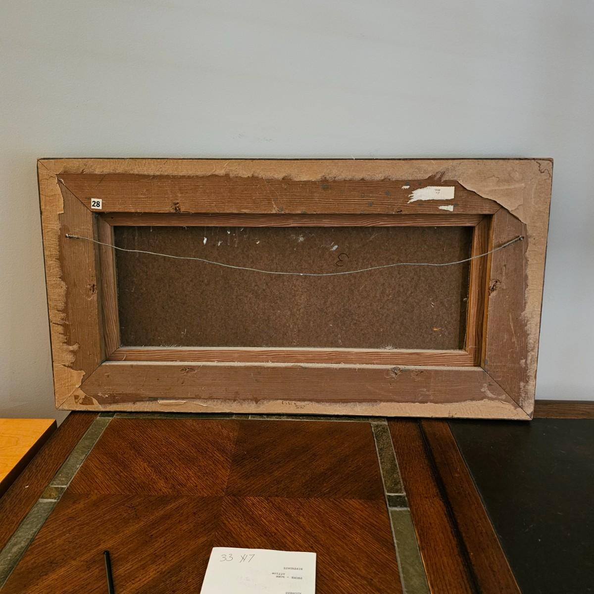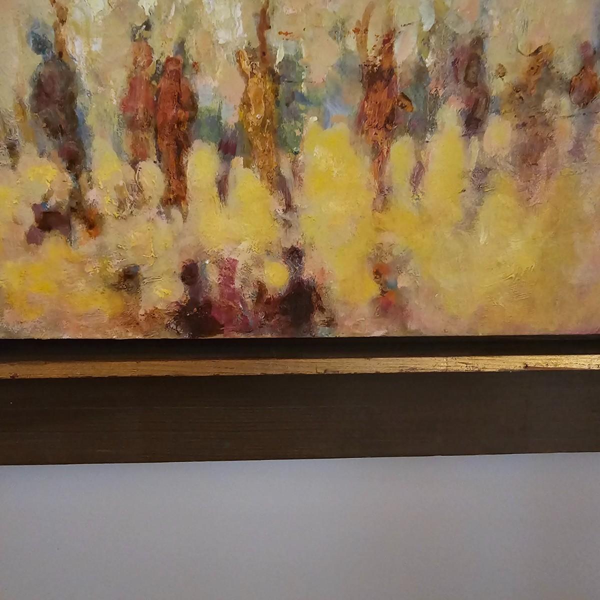 This image is signed 'Grodensky', indicating artist Samuel Grodensky. Frame measures 33" x 17"H. Wood framed on second wood backing. Indistinct line of figures move across a background, others gather in the foreground. Grodensky painted images sometimes based on his Hasidic background growing up in Brooklyn. Shipping available. Shipping can be costly. We suggest contacting our preferred local shipping provider, Postage Express, with dimensions and getting an estimate before bidding: (828) 255-9250 or shipping@postageexpressnc.com.