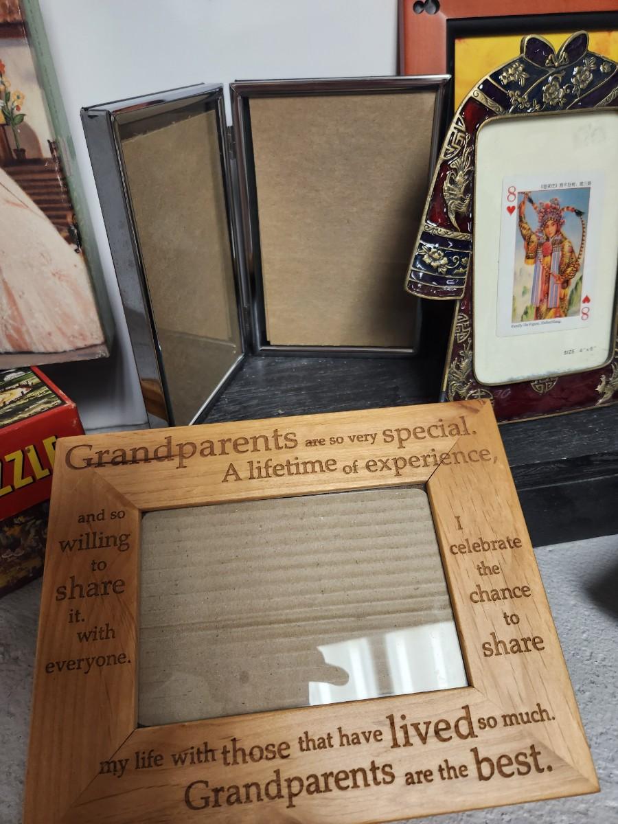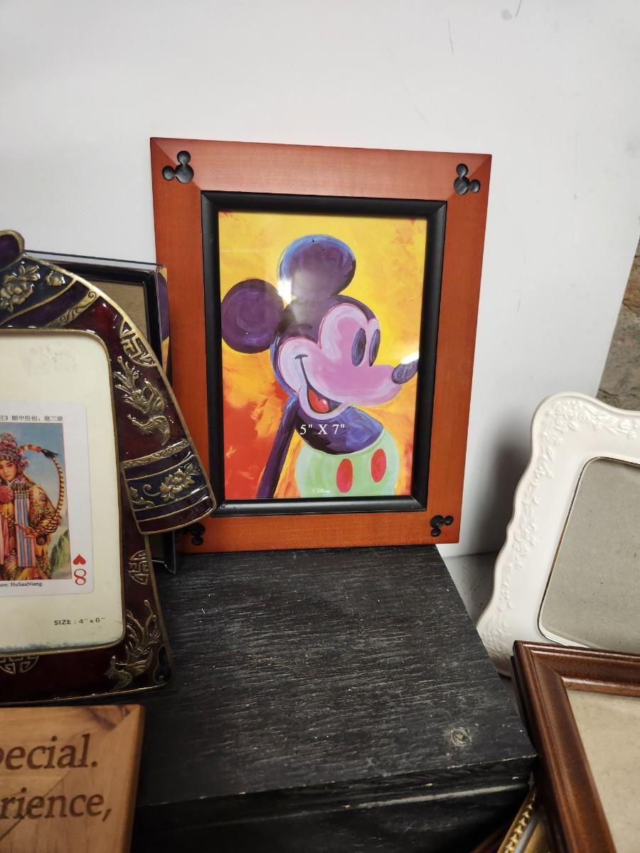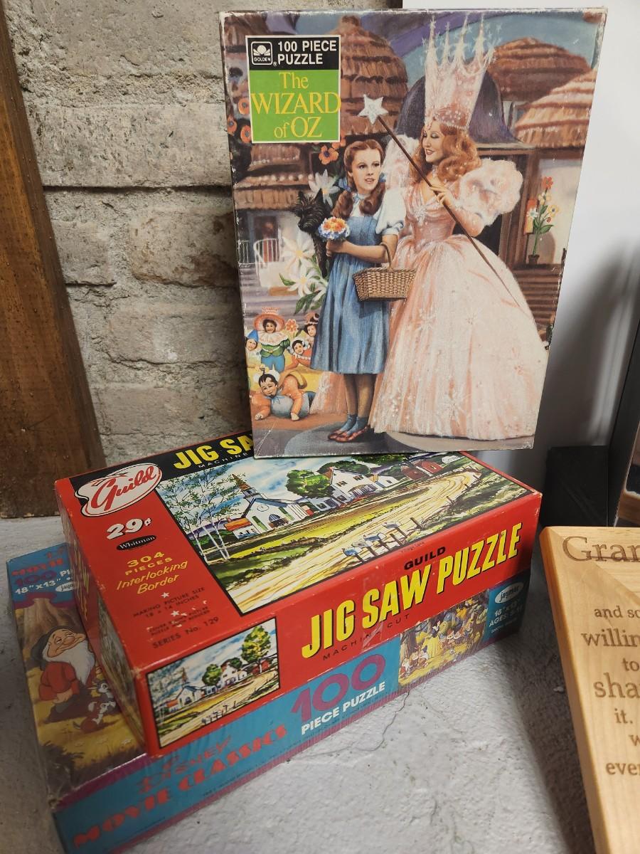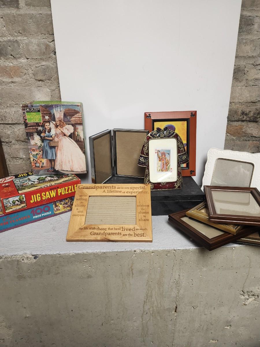 Vintage puzzles and 9 new frames. 2 never used Disney frames, one porcelain frame plus others.
