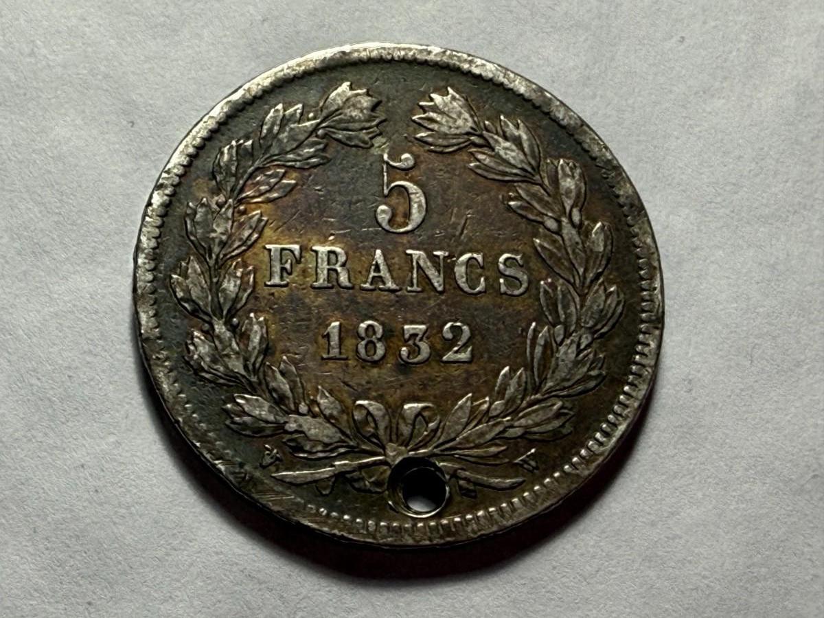FRANCE 1832 Louis Philippe I French Silver 5 Francs Coin Holed (.900 Silver ASW), as Pictured.