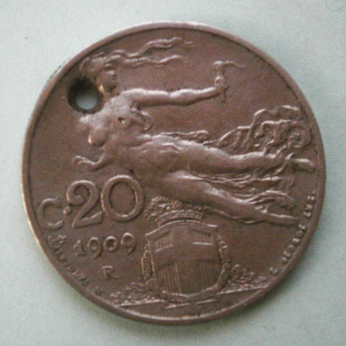 FRANCE 1909 (20) Centimes Coin, has hole
