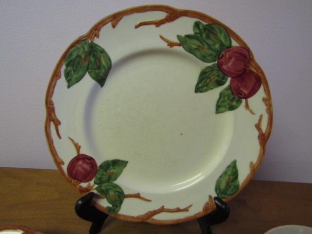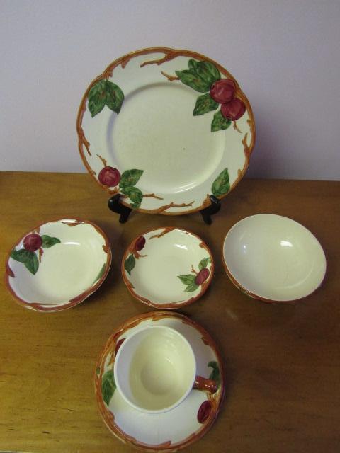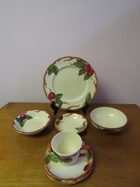 Franciscan Dinnerware by Gladding McBean & Co.- Apple Pattern. 8 dinner plates (9 1/2 inch), 7 bread plates, 9 cups and saucers, 8 berry bowls, 7 cereal bowls, 7 oatmeal bowls.