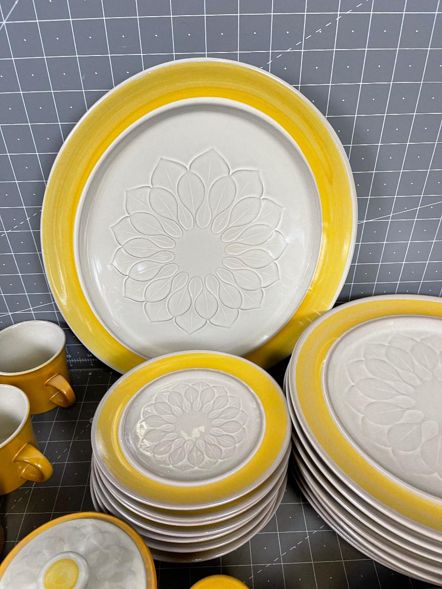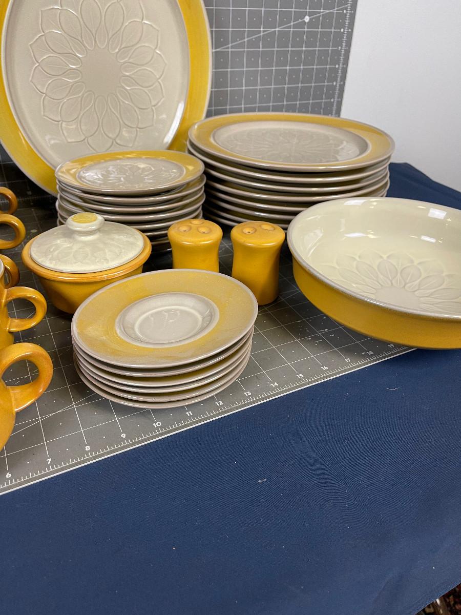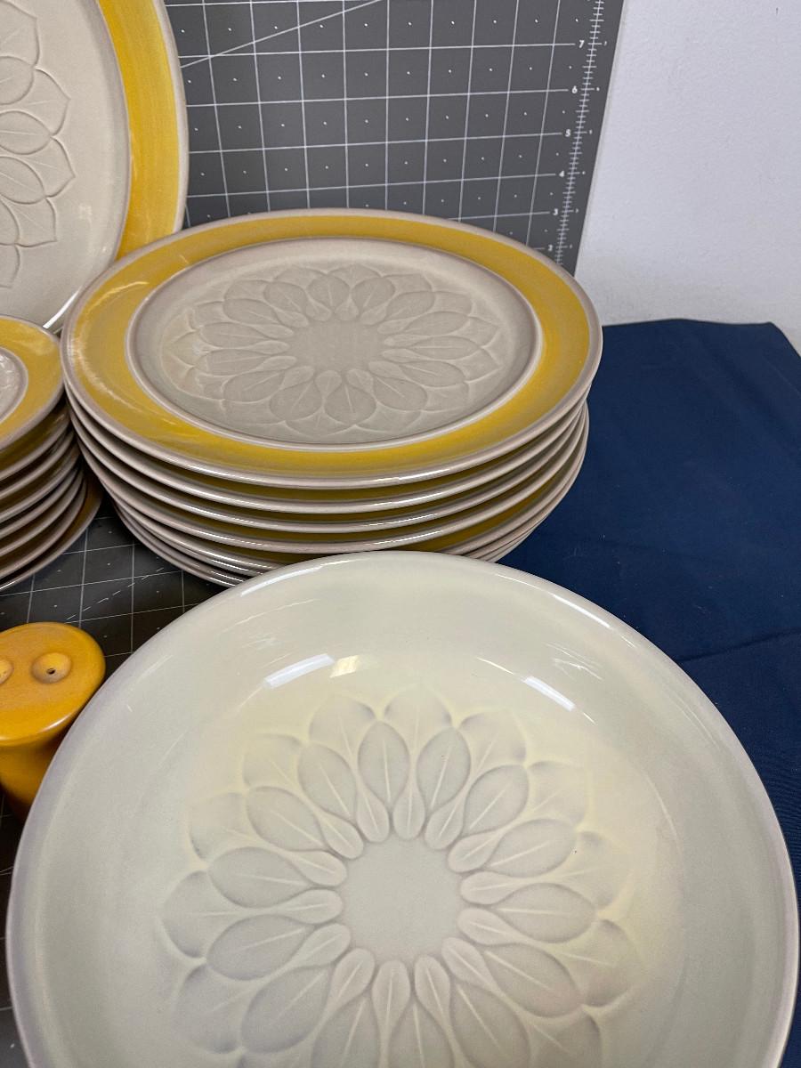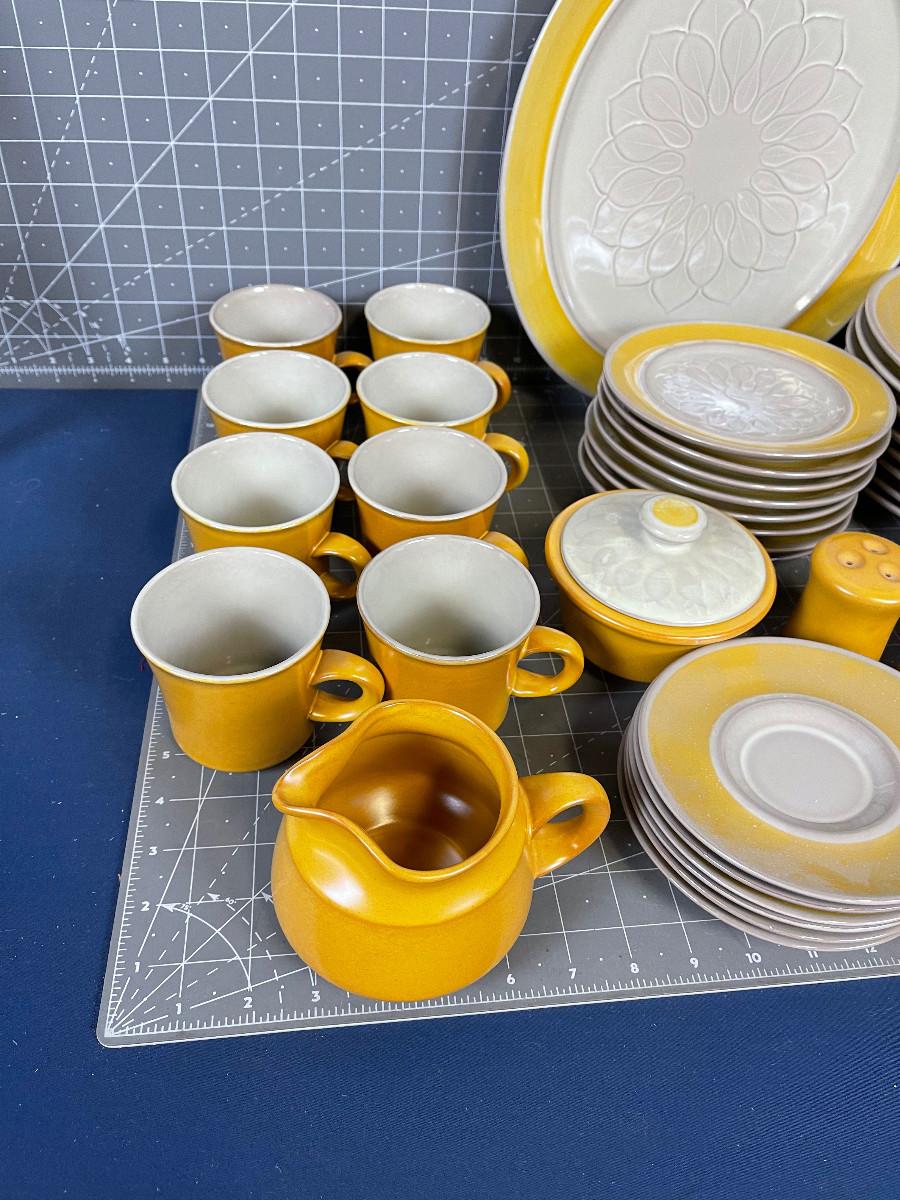 Dinner Plates, Cups and Saucer, Salad Plate, Platter, Serving Bowl S & P, Cream and Sugar. Excellent Condition. A few chips on plates. AWESOME STYLE !!! Mid Century Modern for sure!!!