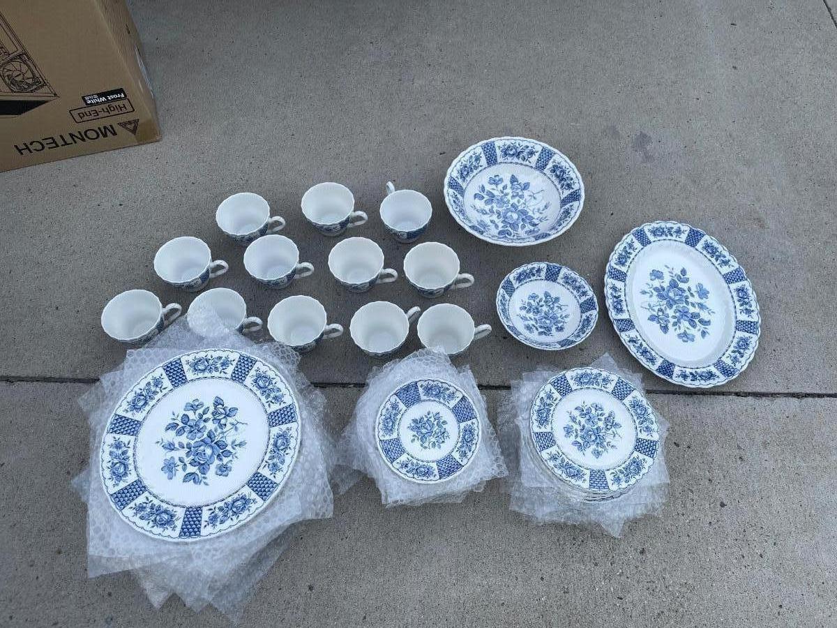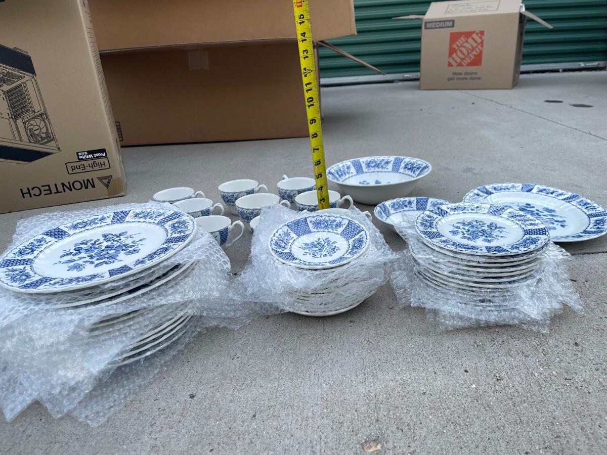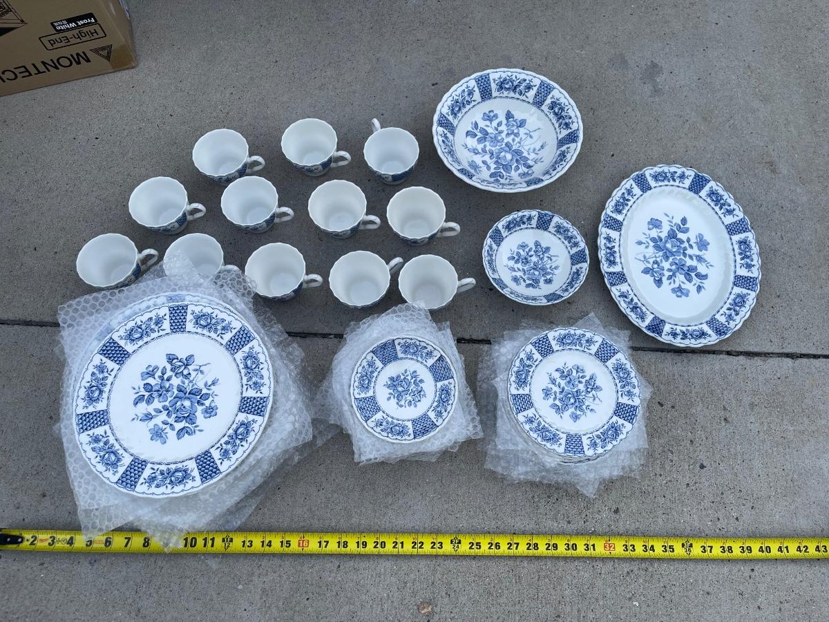 Franciscan "Melody" Dinnerware Set (57 pieces total). 14 place settings including dinner plate, side plate, cup and saucer. Missing 2 cups, 12 total. Also includes 1 platter, 1 serving bowl, and 1 small bowl. A few small chips here and there, but mostly in good condition.