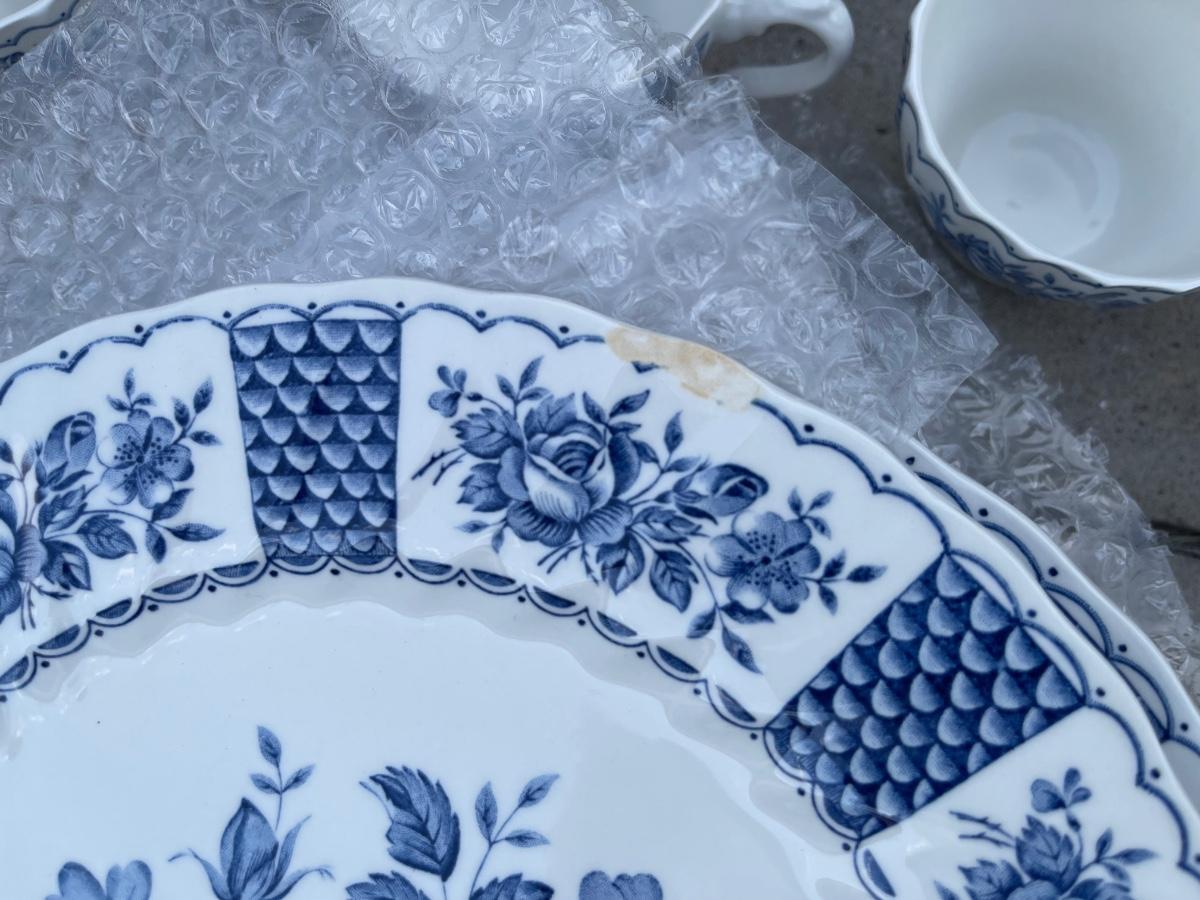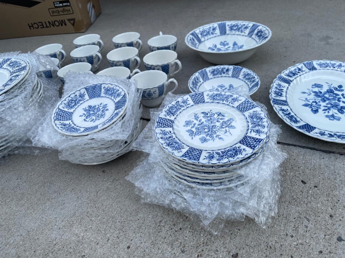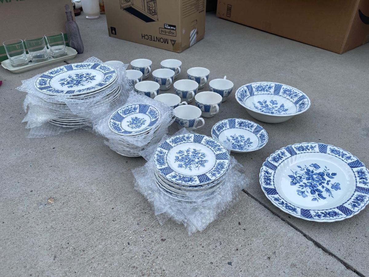 Franciscan "Melody" Dinnerware Set (57 pieces total). 14 place settings including dinner plate, side plate, cup and saucer. Missing 2 cups, 12 total. Also includes 1 platter, 1 serving bowl, and 1 small bowl. A few small chips here and there, but mostly in good condition.