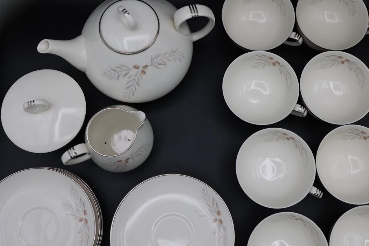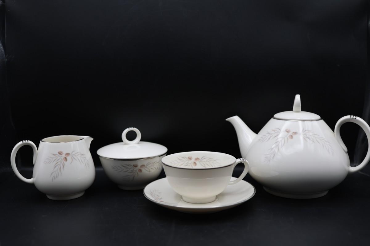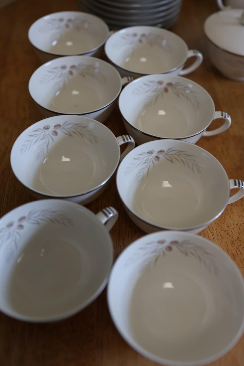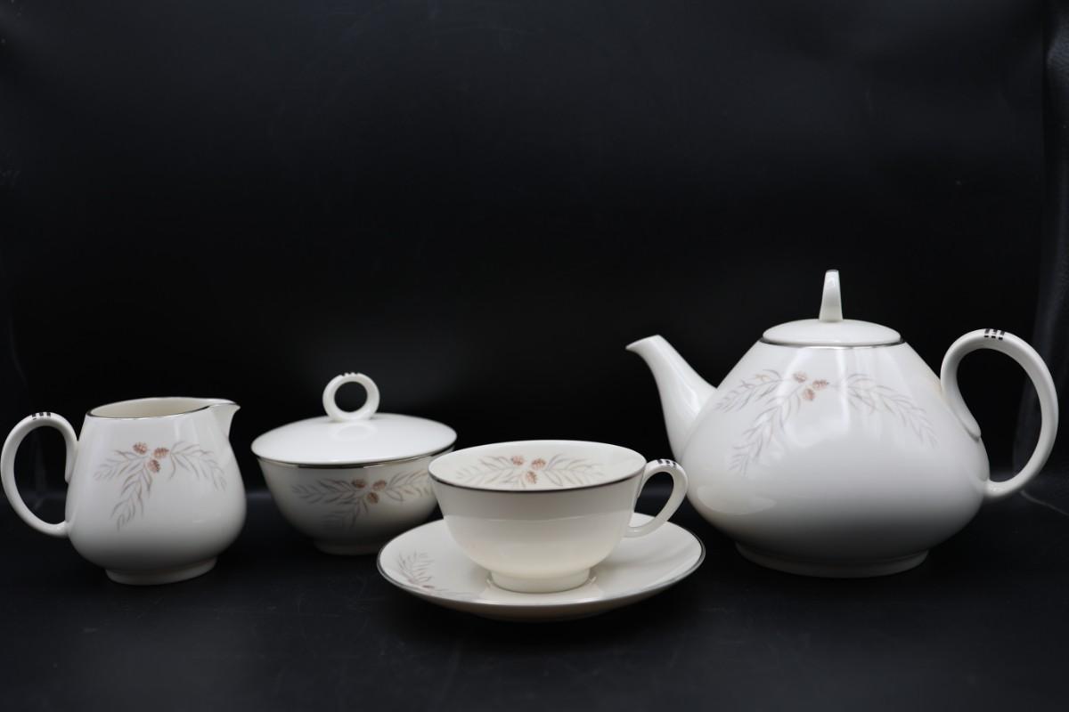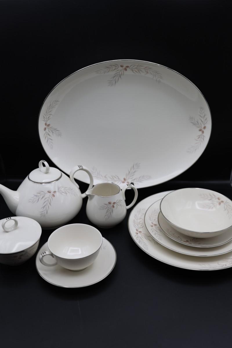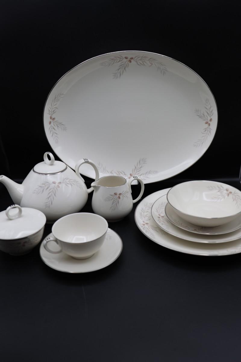 (8) cups, (8) saucers, (8) dinner plates, (8) bowls, (8) salad plates, (8) bread and butter plates, (1) 12.5" oval serving platter, (1) 15" oval serving platter, (1) 8" vegetable bowl, (1) teapot and lid, (1) creamer and (1) sugar bowl and lid