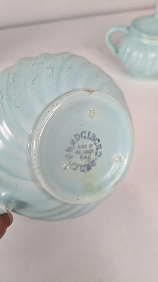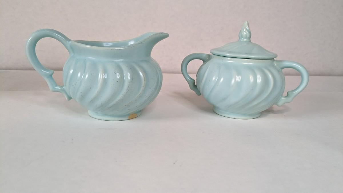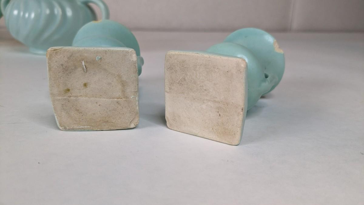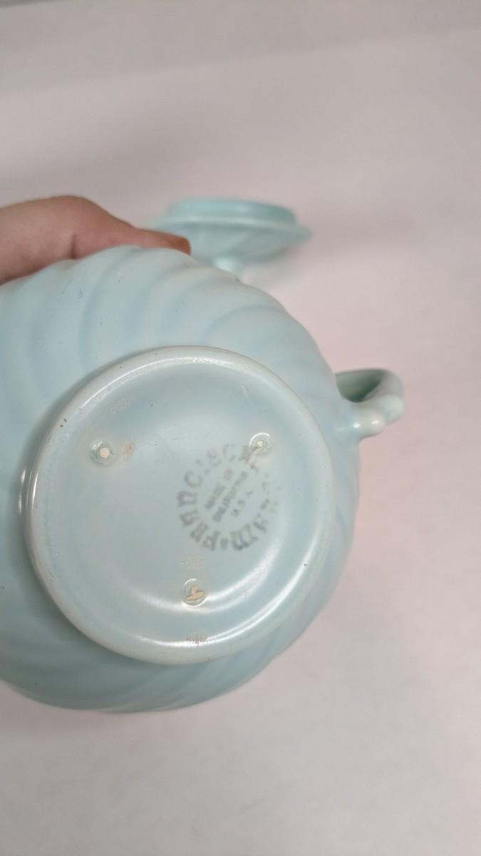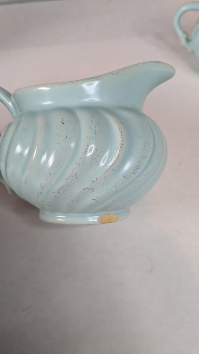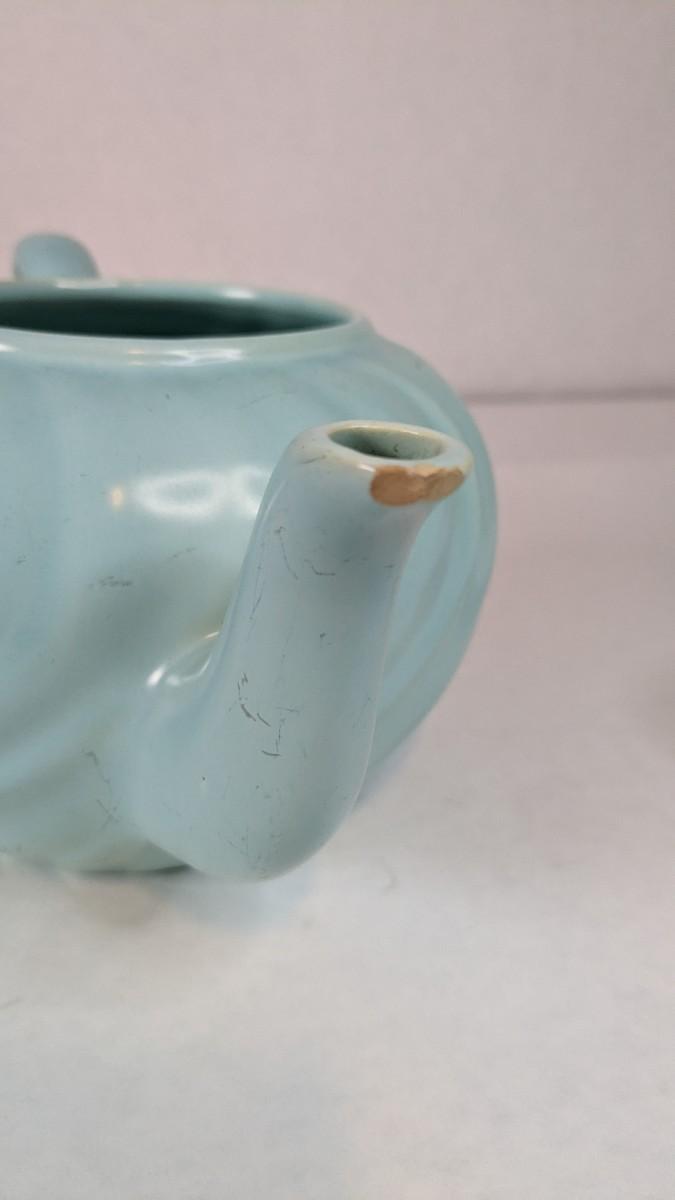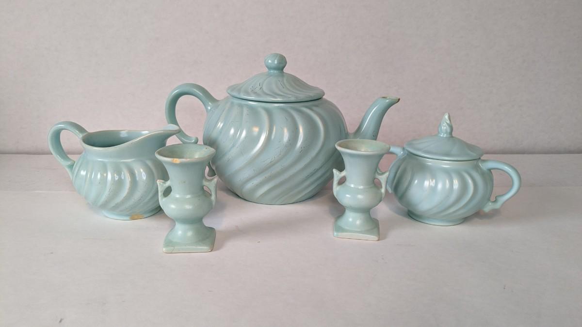 6 pieces including teapot, cream & sugar, and 2 small bud vases. Each piece show signs of wear and/or light chipping. note in photos.