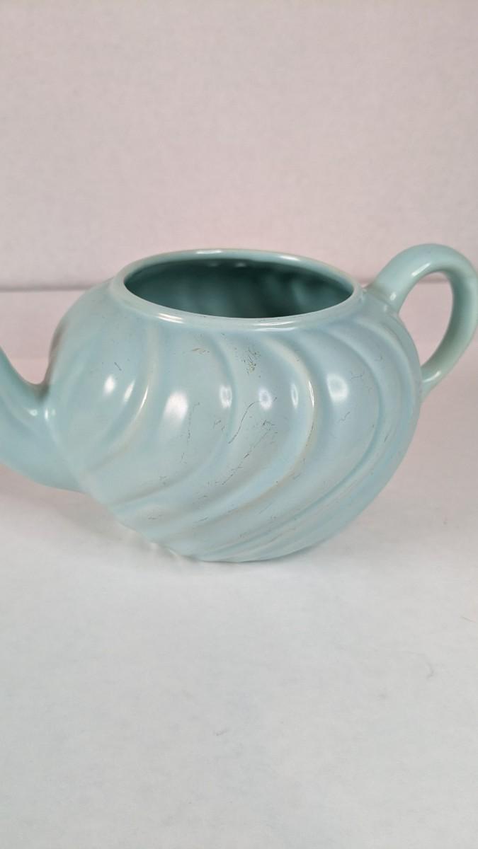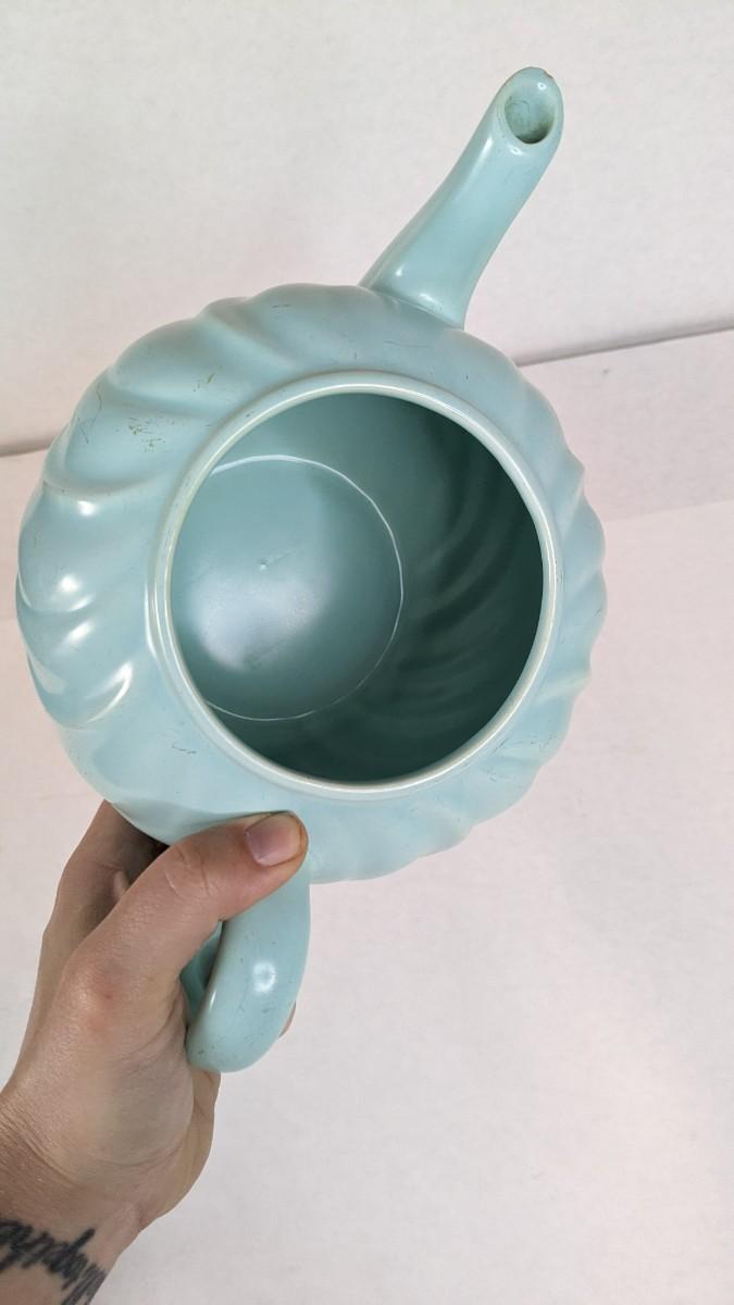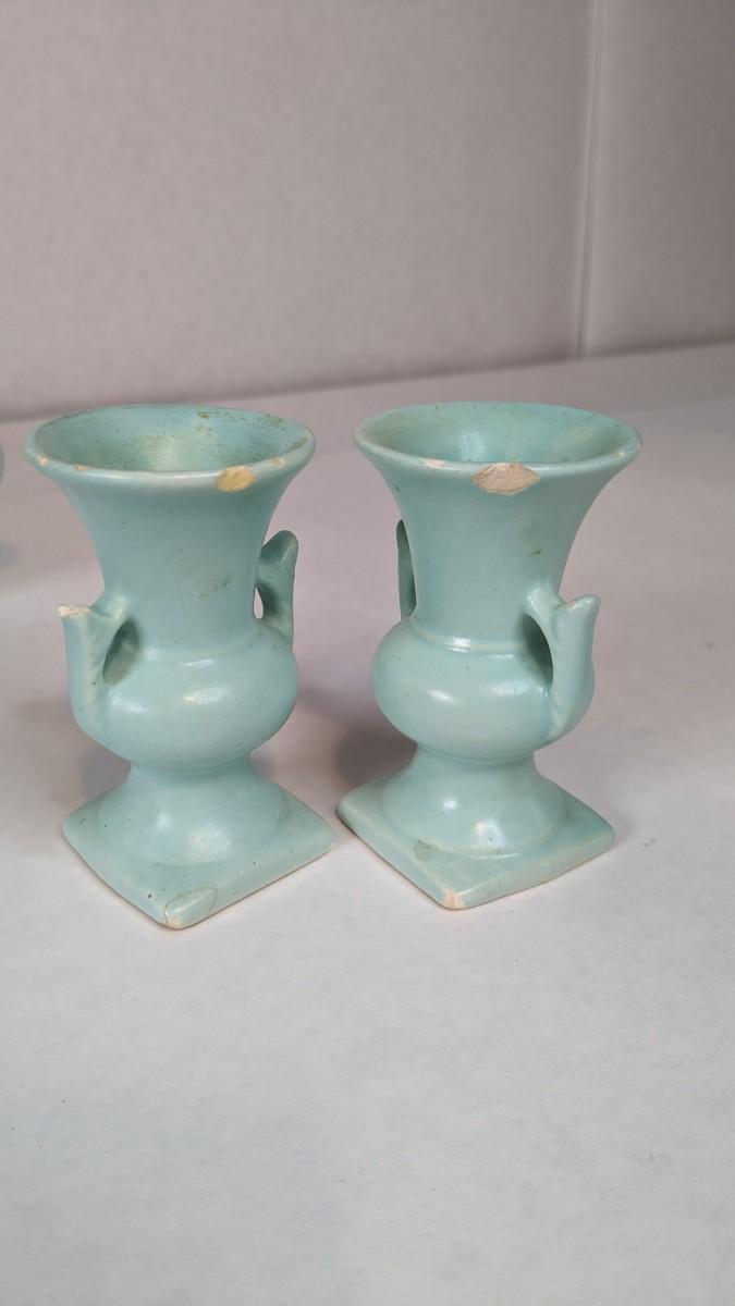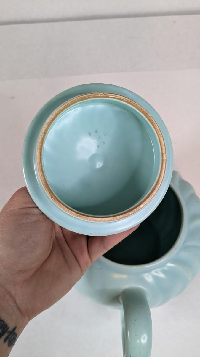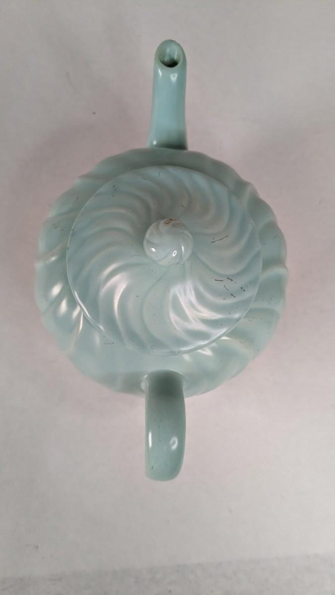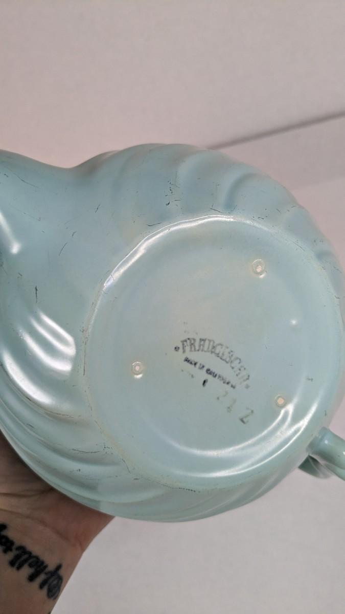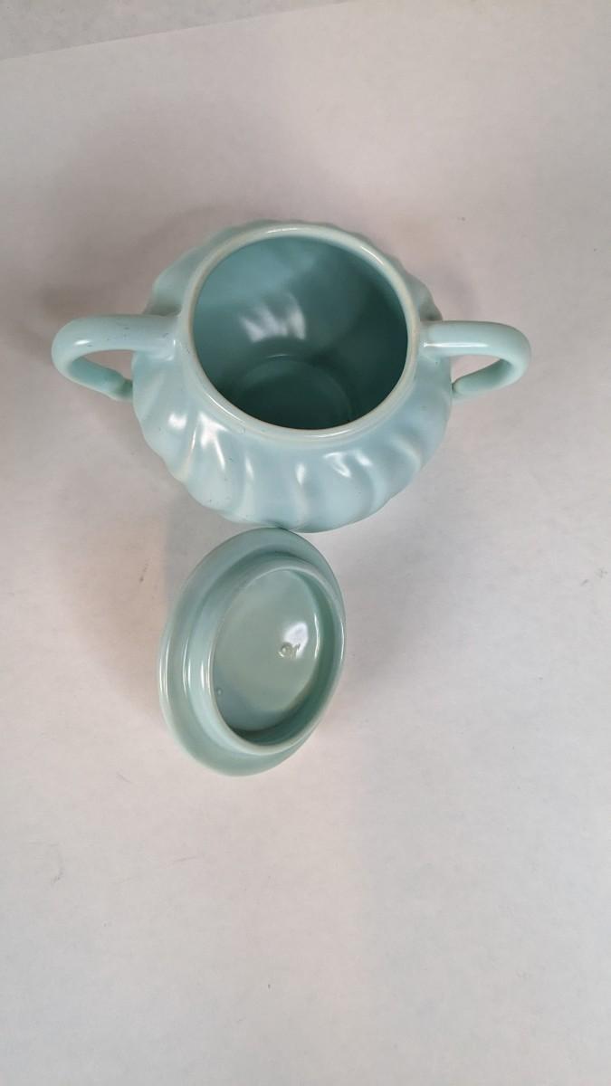 6 pieces including teapot, cream & sugar, and 2 small bud vases. Each piece show signs of wear and/or light chipping. note in photos.