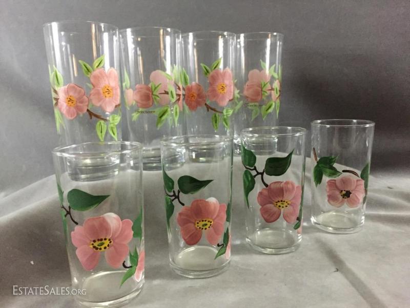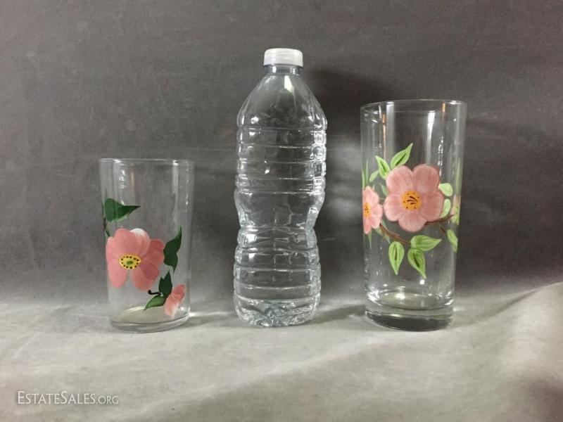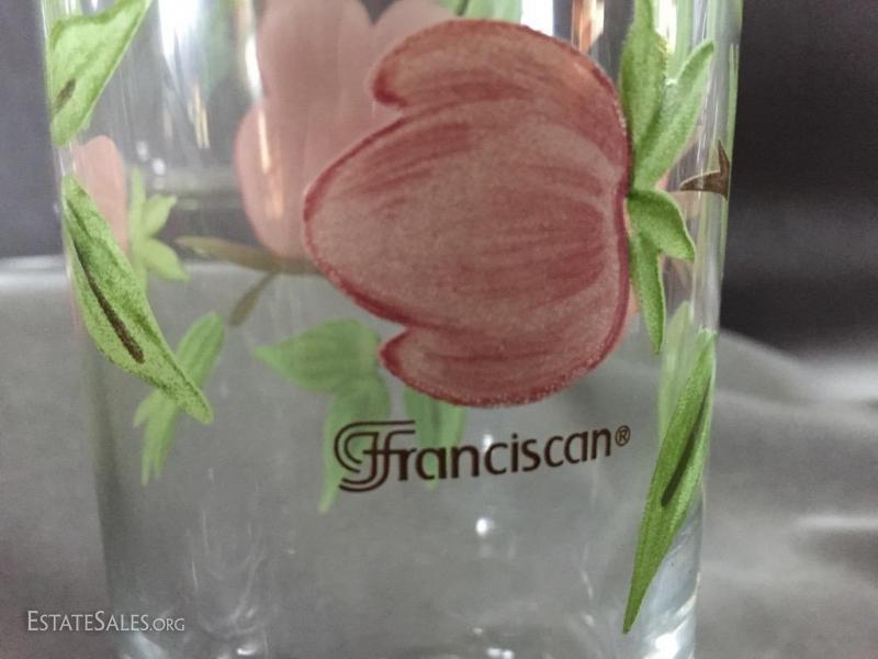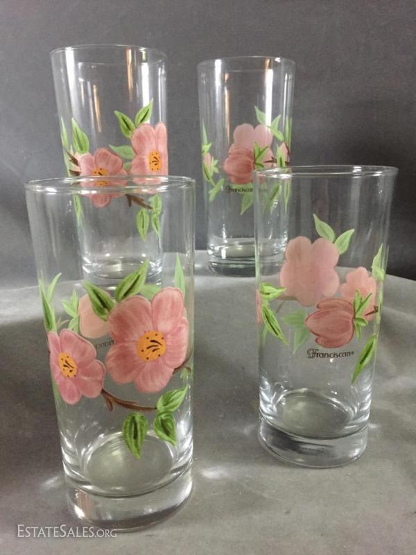 Franciscan ware drinking glasses: (4) pink Desert Rose water glasses, & plus (4) Hand-painted Desert Rose look-alikes, tallest 6.5"