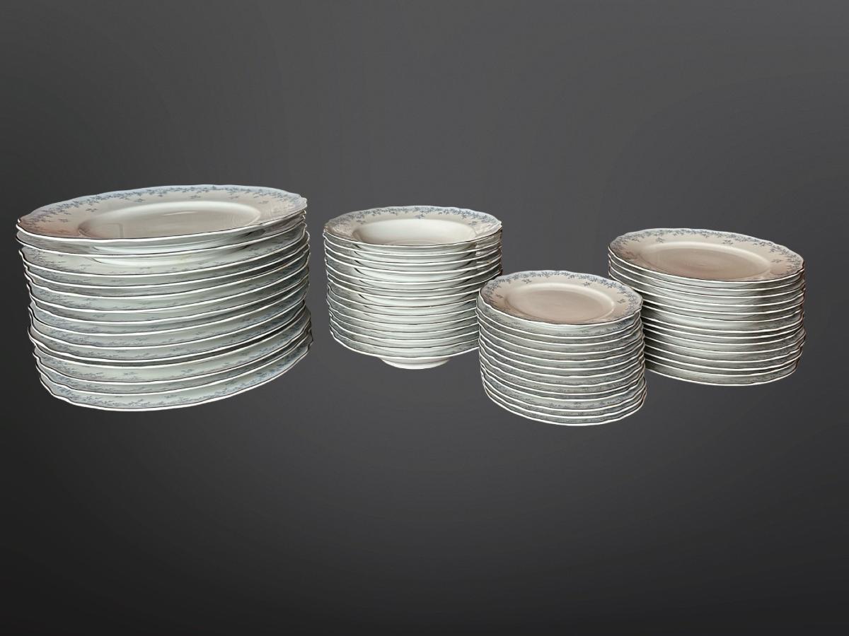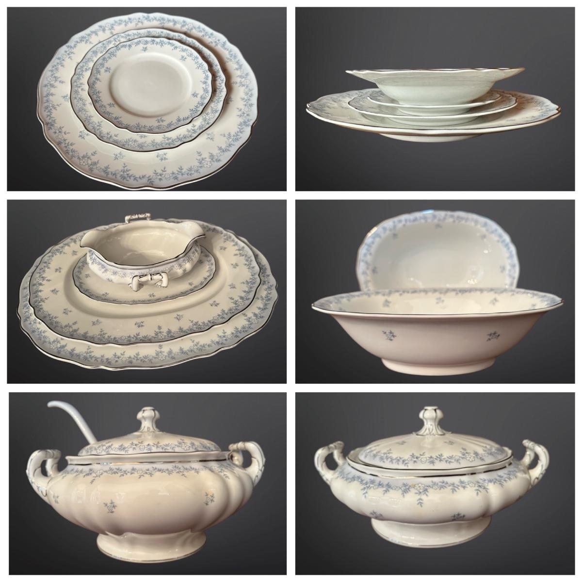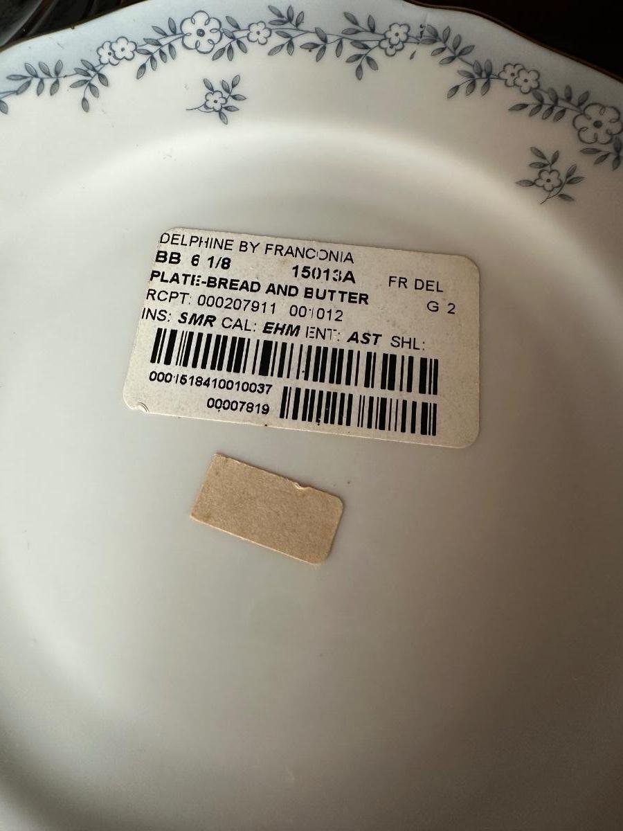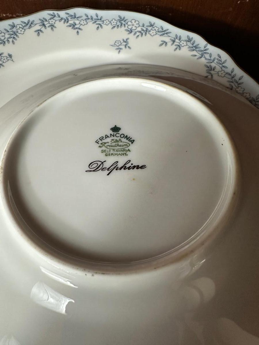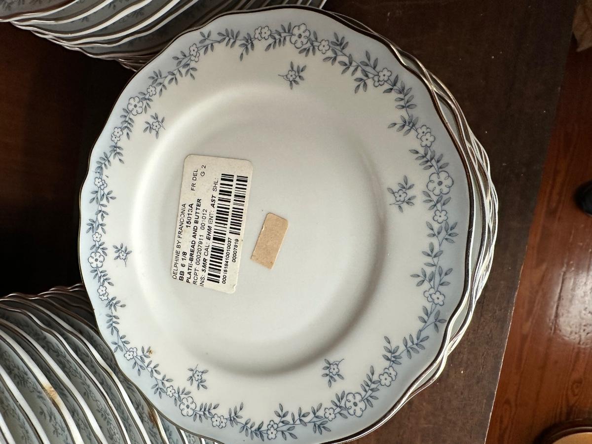 Franconia “Delphine” fine china set, made in Germany, featuring a soft blue floral pattern with silver trim, some unused. Complete place settings for 14, including: