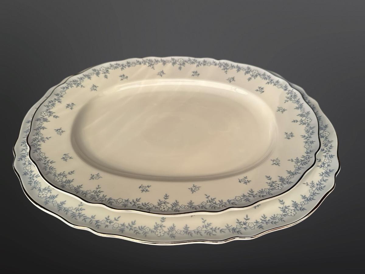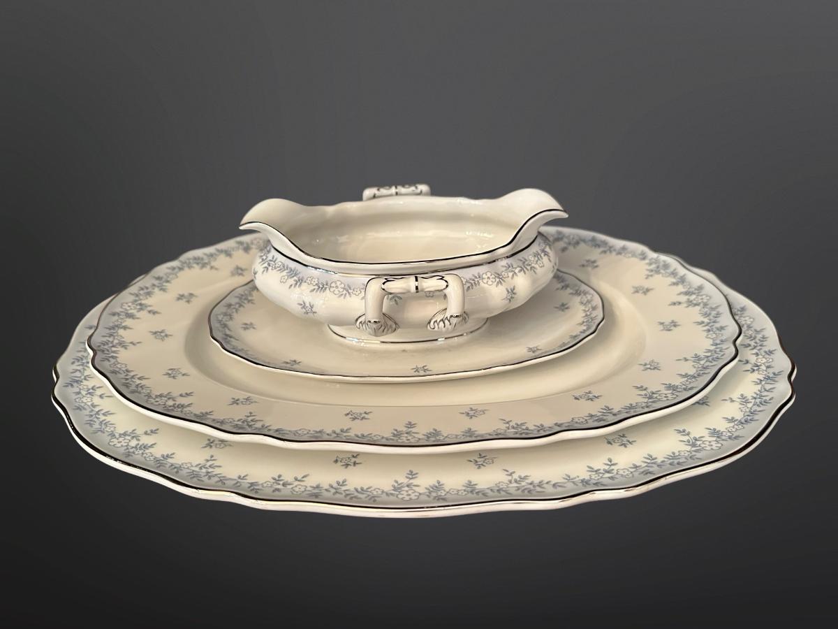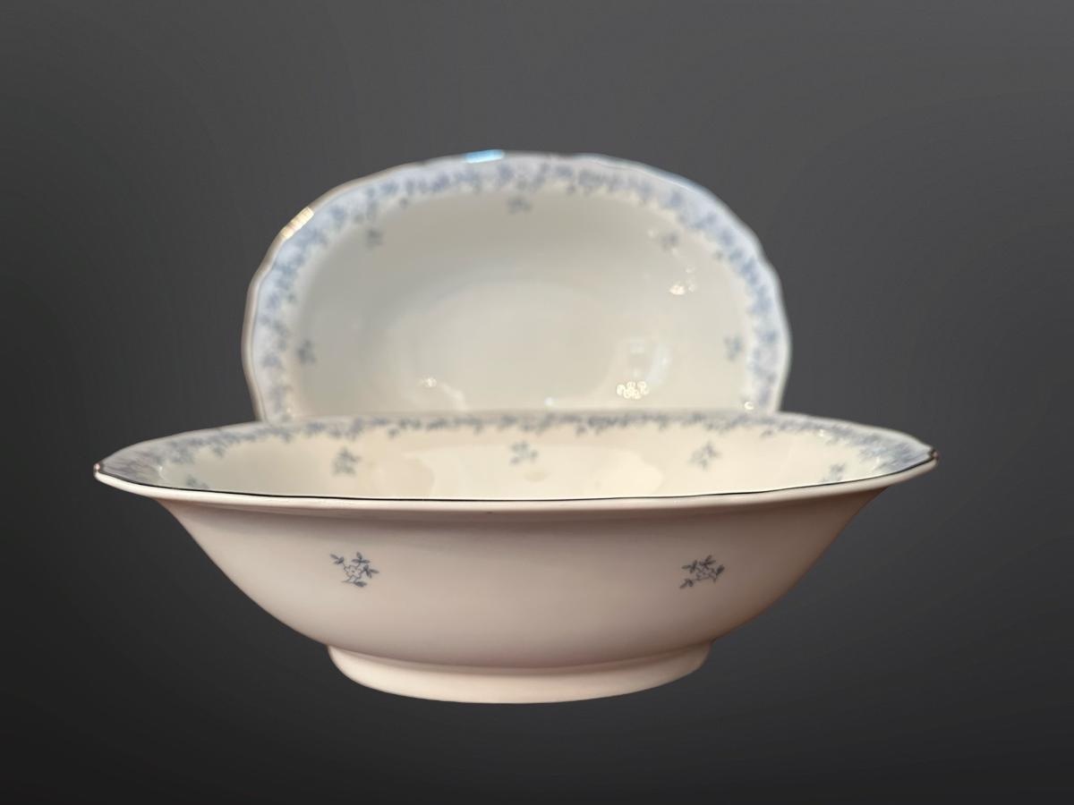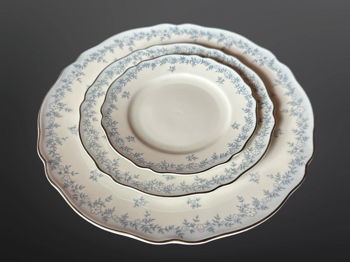 Franconia “Delphine” fine china set, made in Germany, featuring a soft blue floral pattern with silver trim, some unused. Complete place settings for 14, including: