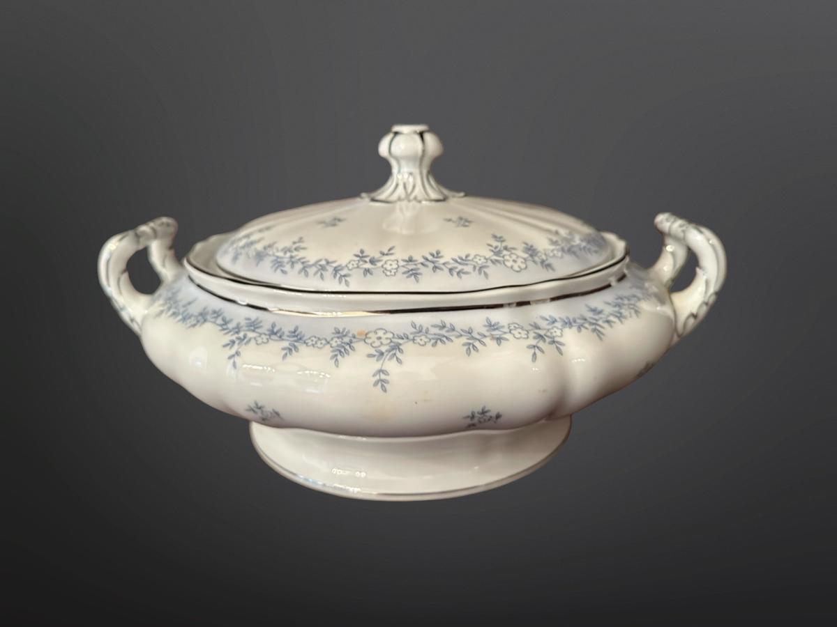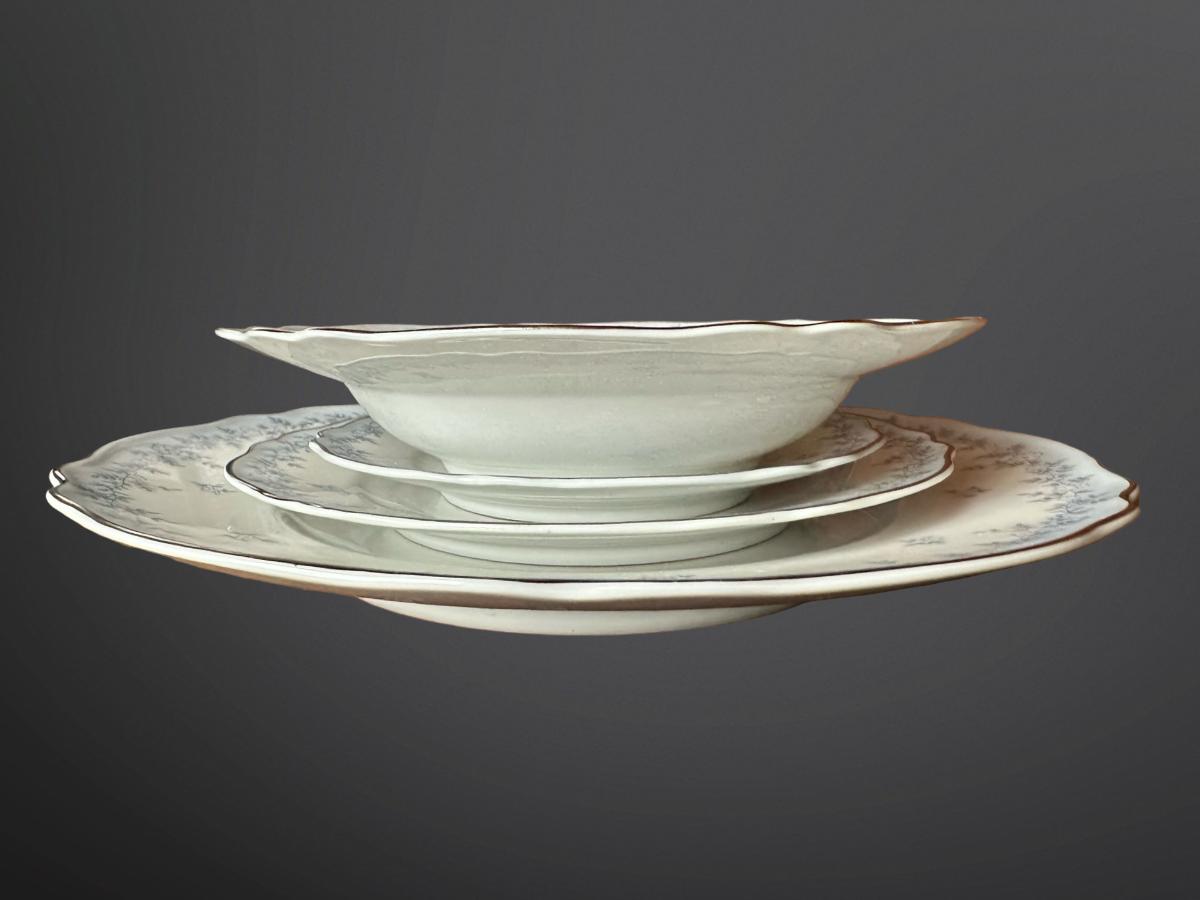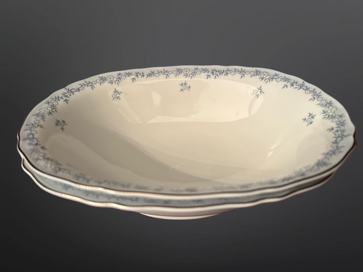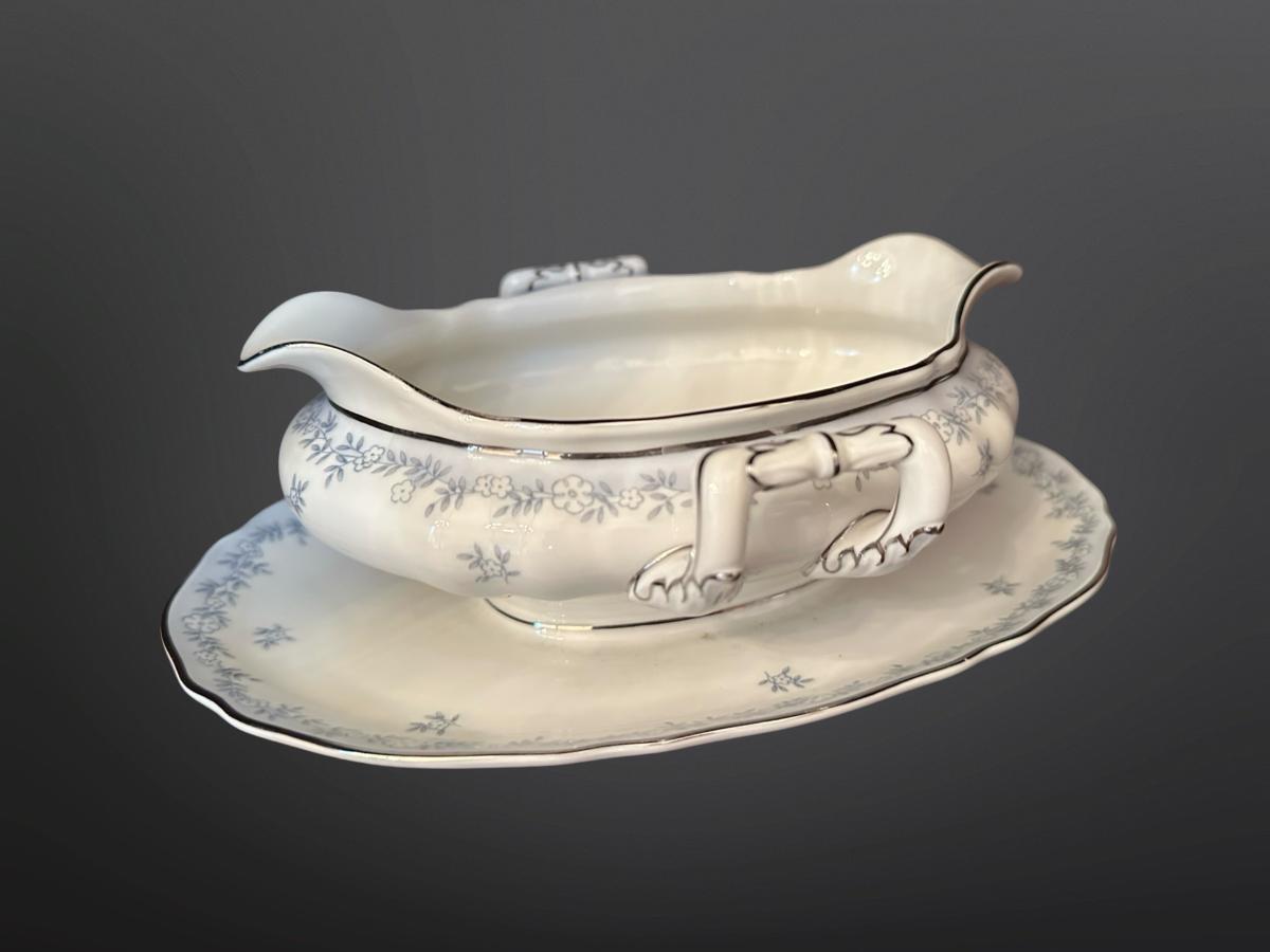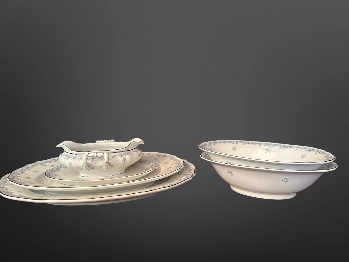 Franconia “Delphine” fine china set, made in Germany, featuring a soft blue floral pattern with silver trim, some unused. Complete place settings for 14, including: