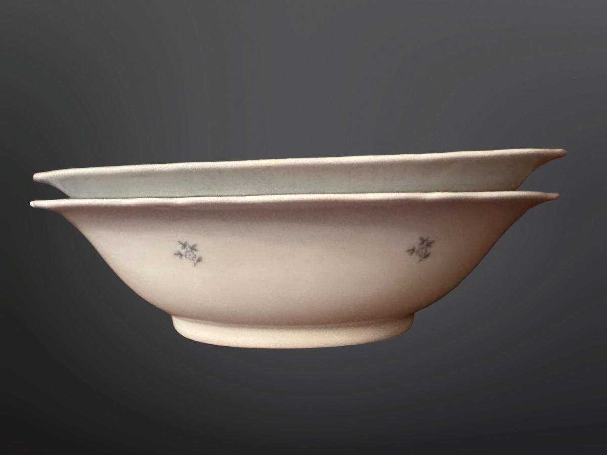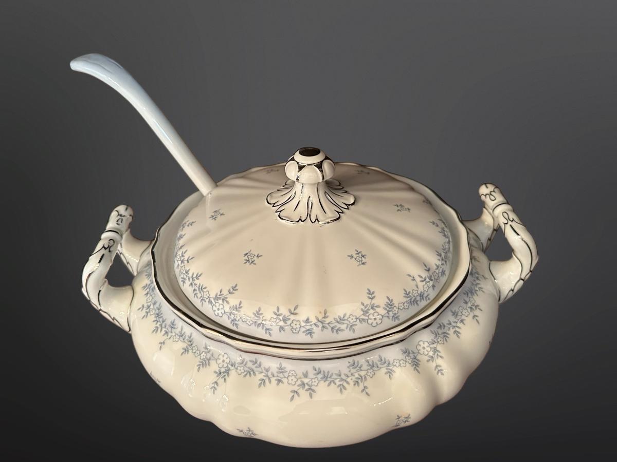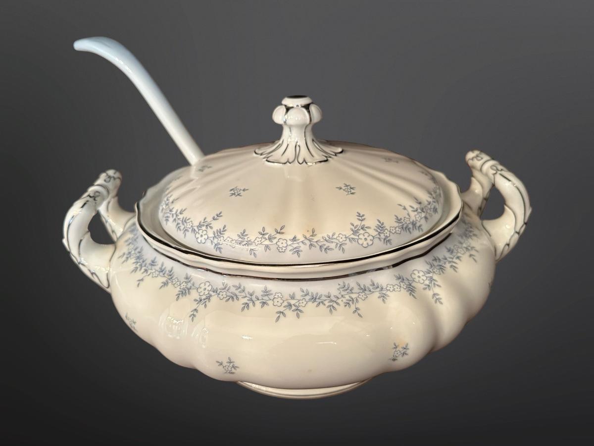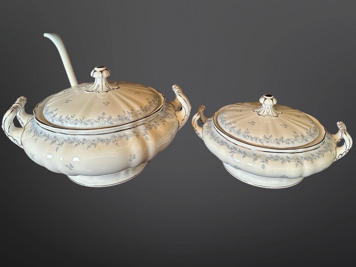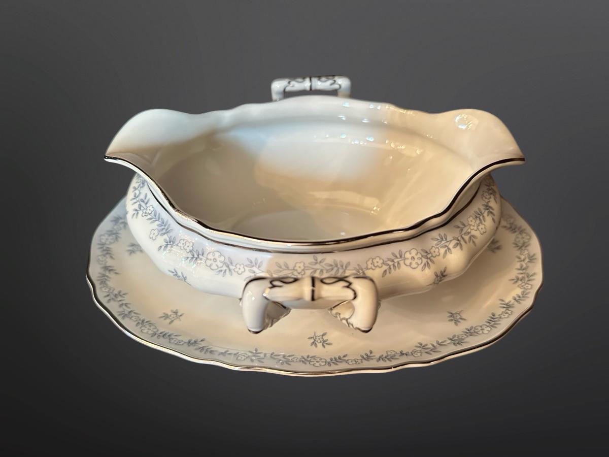 Franconia “Delphine” fine china set, made in Germany, featuring a soft blue floral pattern with silver trim, some unused. Complete place settings for 14, including:
