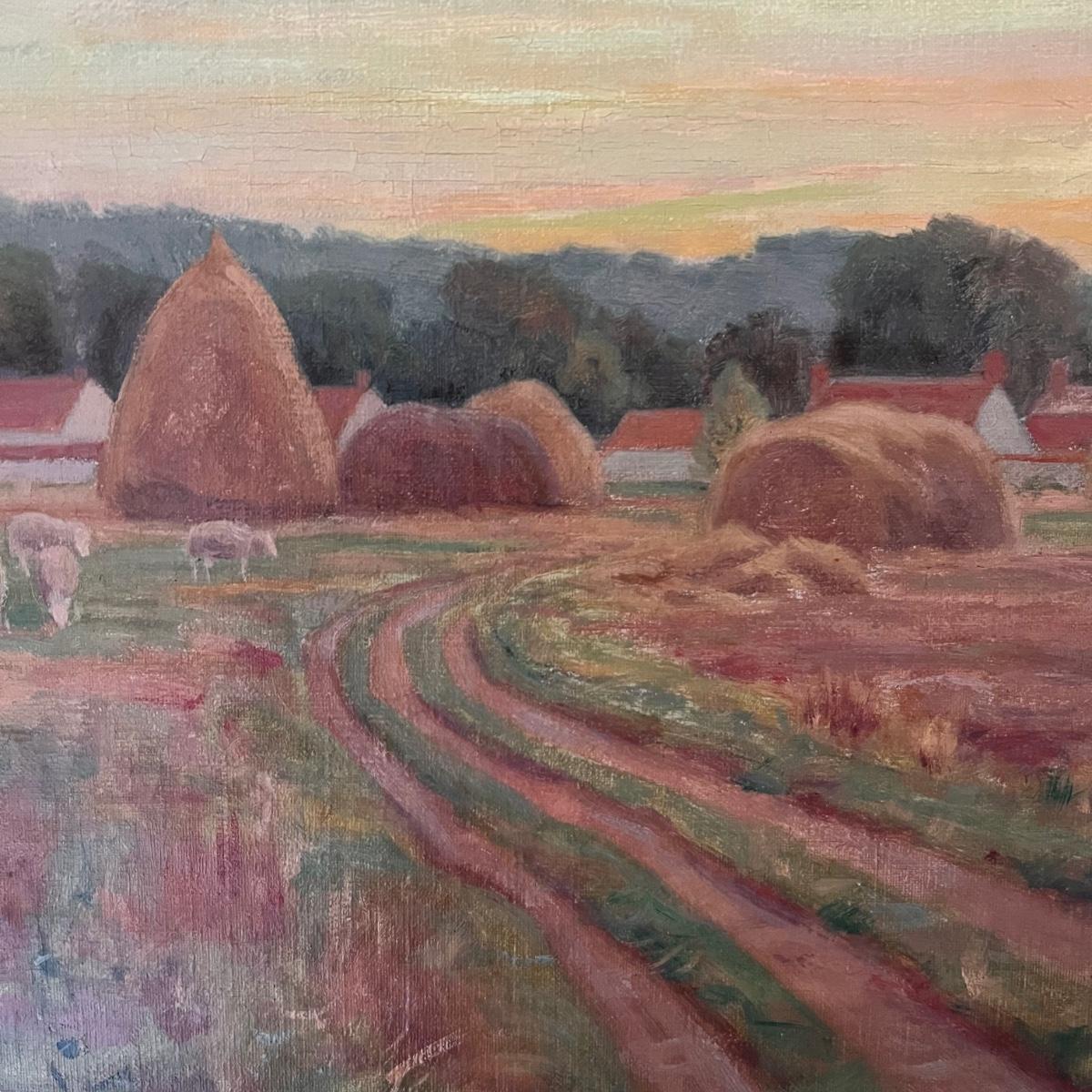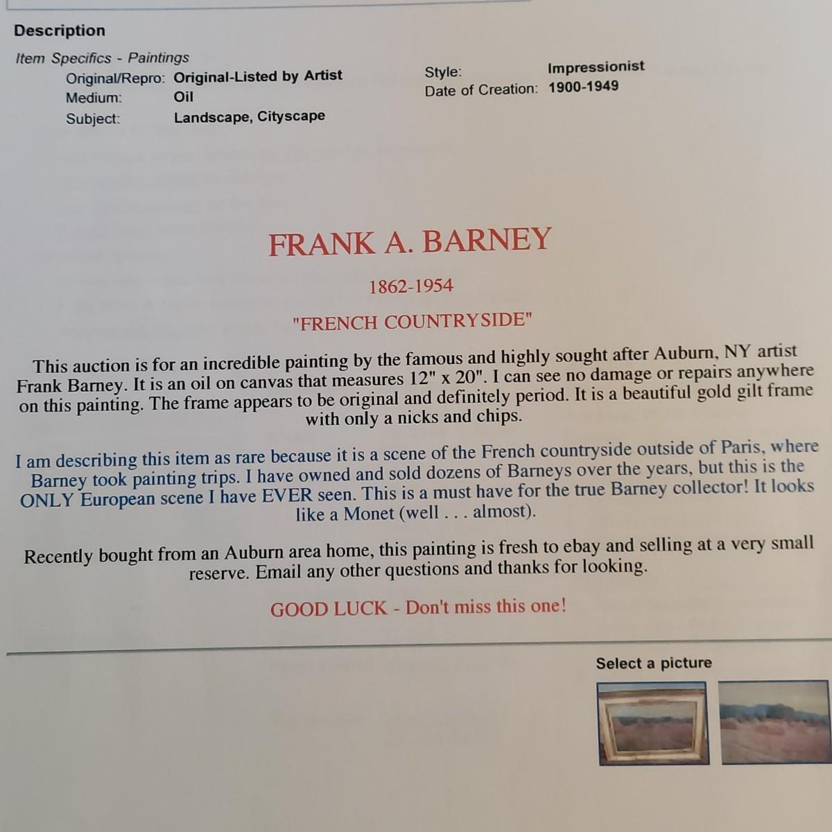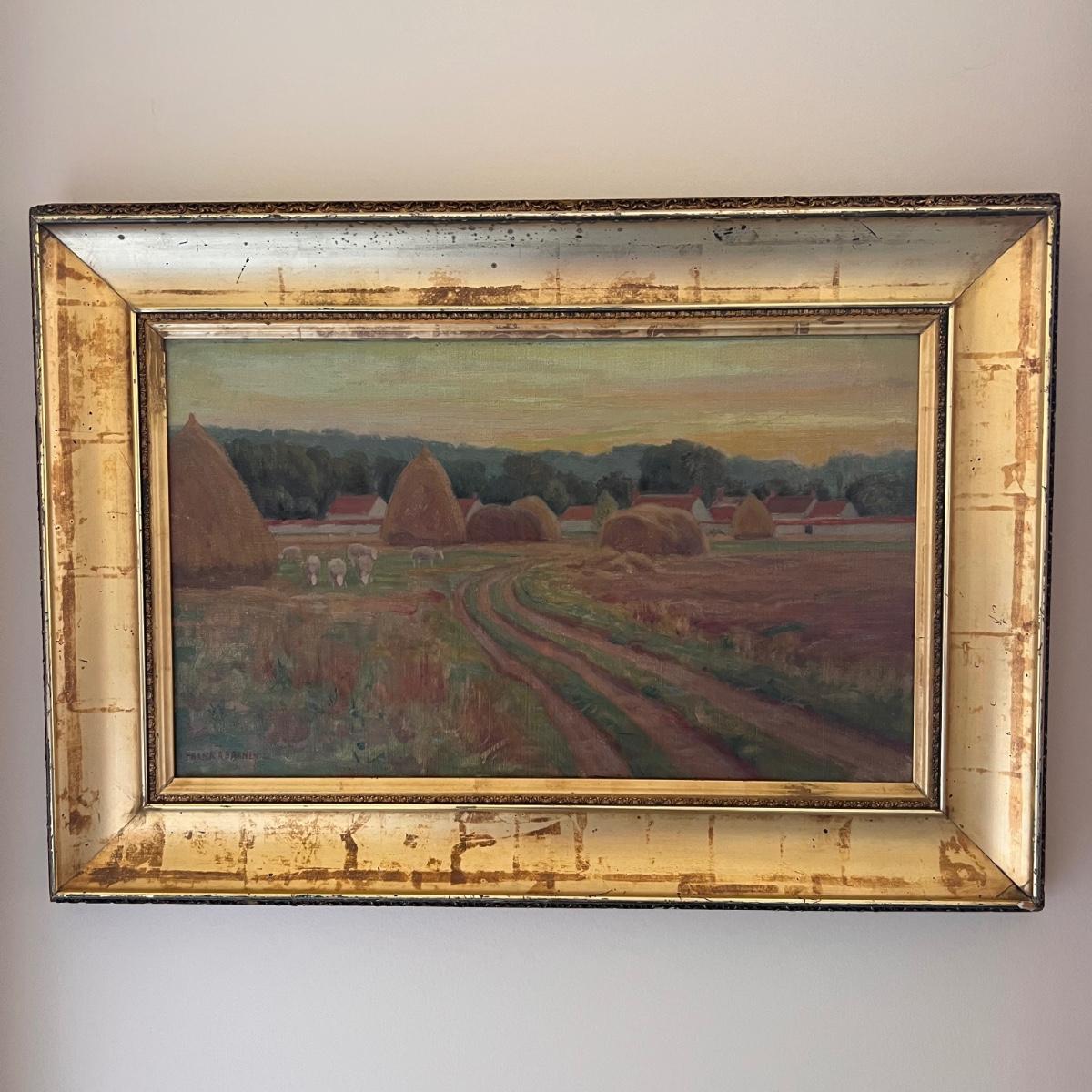 This painting of an haystack field appears to be an oil on canvas and is signed Frank A. Barney. It is mounted (not under glass) in an ornate gilded wood frame. Please note a couple of small chips in the frame, see pics.