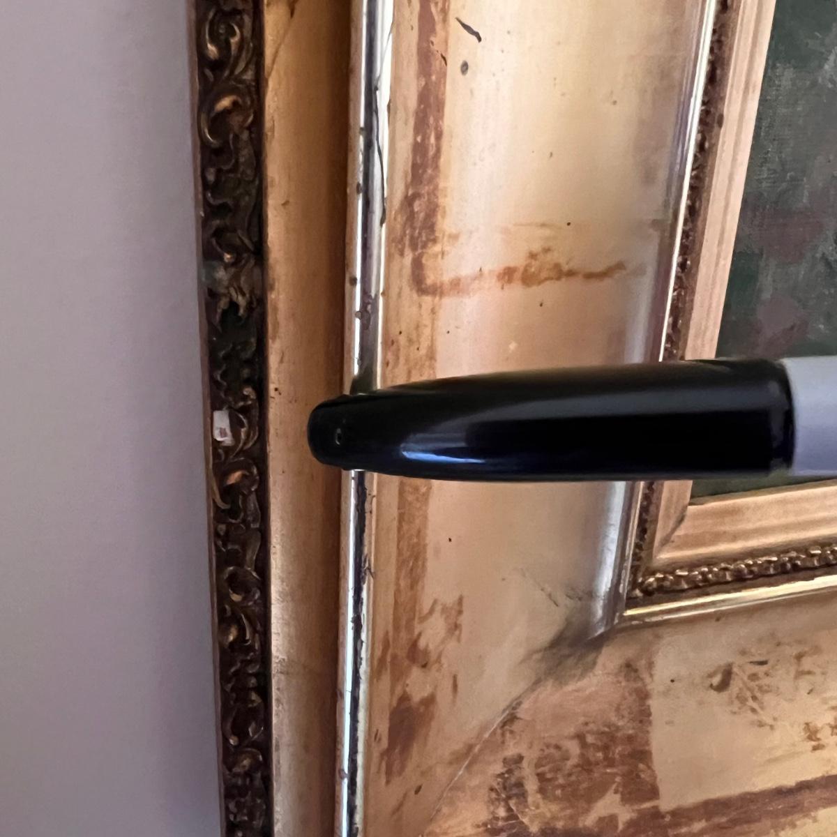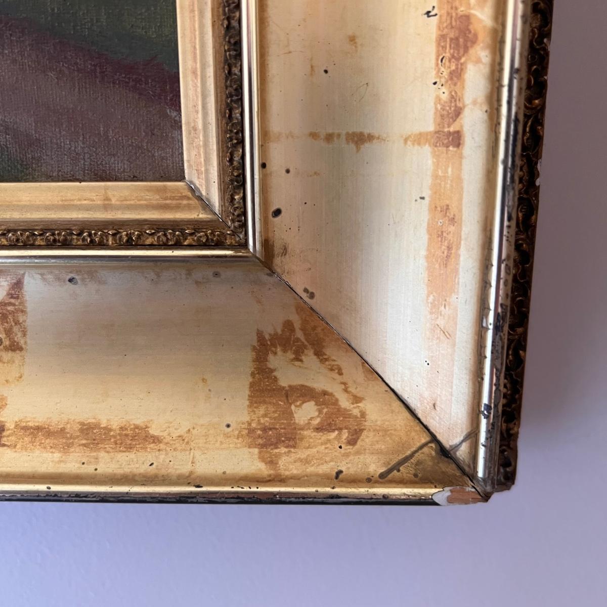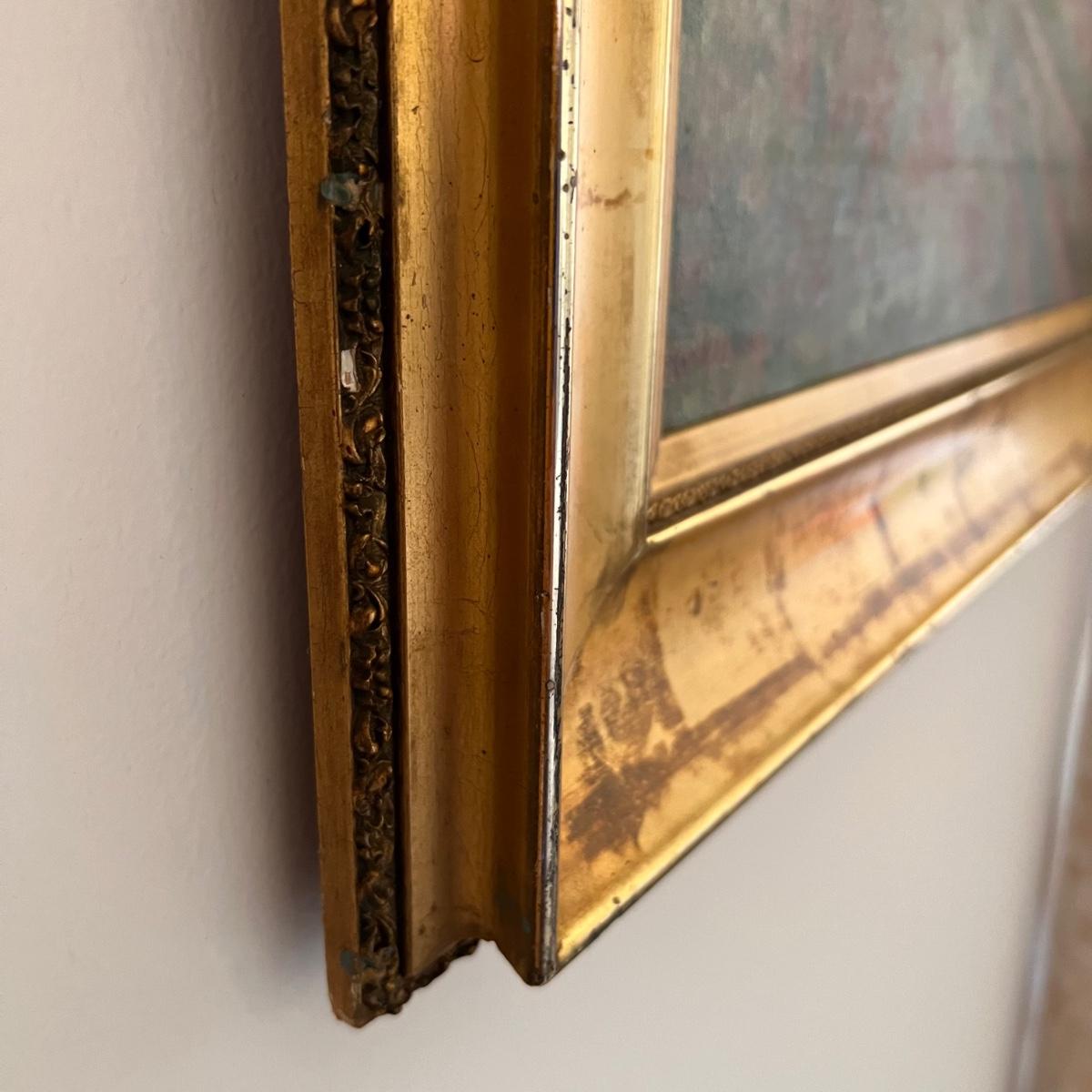 This painting of an haystack field appears to be an oil on canvas and is signed Frank A. Barney. It is mounted (not under glass) in an ornate gilded wood frame. Please note a couple of small chips in the frame, see pics.