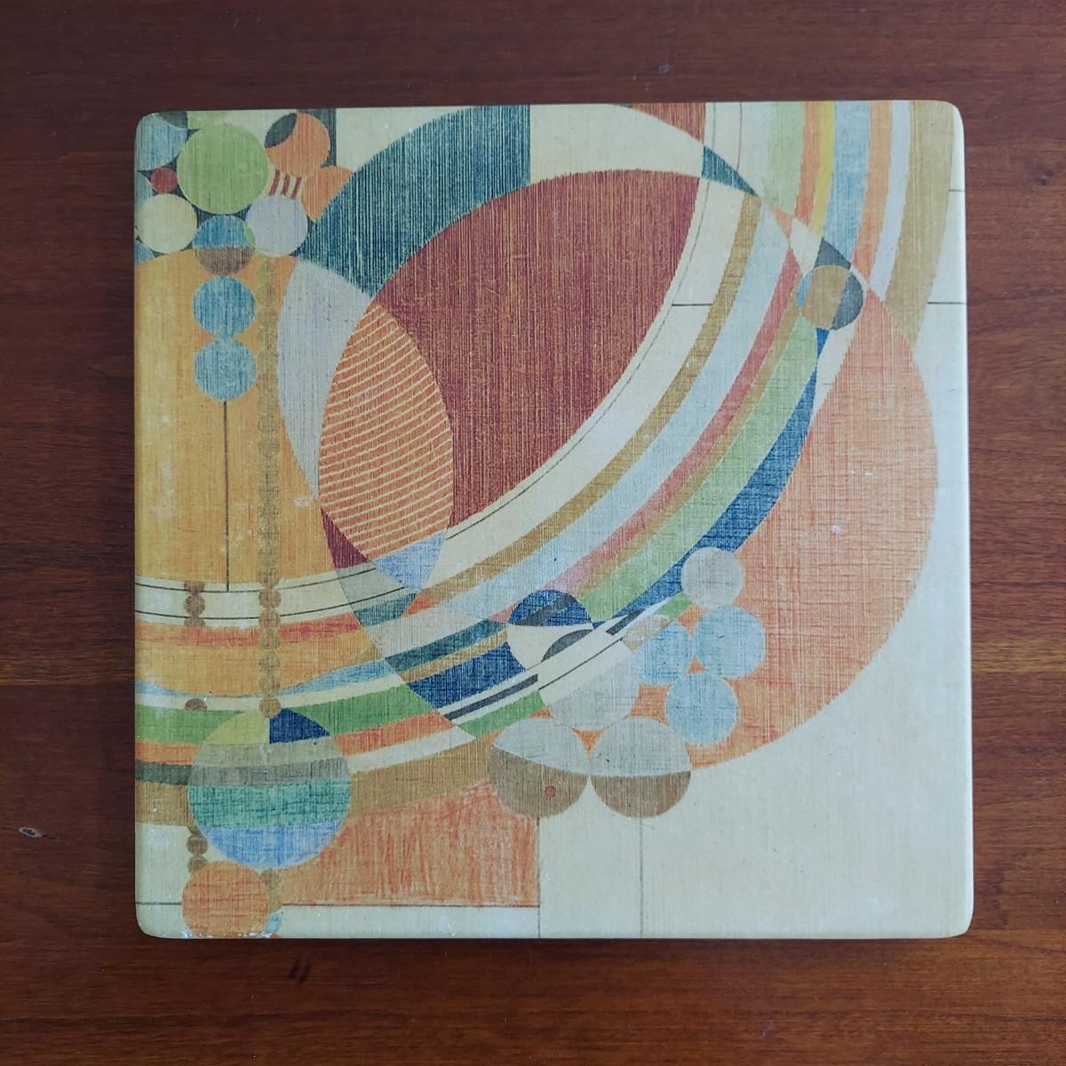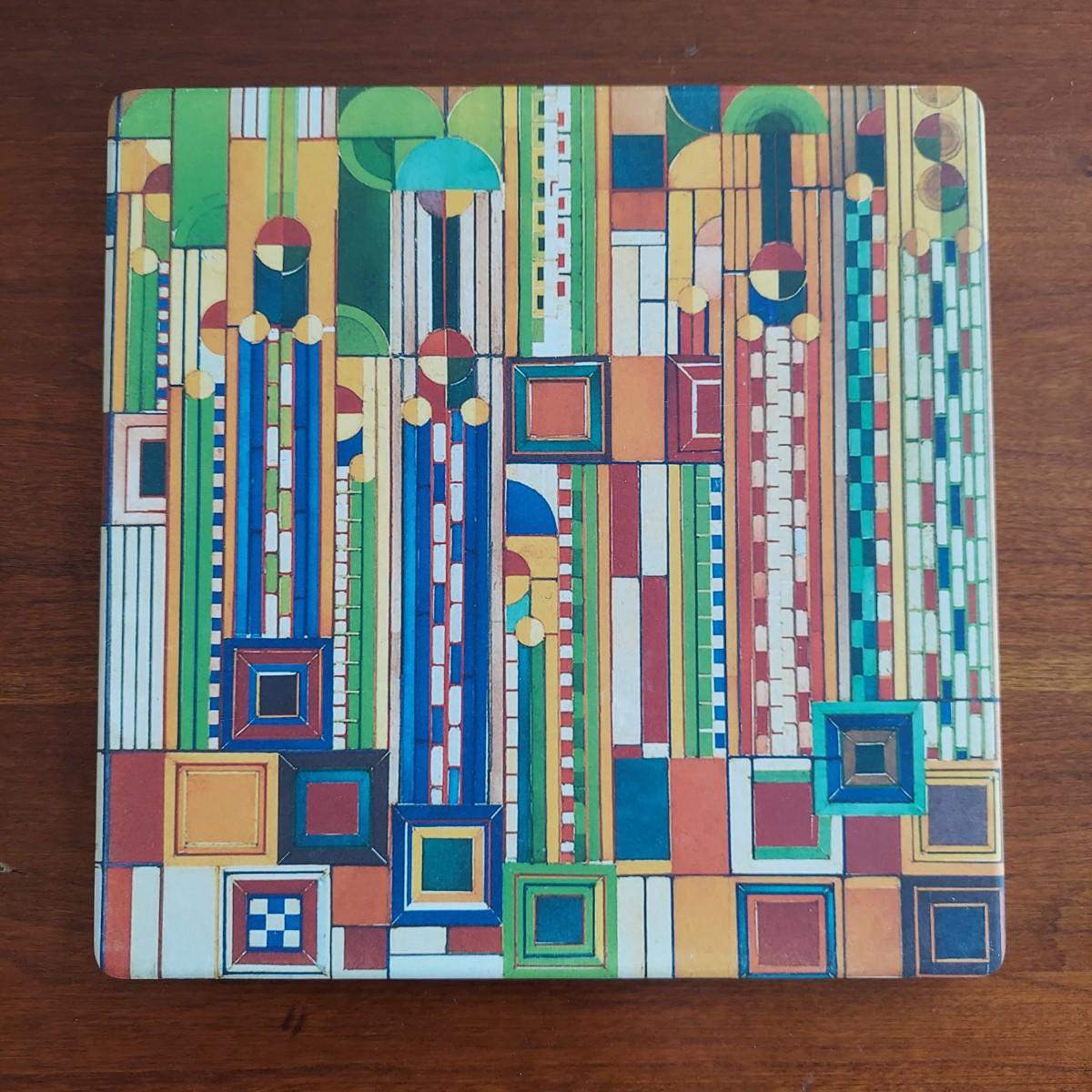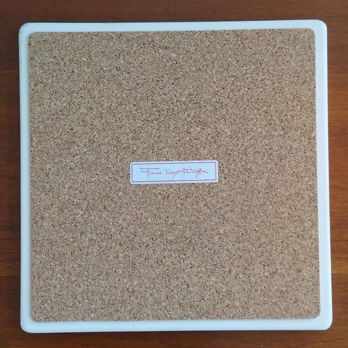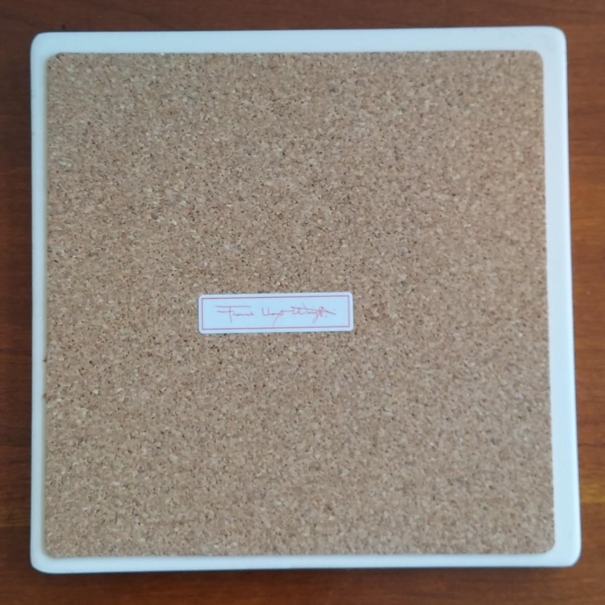 Lot contains two Frank Lloyd Wright tiles with cork back and a coffee table book. Tiles measure 7"SQ. Please see photos for details. Shipping available
