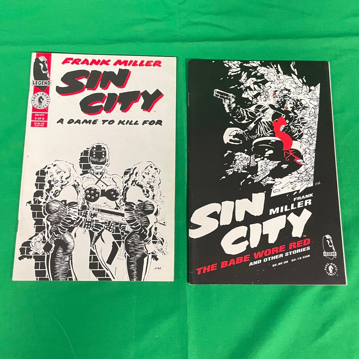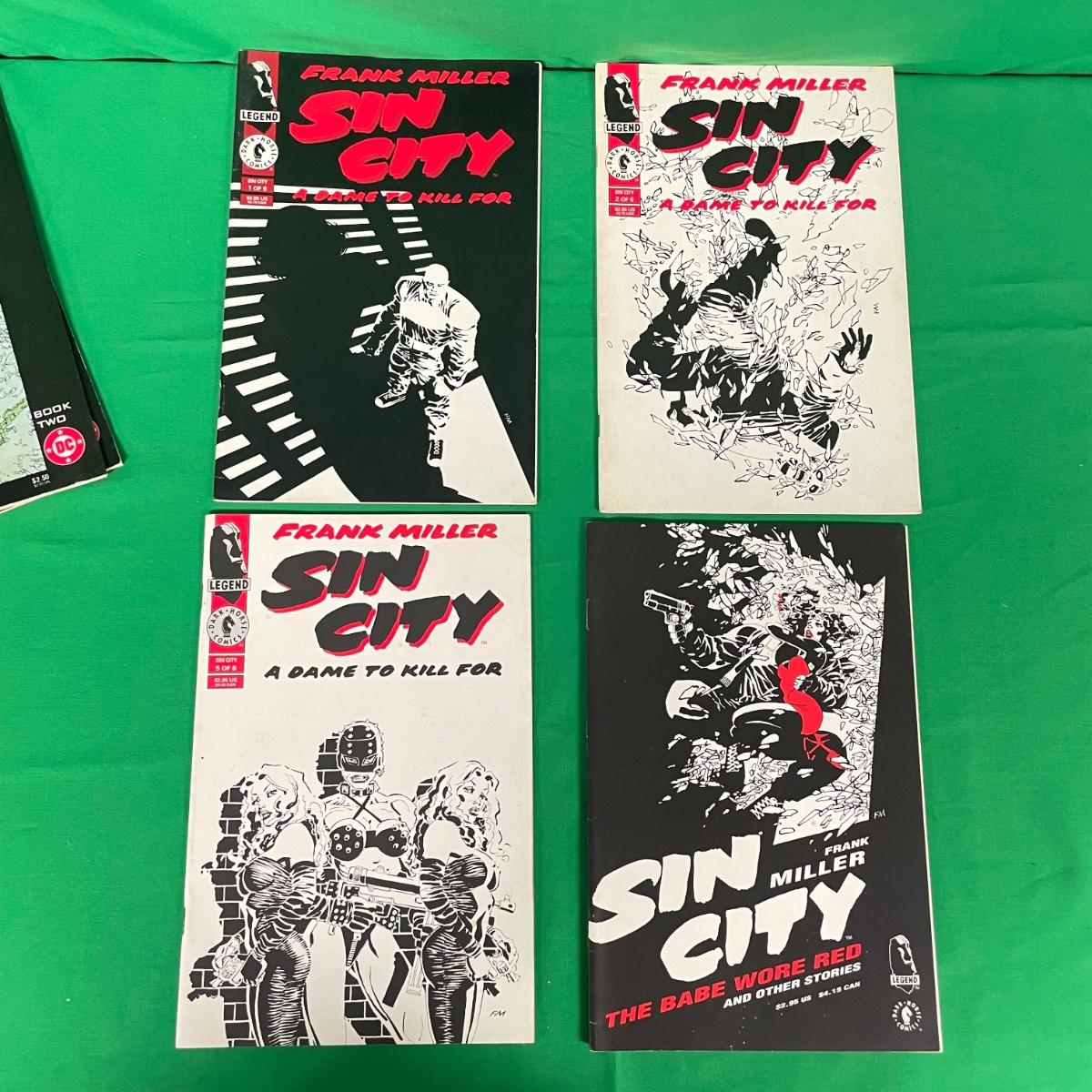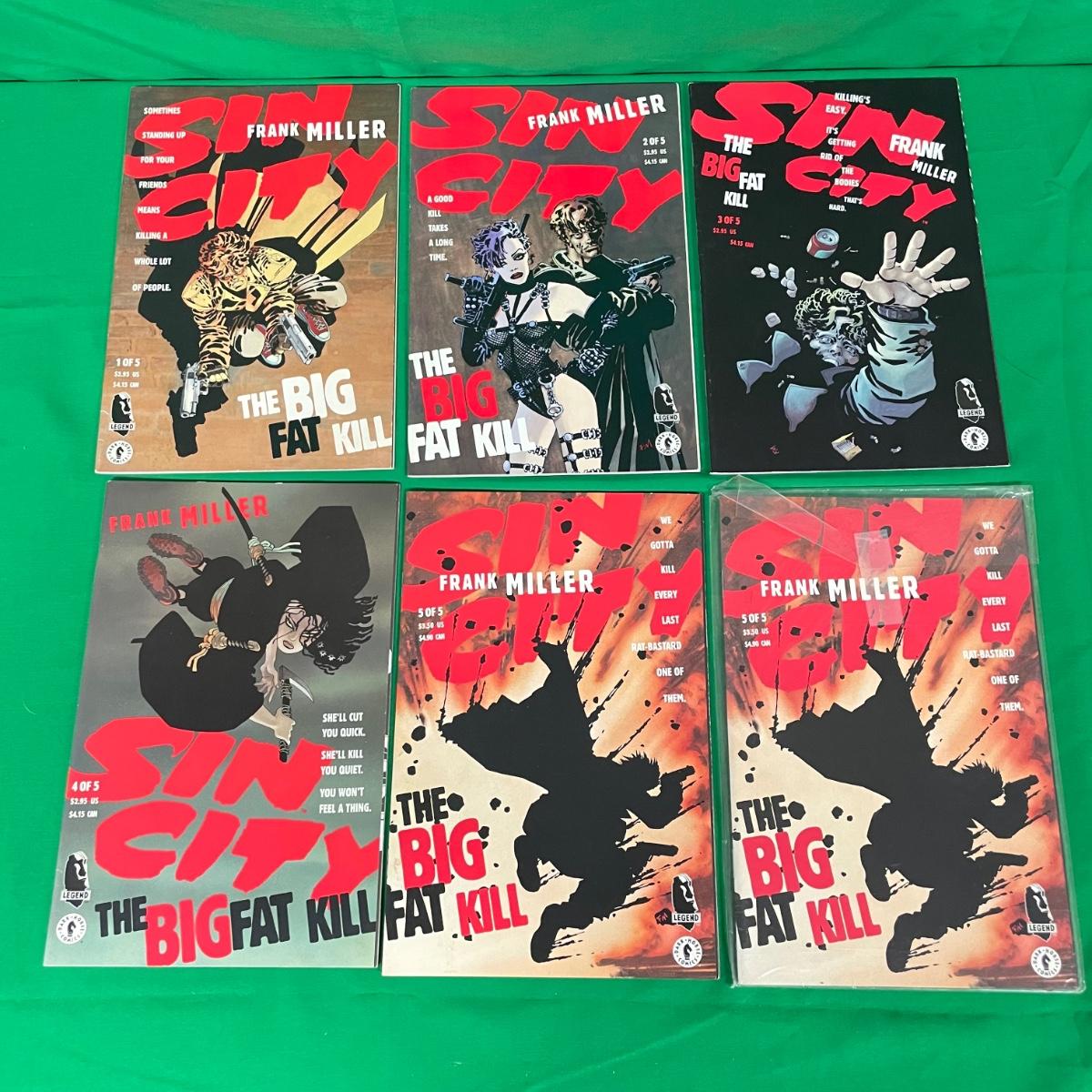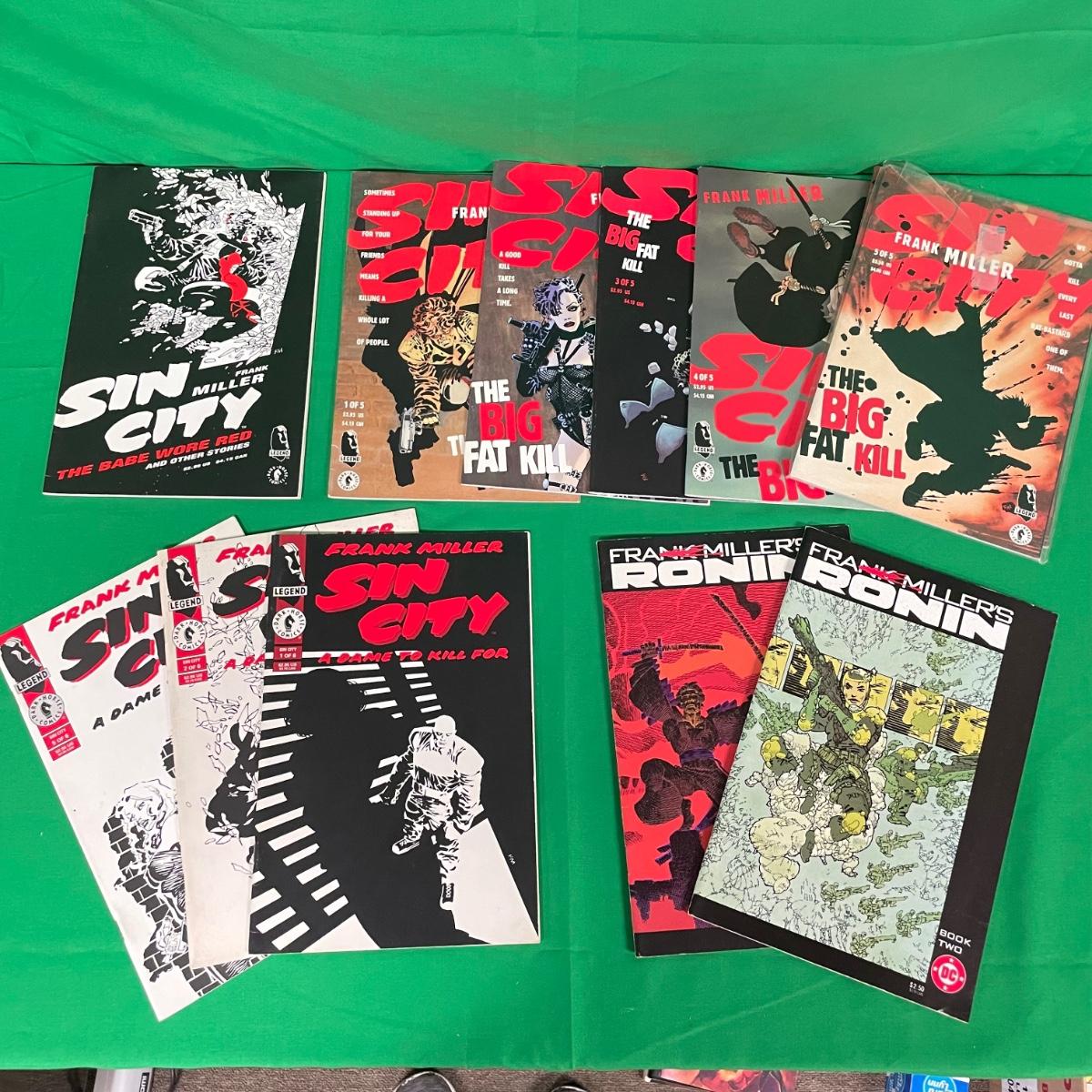 Complete set 1-5 of Frank Miller’s Sin City The Big Fat Kill with a second copy of volume 5 in plastic protection. Volumes 1, 2, 5 of Sin City A Dame to Kill For, 1994’s Sin City The Babe Wore Red and Other Stories. Lot also features books one and two of Frank Miller’s 1983 Ronin. See images. Items are sold as-is. No returns or refunds. Please bid accordingly.