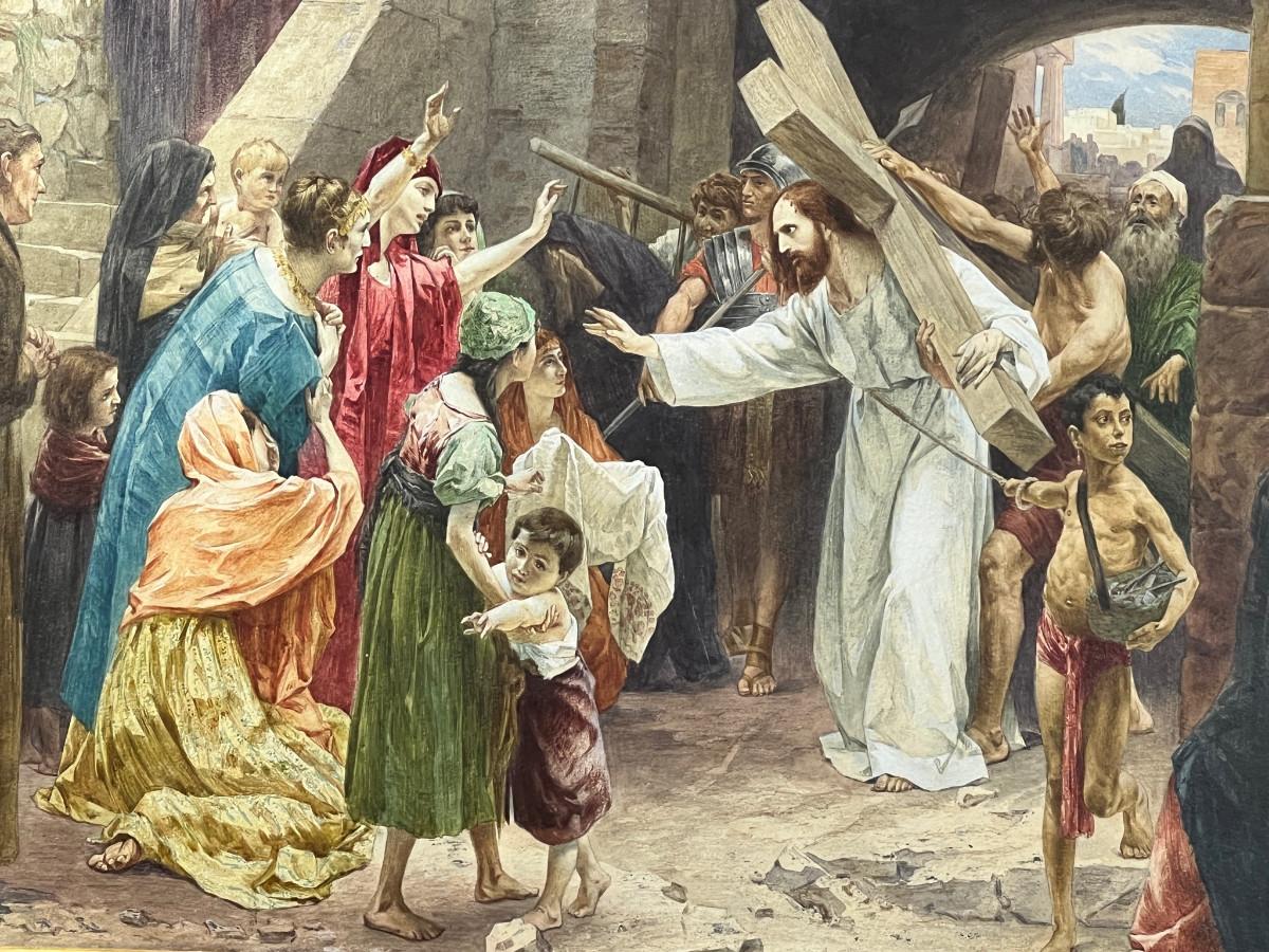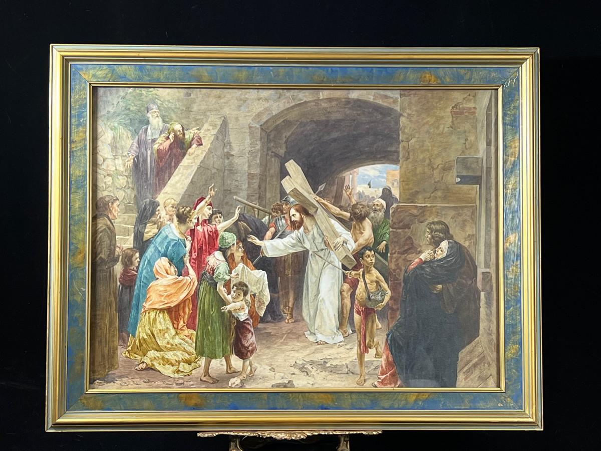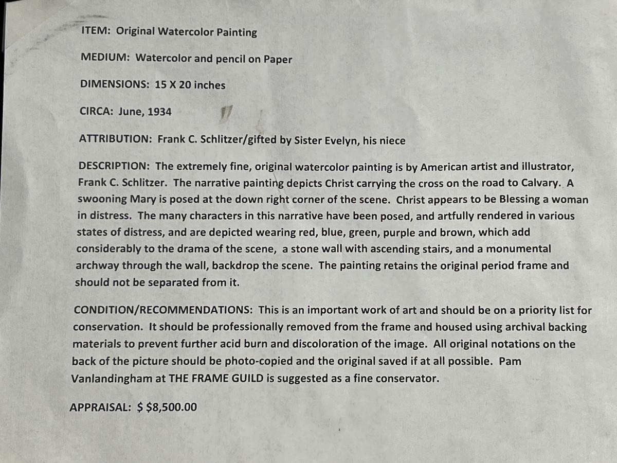 DESCRIPTION: The extremely fine, original watercolor painting is by American artist and illustrator, Frank C. Schlitzer. The narrative painting depicts Christ carrying the cross on the road to Calvary. A swooning Mary is posed at the down right corner of the scene. Christ appears to be Blessing a woman in distress. The many characters in this narrative have been posed, and artfully rendered in various states of distress, and are depicted wearing red, blue, green, purple and brown, which add considerably to the drama of the scene, a stone wall with ascending stairs, and a monumental archway through the wall, backdrop the scene. The painting retains the original period frame and should not be separated from it.