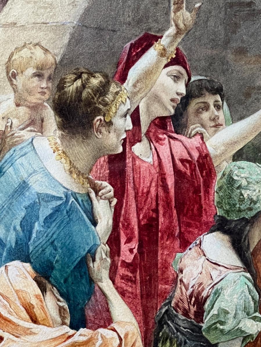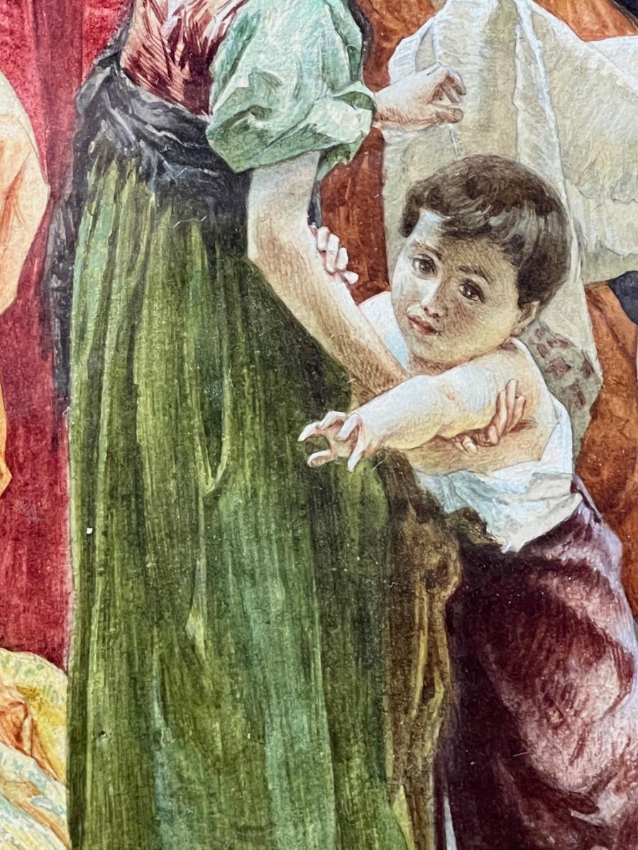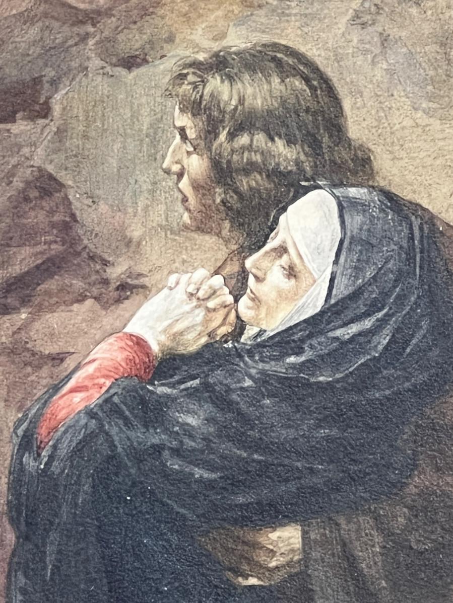 DESCRIPTION: The extremely fine, original watercolor painting is by American artist and illustrator, Frank C. Schlitzer. The narrative painting depicts Christ carrying the cross on the road to Calvary. A swooning Mary is posed at the down right corner of the scene. Christ appears to be Blessing a woman in distress. The many characters in this narrative have been posed, and artfully rendered in various states of distress, and are depicted wearing red, blue, green, purple and brown, which add considerably to the drama of the scene, a stone wall with ascending stairs, and a monumental archway through the wall, backdrop the scene. The painting retains the original period frame and should not be separated from it.