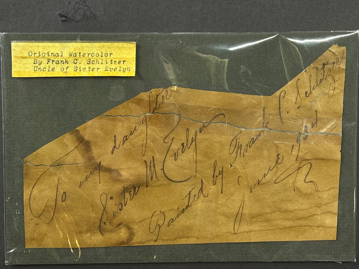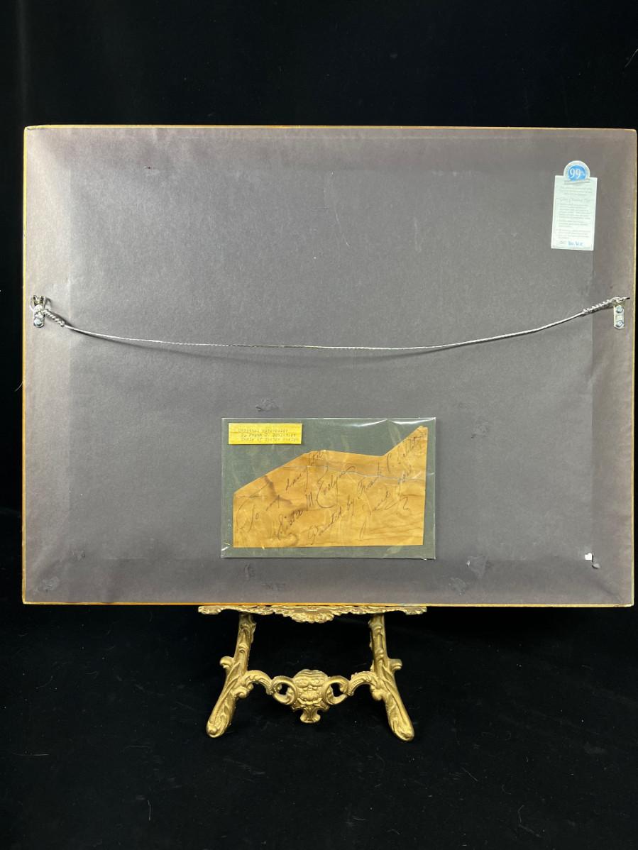 CONDITION/RECOMMENDATIONS: This is an important work of art and should be on a priority list for conservation. It should be professionally removed from the frame and housed using archival backing materials. All original notations on the back of the picture should be photo-copied and the original saved if at all possible.
